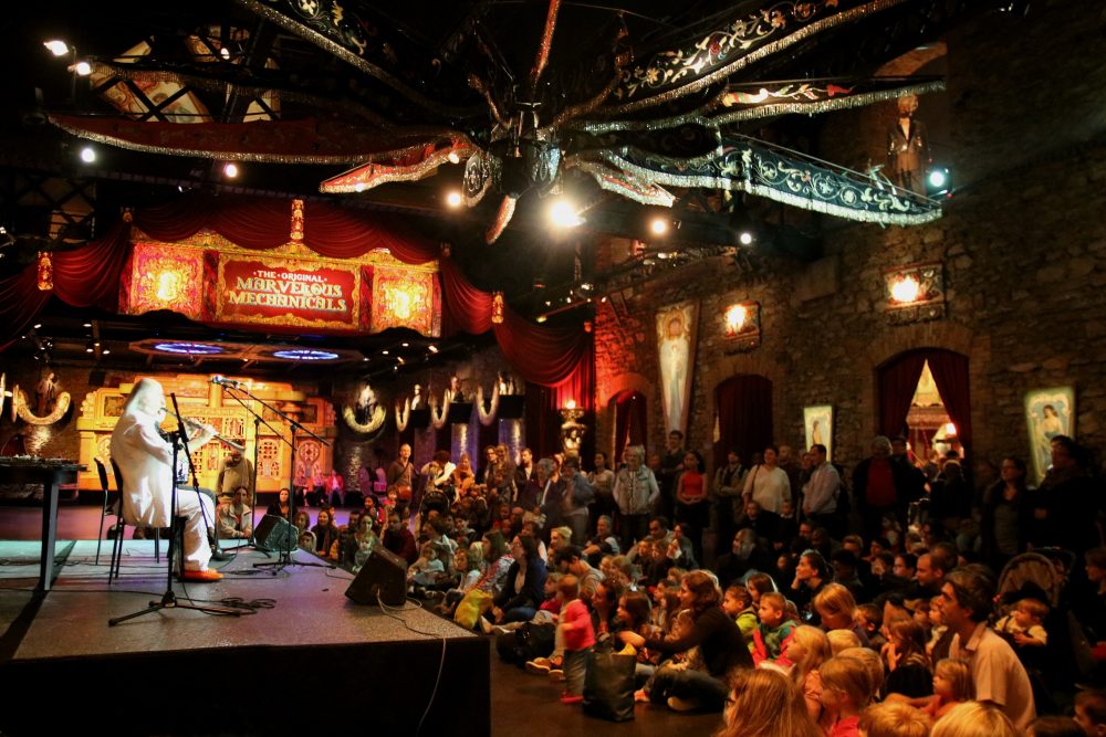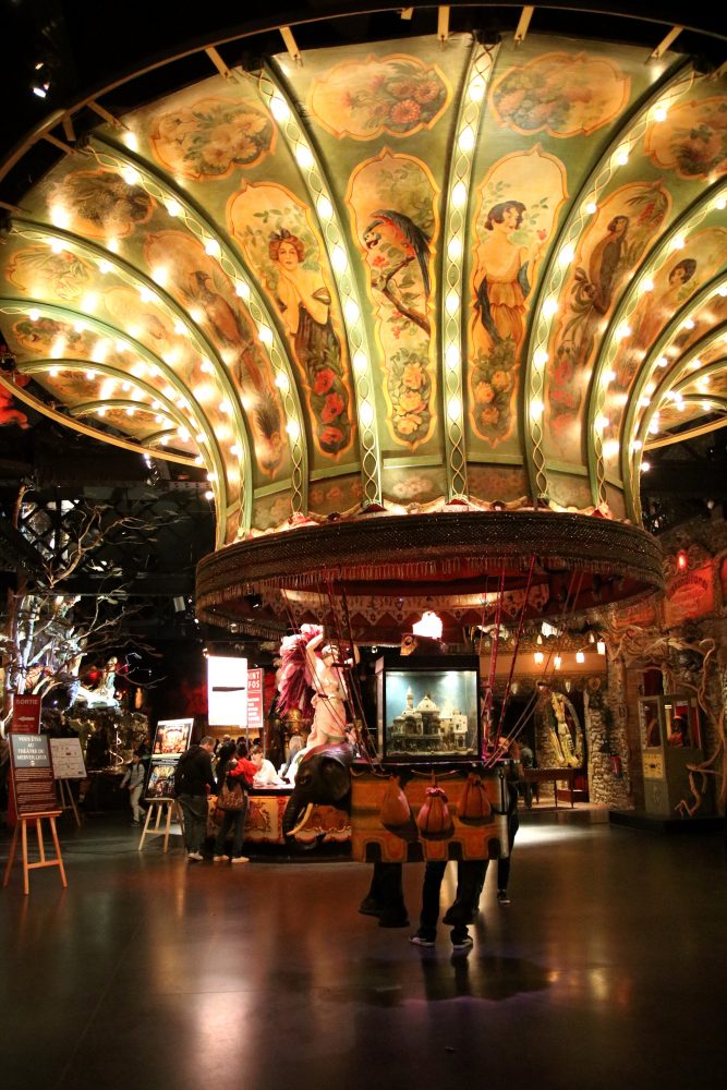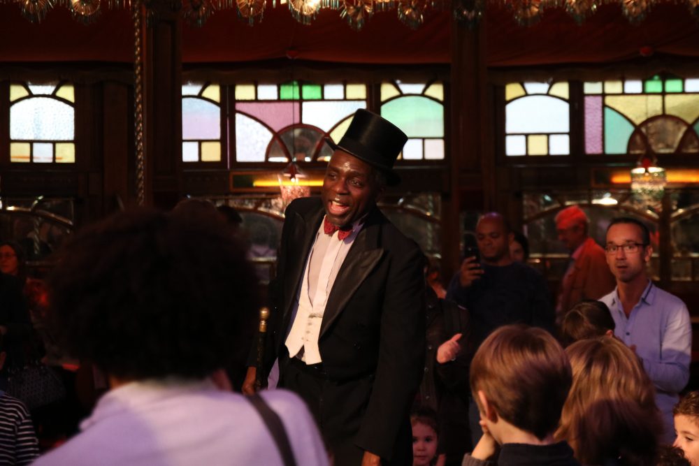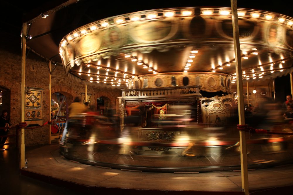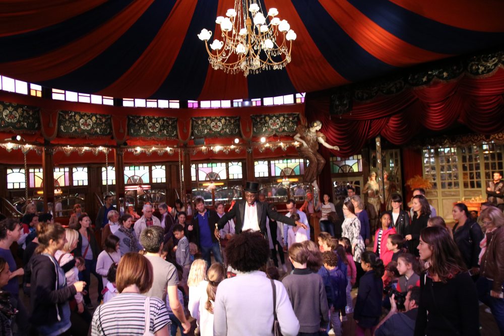 Le grand portail des anciennes halles aux vins est tout juste franchi quand les premiers rires se font entendre. Ils sont bientôt rejoints par le grondement d’un manège, les notes d’une clarinette et la clameur des marchands. Le musée des arts forains se dévoilent enfin derrière un rideau rouge et un éléphant volant se trouve là pour nous accueillir. Dans la pièce voisine, un clown clarinettiste ensorcèle petits et grands regroupés dans le Théâtre du Merveilleux.