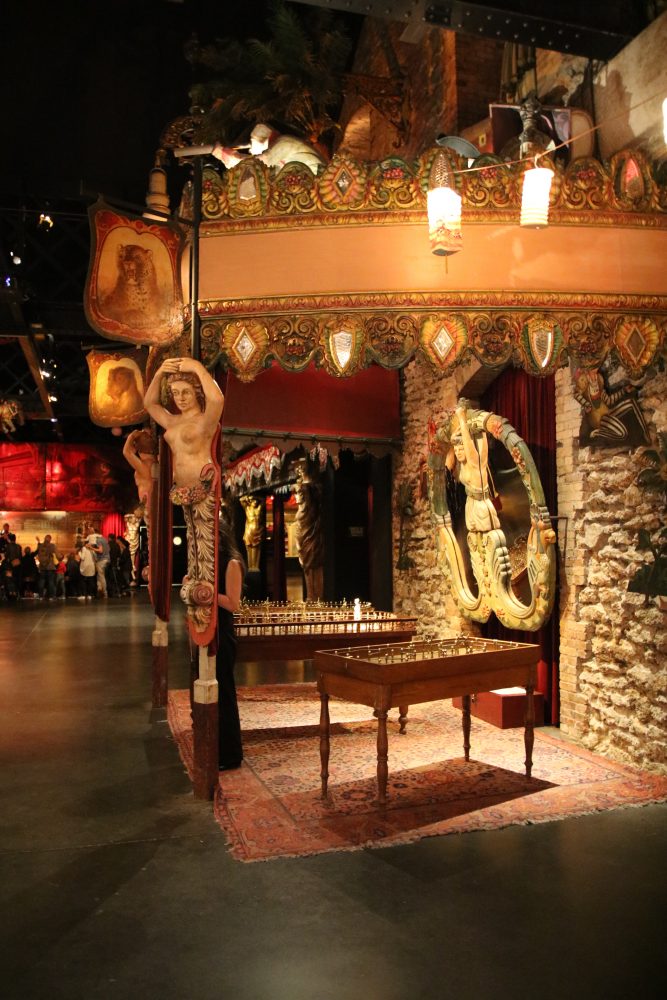 Les billes roulent sur des jeux d’un autre âge, les toupies s’affolent entre des rails dorés et les chevaux de bois galopent. Les visiteurs se pressent pour remporter une course des garçons de café et décrocher des tickets de jeu supplémentaires. Chaque décor est soigné et possède son propre caractère: les halles représentent tour à tour une ancienne fête foraine, un salon vénitien ou une salle de bal.