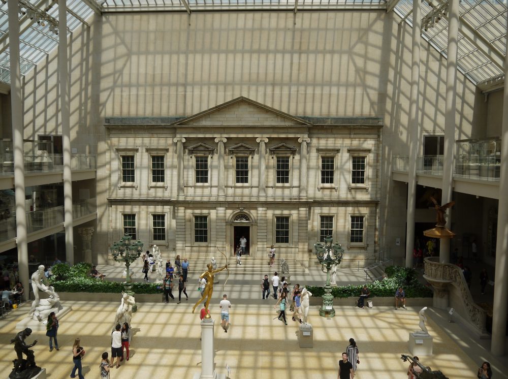 On y circule avec émerveillement entre les galeries d’art primitif ou d’art égyptien (dont le fameux Temple de Dendur) et dans les couloirs couverts de peintures européennes. Certaines salles sont baignées de lumière extérieure comme la superbe Charles Engelhard Court ou le couloir des sculptures romaines d’un blanc immaculé. Après avoir cherché un moment l’ascenseur (seul moyen de grimper jusqu’à la terrasse), nous voilà au 5ème étage du musée transformé en rooftop qui offre une vue dégagée sur la skyline de l’ouest et le sud de Manhattan.