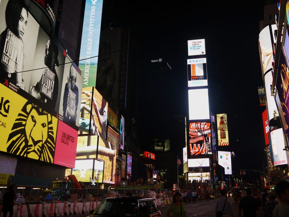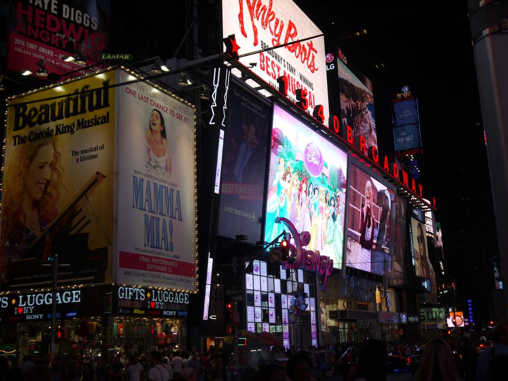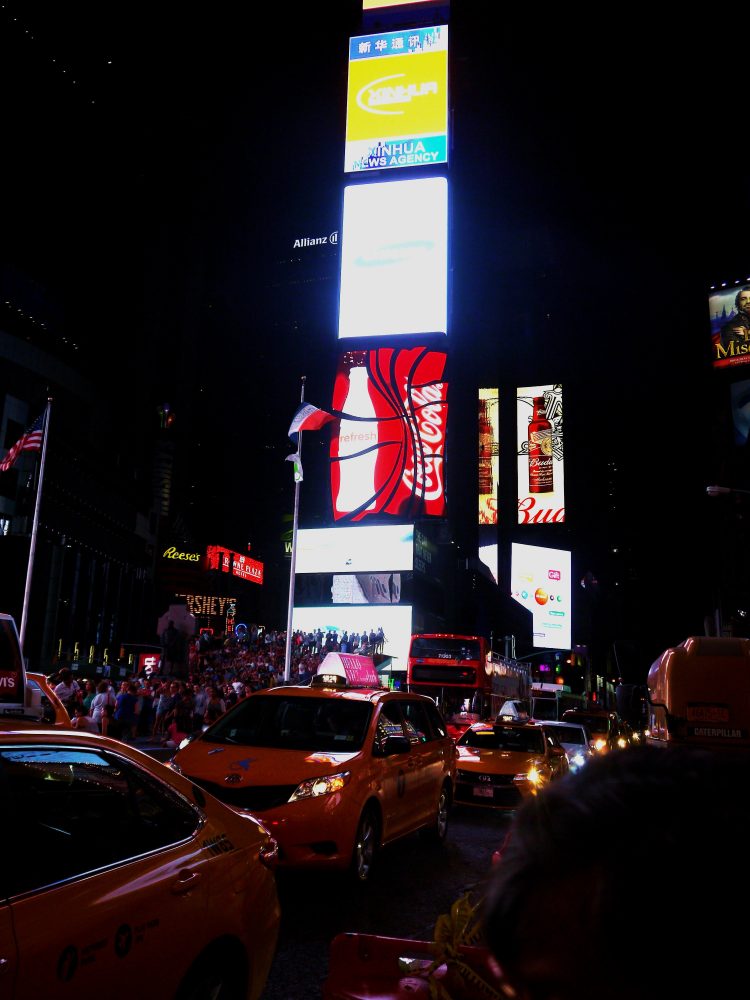 A l’approche de l’intersection de Broadway et de la 7th avenue, les lumières de Times Square éclairent déjà les rues parallèles. Publicités géantes pour les comédies musicales, panneaux lumineux, frénésie de taxis jaunes, de passants… et de personnages de cinéma. On croise en effet quelques Mignons et Captain America ainsi qu’un nombre improbable de faux SpiderMan se suspendant aux lampadaires au coin des rues…