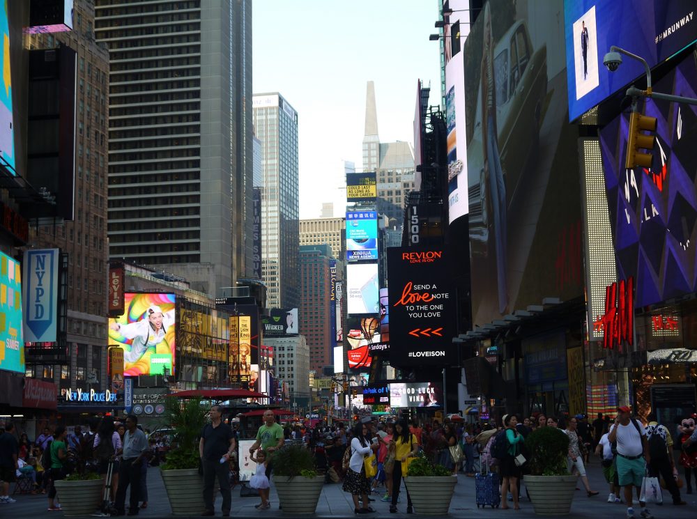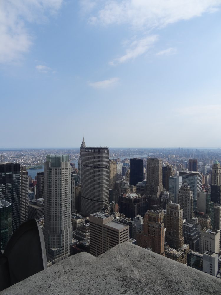 Étape New-yorkaise incontournable, nous voilà arrivés au Rockfeller Center après quelques détours. Un simple trajet en ascenseur nous emmène sur le Top of The Rock pour découvrir une plate-forme d’observation à la vue spectaculaire. Du haut de ces 70 étages, on devine les silhouettes du Chrysler et de l’Empire State Building qui se détachent de la skyline. La statue de la liberté se fond dans la brume de l’Hudson et parait minuscule à côté des tours vitrées de la City. De l’autre côté, l’immense rectangle de verdure qu’est Central Park s’étend à nos pieds. On profite du panorama un long moment tout en repérant les quartiers déjà traversés ou les terrasses aménagées en jardin et restaurant.