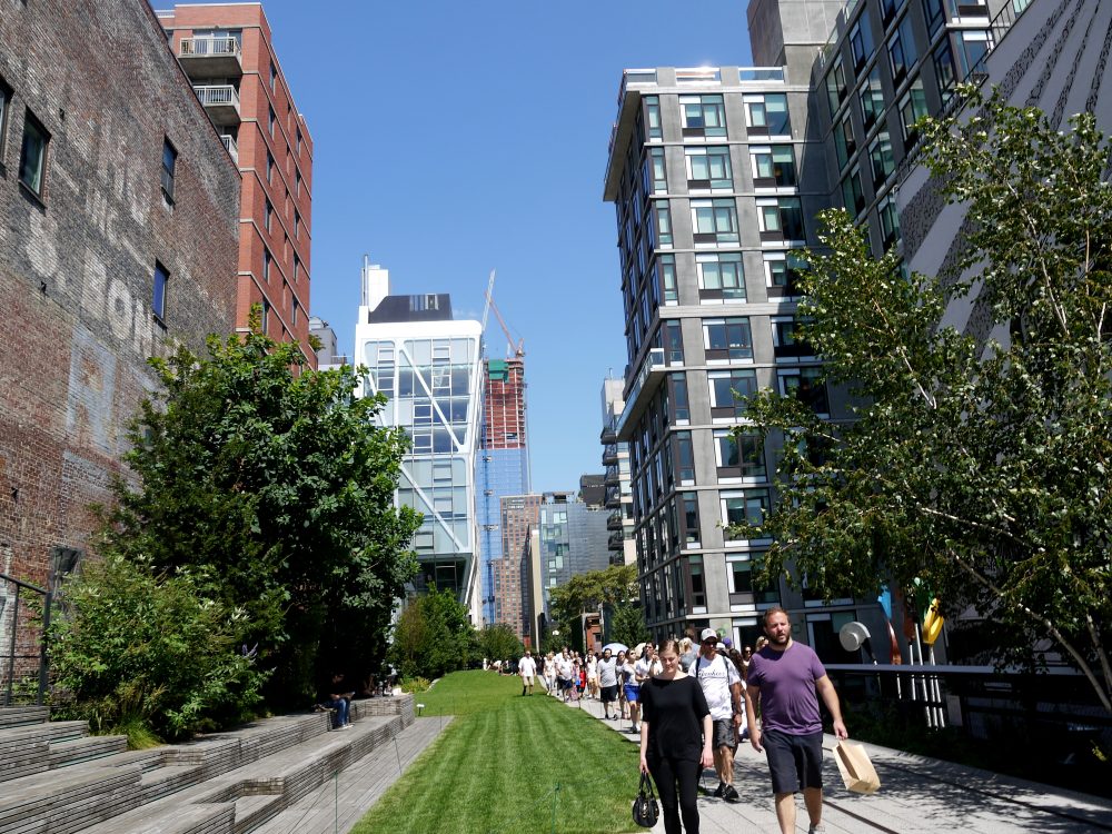 Quelques stations de métro plus tard, nous découvrons la High Line, ancienne voie ferrée aérienne aujourd’hui transformée en parc suspendu depuis 2009. Sur le même modèle que la coulée verte parisienne, elle traverse le Meatpacking district et Chelsea sur un peu plus de 2km. Avec son théâtre urbain, ses amateurs de yoga ou ses locaux lézardant sur des transats de bois, on goûte à une atmosphère paisible tout au long de la balade. L’occasion d’observer une exposition d’art temporaire pleine de charme après la déception du MOMA.