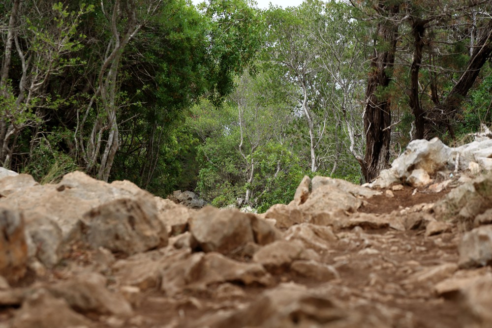 La pente du sentier s’adoucit assez rapidement mais il reste largement occupé par la pierre. Le ciel se dégage enfin et la balade prend des couleurs. On suit le relief des falaises en n’apercevant que de temps à autre la mer entre les arbres. Le chemin est trompeur et nous perdons un peu la notion des distances… A chaque virage, on espère désespérément découvrir Cala Luna en contrebas.