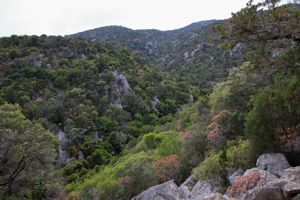 12 Mai 2017. Après une journée au milieu des roches la veille, nous reprenons ce matin la route vers Dorgali. Quelques champs de coquelicots colorent parfois le paysage montagneux que nous avions déjà aimé la première fois. Avant de gagner la mer, il faut emprunter la SP26 et traverser la montagne via un tunnel avant d’aboutir dans une pinède un peu brumeuse.