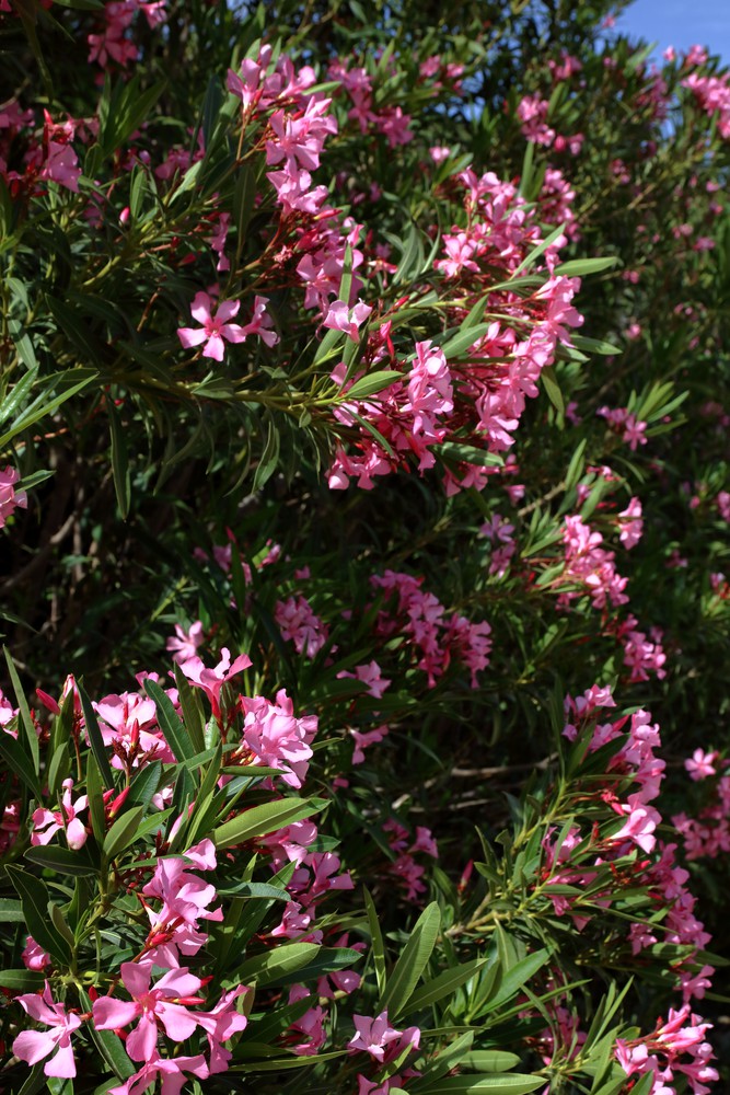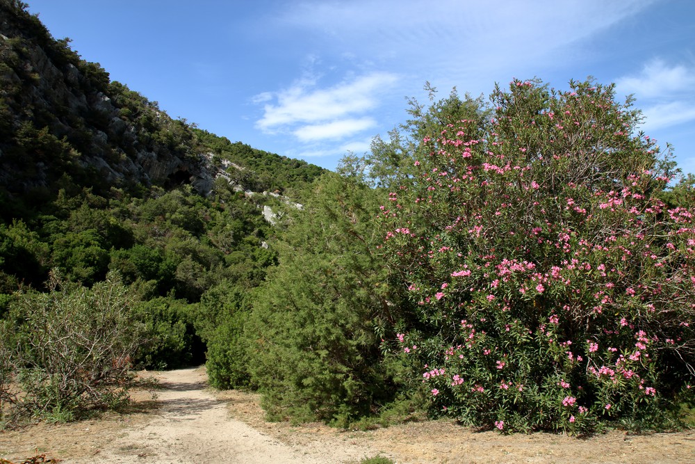 Quelques mètres de descente un peu raide font leur apparition. Des poignées de métal ont d’ailleurs été installées ici et là pour aider à les traverser. Une dernière montée et enfin, alors que l’on n’y croyait presque plus, Cala Luna apparait sous un soleil radieux. Gagnés par l’enthousiasme, on se laisserait presque aller à courir si le chemin n’était pas si tortueux. En sortant du petit bois, enfin au niveau de la mer, une nouvelle surprise nous attend. Une forêt de lauriers roses en fleurs s’est installée dans le sable, créant une sorte labyrinthe jusqu’à la plage.