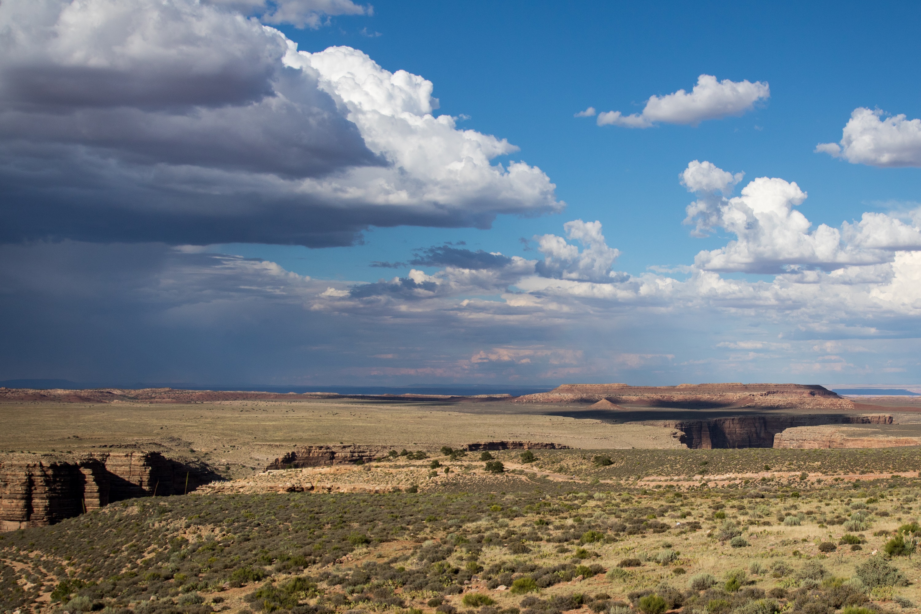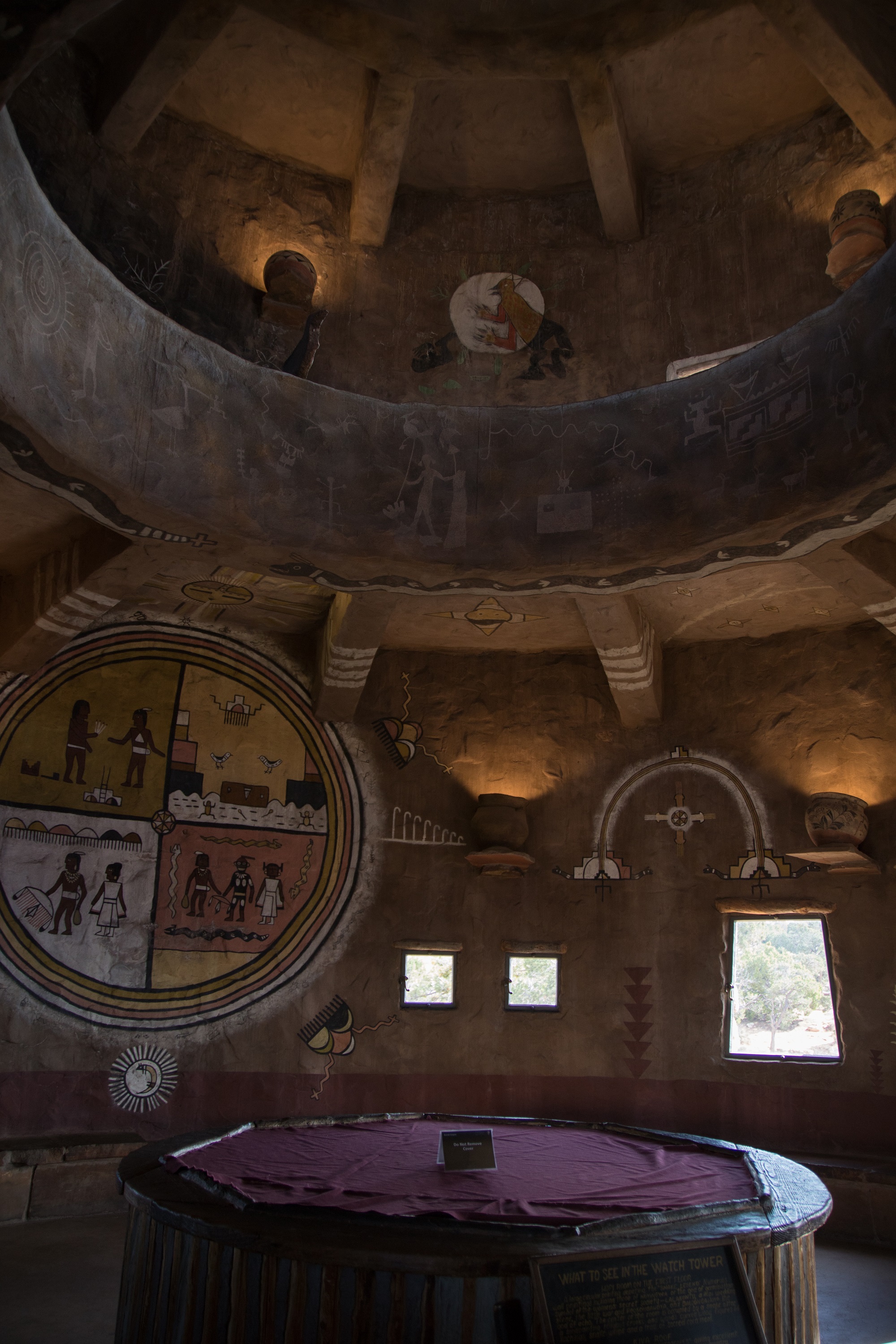 A l’approche du village, les visiteurs s’amoncellent à nouveau autour du market. On y fait nous aussi escale pour le déjeuner avant de repartir vers les voitures, finalement un peu déçus de ne pas avoir été renversés par la vue. Avant de rejoindre Monument Valley, on opte néanmoins pour un nouvel arrêt sur les rives du Grand Canyon, coté Est cette fois. La Desert View Watchtower, construite selon une architecture inspirée par les indiens, s’élève toute en pierre au bord du gouffre. L’intérieur est peint de multiples fresques qui s’envolent jusqu’au sommet. Avec ses 21 mètres de haut, la tour d’observation offre une vue sur une bonne partie du parc et sur les Vermilion Cliffs au Nord. Marquant la fin de notre visite, cette halte aura sans doute été la plus séduisante du parc.