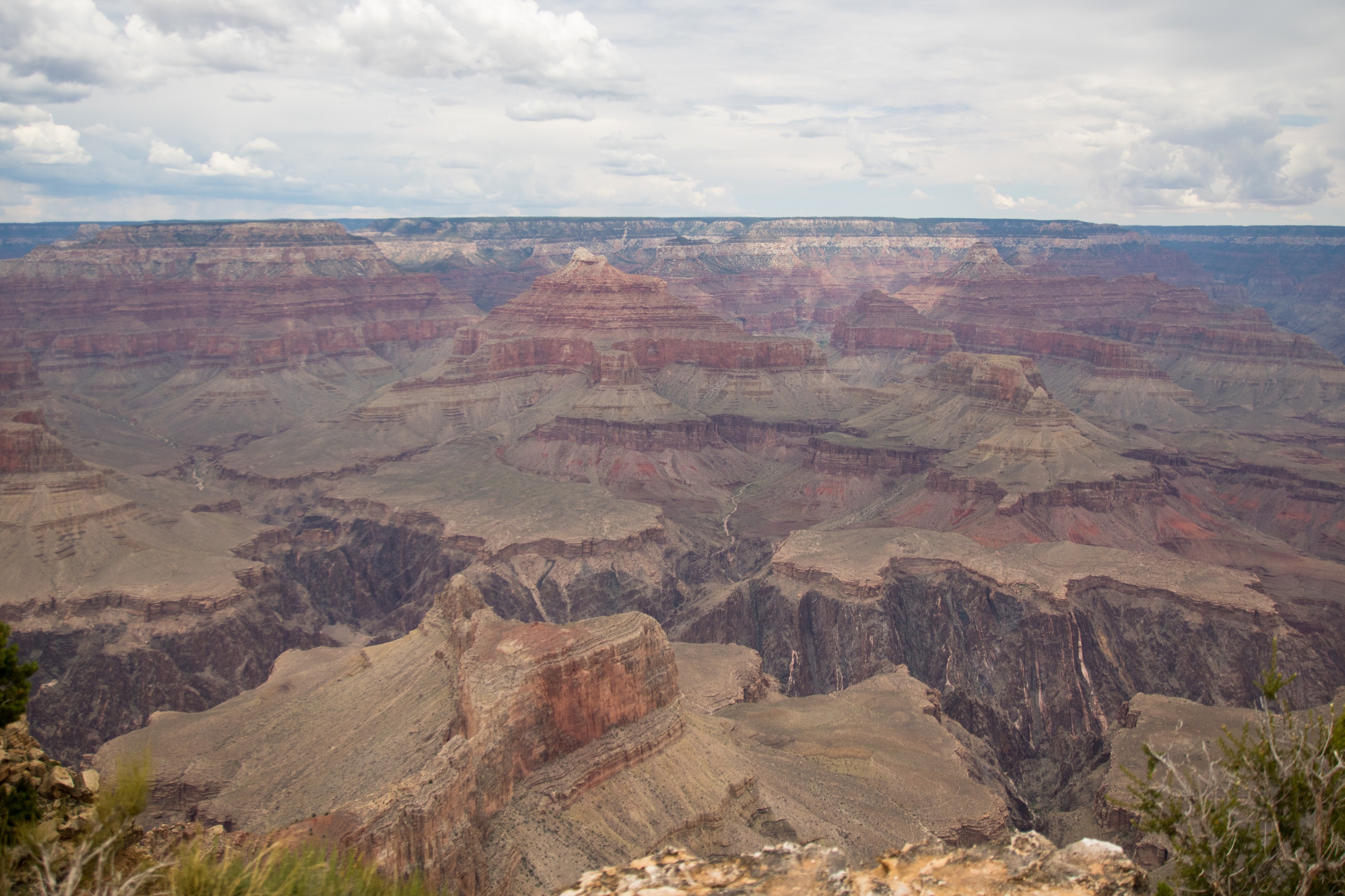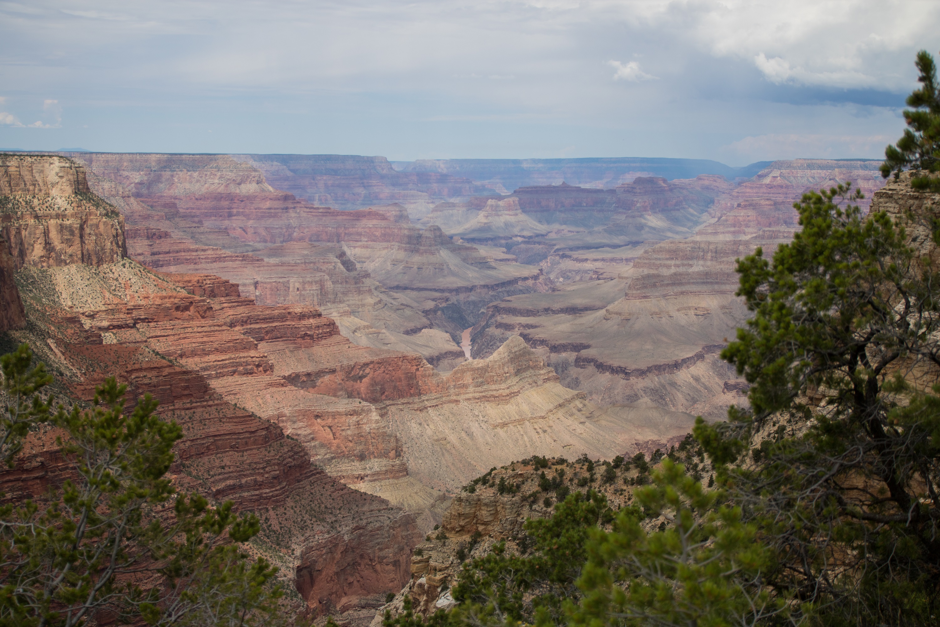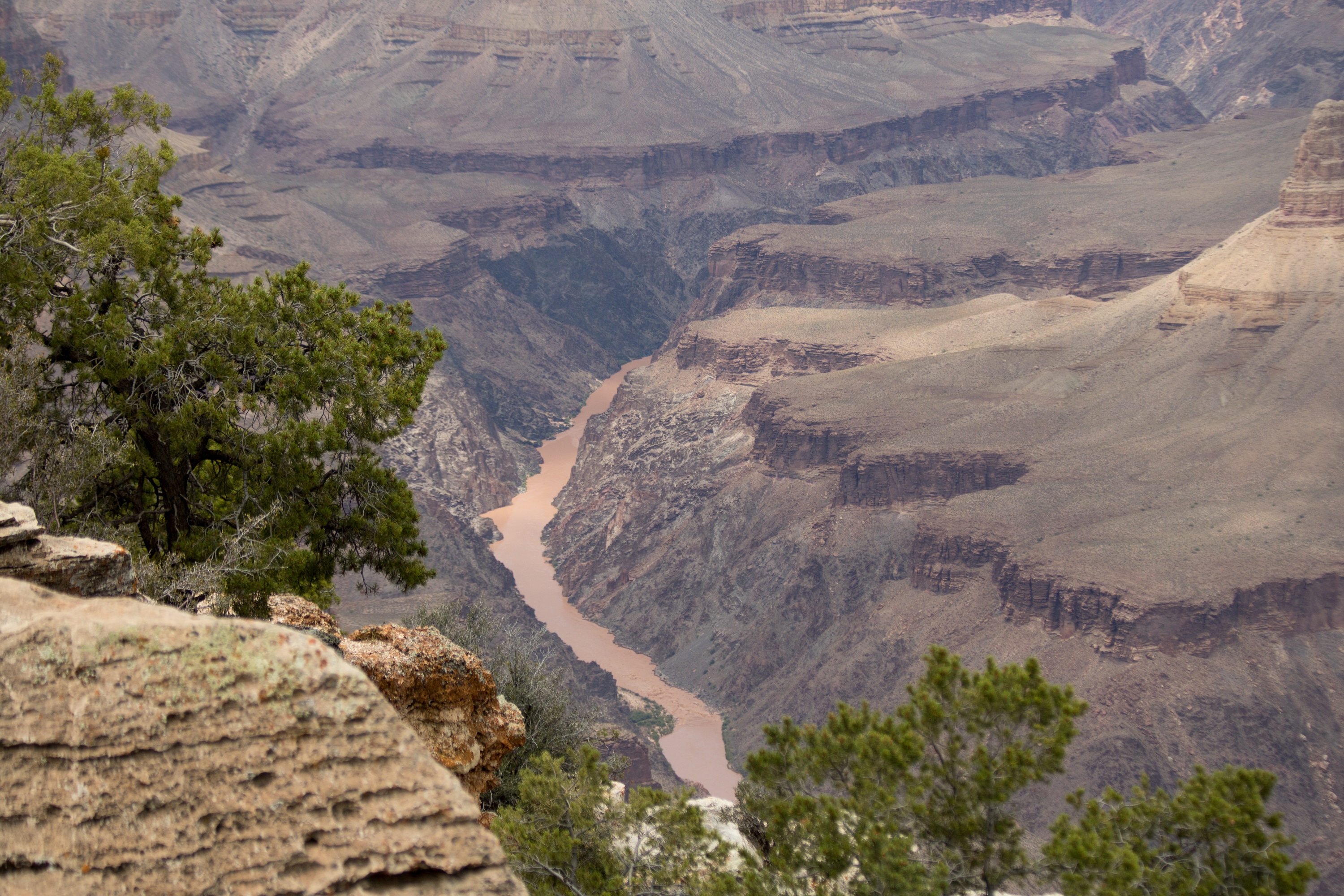 A l’ouest de la rive, le canyon est particulièrement profond et donne d’ailleurs son nom, The Abyss, a un des points de vue traversé. C’est aussi le secteur le moins fréquenté car il est le plus éloigné du village. On est finalement assez seul sur ce chemin très aménagé et partiellement ombragé qui longe, parfois de près, ces grandes falaises. En contrebas, les méandres du Colorado rougi par toutes les pluies des jours précédents apparaissent de temps à autre. Les vues se succèdent et se ressemblent finalement beaucoup jusqu’à Powell Point, un peu plus aménagé et qui semble avancer dans le vide. De là, on observe le Bright Angel Trail qui s’enfonce dans le canyon en zigzagant. Réputé comme particulièrement éprouvant, il apparait soudain bien plus attrayant que notre petit parcours de santé.
