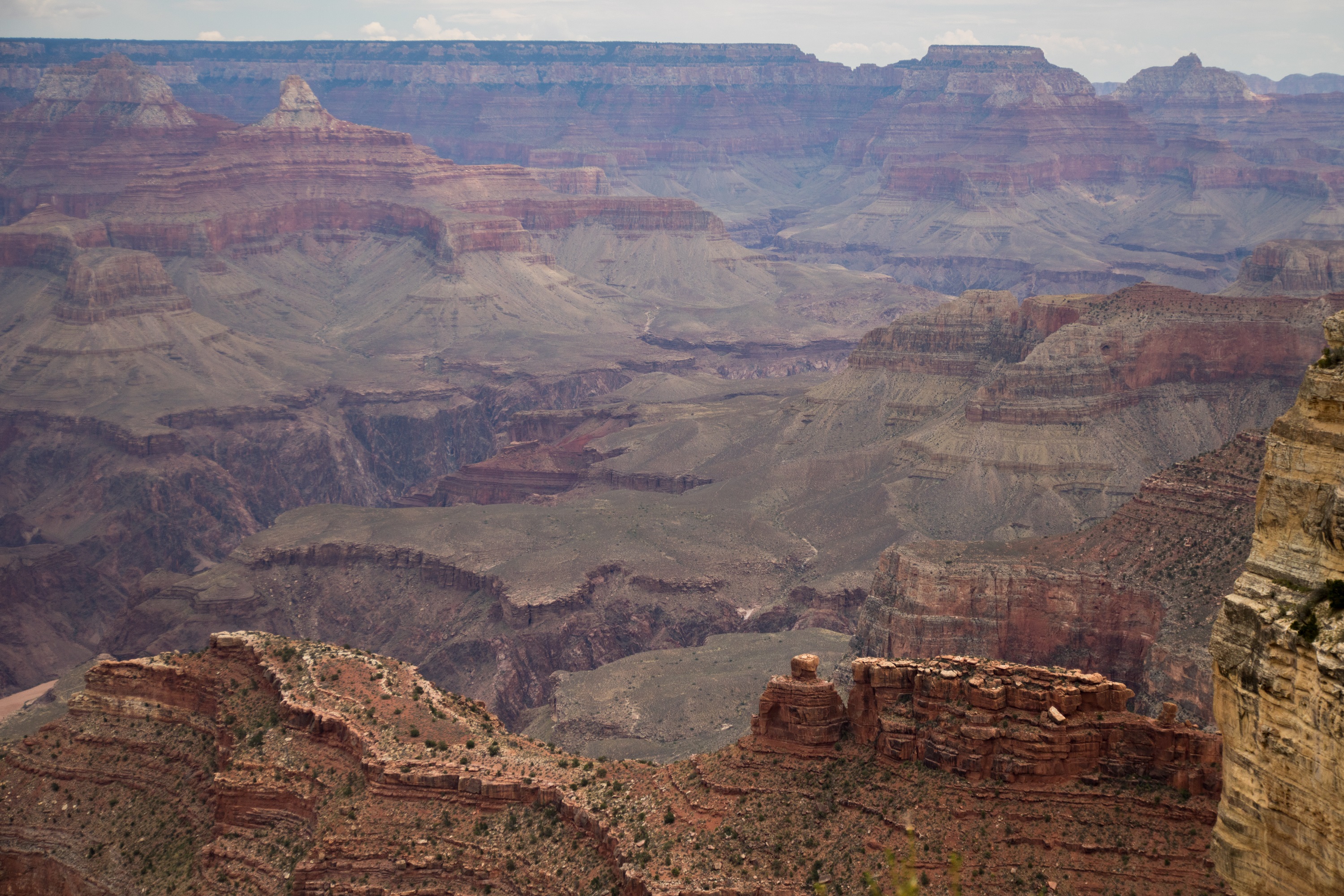Notre périple reprend un cours plus classique ce matin là. Loin des réserves indiennes perdues au milieu de nul part, nous voilà sur la très passante route vers le non moins célèbre Grand Canyon. Fort de son succès, le parc national a dû s’équiper en conséquence et l’entrée ressemble à une gare de péage où patientent les voitures… et les bus. Cela ne semble pas déranger le moins du monde les wapitis qui font leur vie dans les bosquets aux abords du bitume. Comme tous les touristes, nous avons choisi de visiter la rive Sud du parc où les infrastructures ont été prévues en conséquence. Le changement est donc un peu brutal. Des cars entiers arrivent sur des parkings immenses déjà plein de voitures. Le train déverse une foule de passagers à la gare et déjà le système de navettes est pris d’assaut. Les chutes d’Havasu qu’il faut mériter à coup de kilomètres de marche sont bien loin.