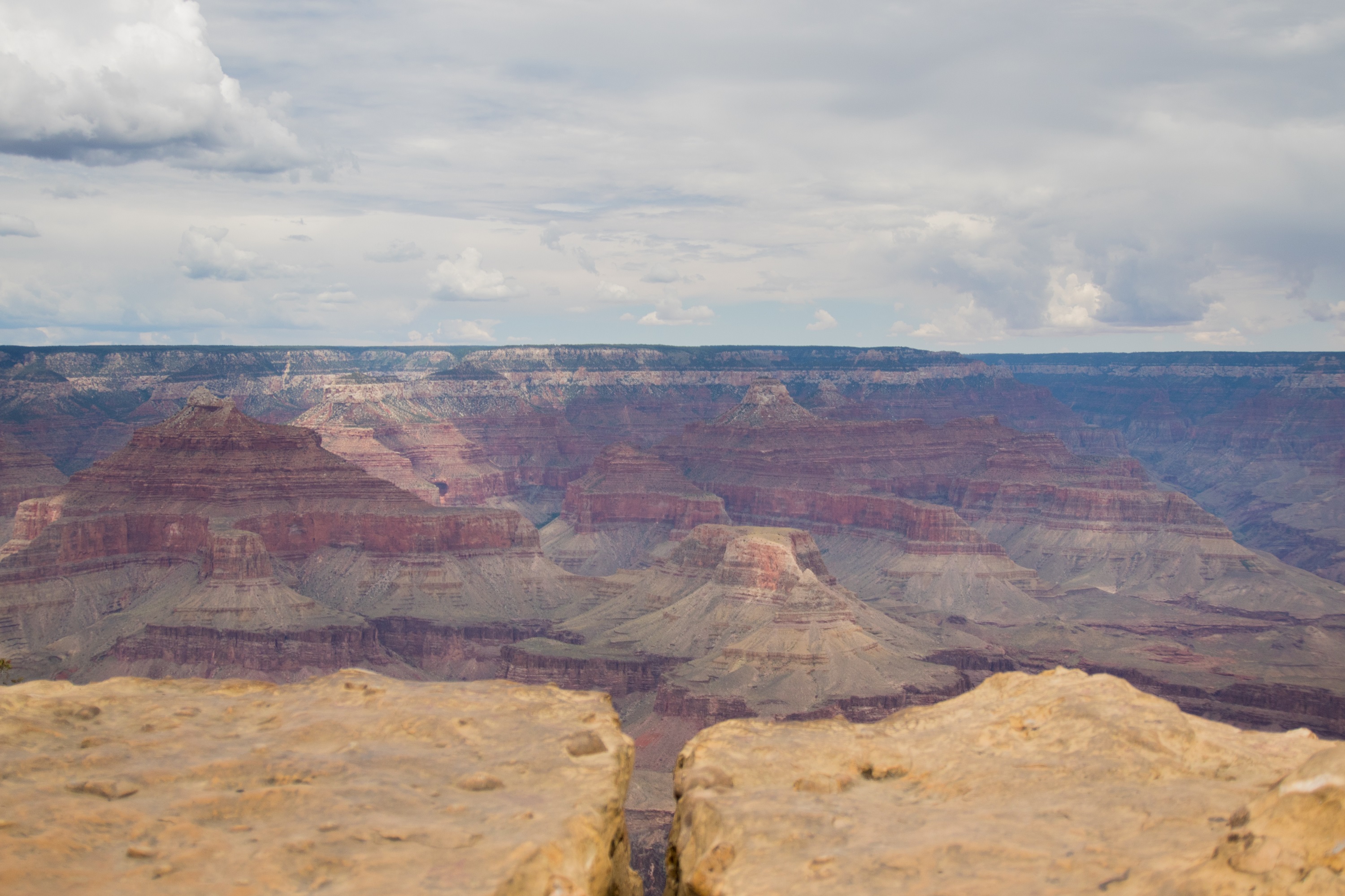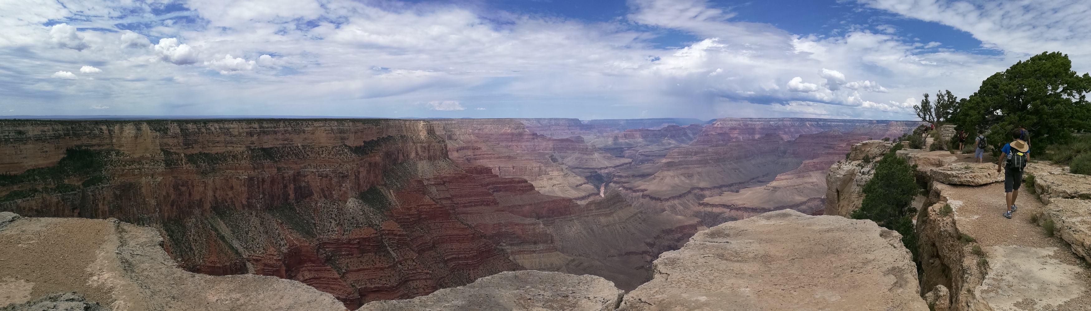 On s’arrête donc à Grand Canyon village où sont regroupés restaurants, hôtels, supermarchés, banque, poste et bibliothèque. Tout le secteur est équipé de trois lignes de bus gratuites afin de limiter l’usage de la voiture et de préserver, un peu, l’espace naturel. Après quelques minutes d’attente, on embarque nous aussi dans une navette à destination d’Hermists Rest pour un peu de randonnée et un retour jusqu’au village. Le Rim Trail choisi longe ainsi le canyon sur plus de 21km et permet de passer de points de vue en points de vue presque sans effort.