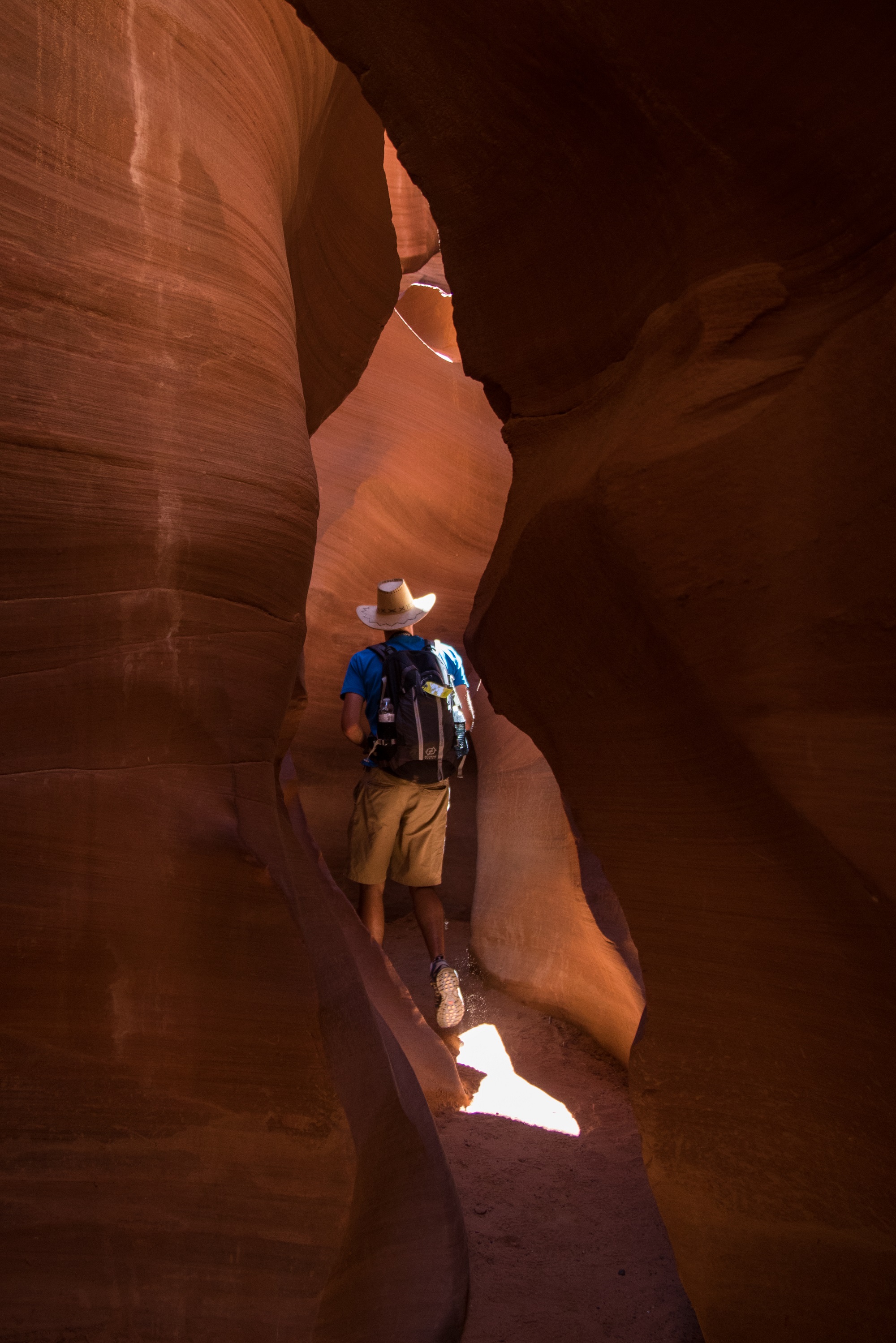 On s’enfonce dans le canyon en déambulant entre ses parois toutes en rondeur arborant des nuances de beige, de jaune, d’orange, de rouge et de rose. La lumière est plutôt vive mais varie d’un recoin à l’autre au fil de l’inclinaison de ces masses de grès sculptées. Les roches forment des vagues au profil parfois curieux. Dans les hauteurs, quelques troncs d’arbres sont encore vissés dans la roche, vestiges des dernières inondations liées aux orages. A mesure que l’on avance, le chemin se rétrécit et on ne peut souvent avancer que l’un à la suite de l’autre. Prisonnier de ces roches ondulantes formant un décor un peu magique, on finit par perdre la notion du temps. On retrouvera finalement le soleil plus d’une heure après, encore charmés par ce lieu insolite.