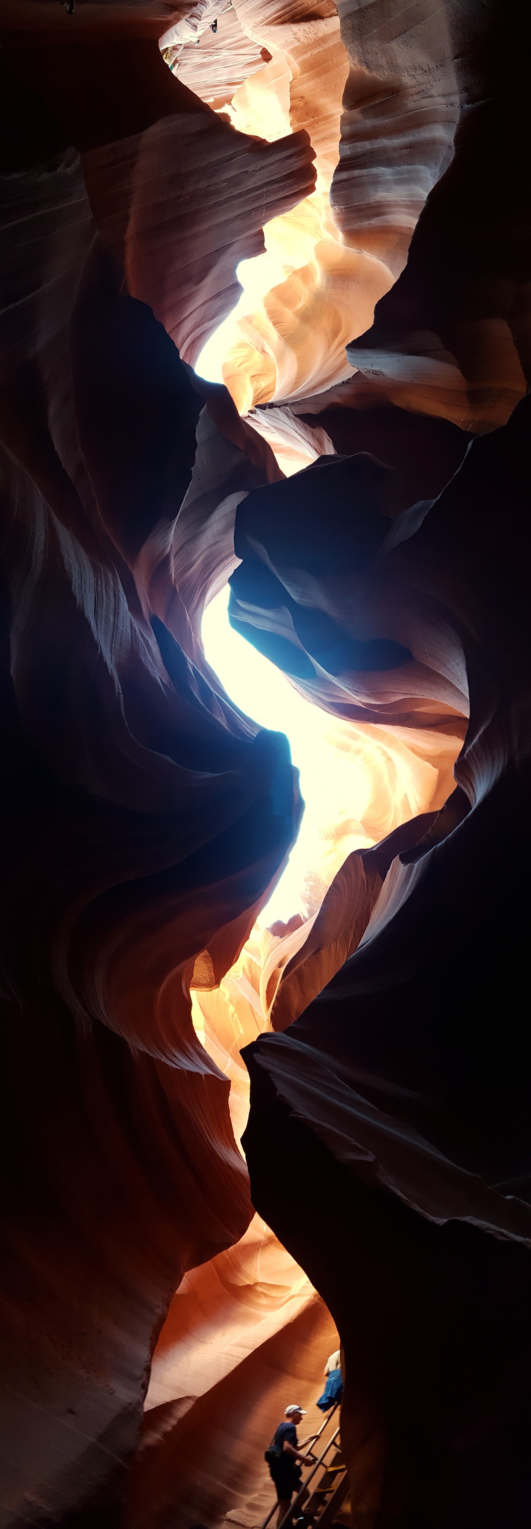 Visite d’environ 2h, $33. visite guidée via Dixie Ellis’ Lower Antelope Canyon Tours. Réservation : https://antelopelowercanyon.com/. Nous avions réservé pour 8h50 et il aura fallu presque une heure d’attente pour atteindre le canyon. La lumière étant maximum entre 10h et 14h, ce décalage tombait finalement plutôt bien !