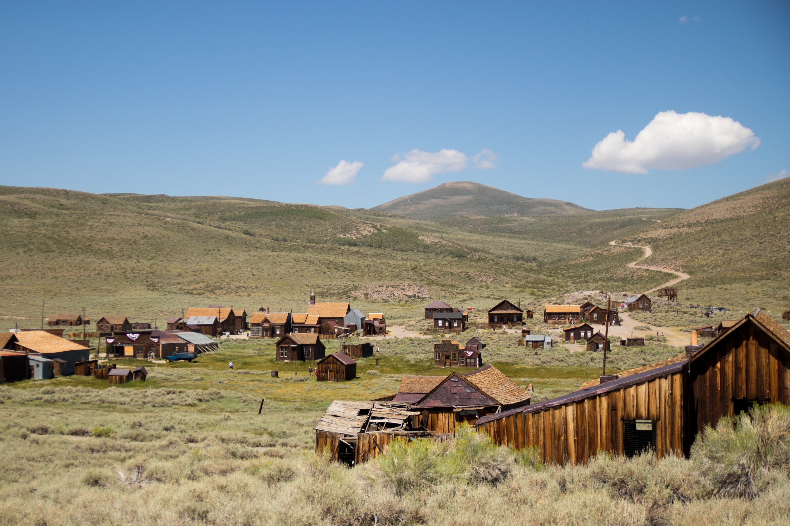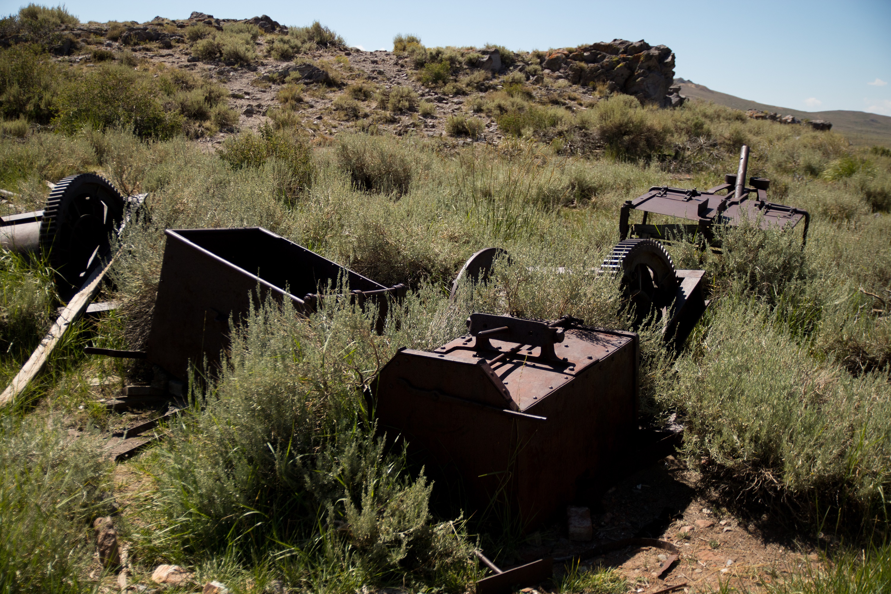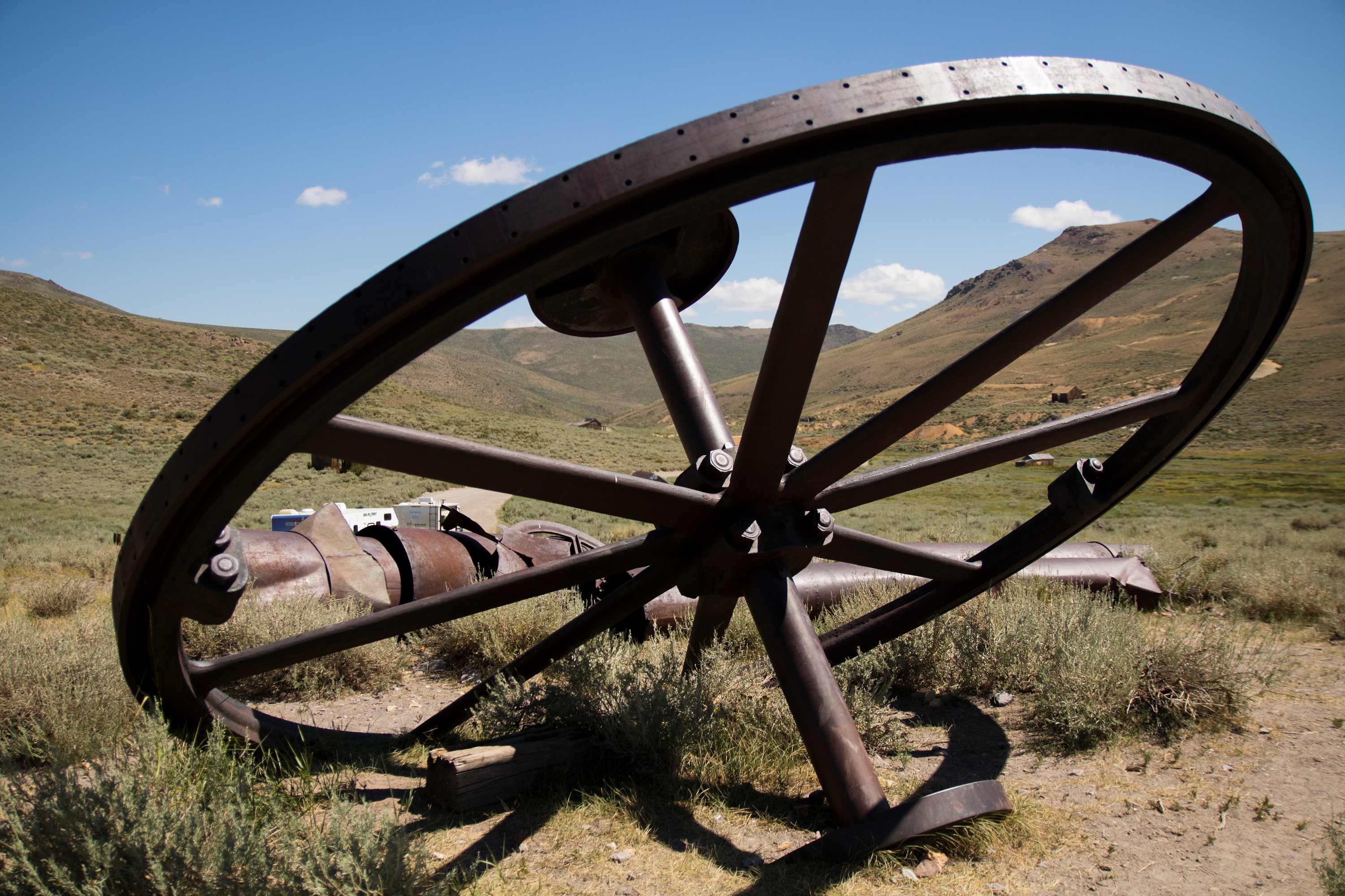 Notre journée commence par un bon dans le passé, à une époque où quelques 10 000 personnes avaient fait de Bodie une importante cité minière. Bienvenue en 1880, à l’ère des saloons et des fumeries d’opium, où résonnaient minerais et ferrailles dans les allées de terre bordées de maisons en bois. Accessible par une route caillouteuse et pleine de poussière, les vestiges de la ville trônent à 2500 mètres d’altitude dans une prairie perdue. On gare nos SUVs dans un état lamentable sur le parking du Bodie State Historic Park et on aperçoit déjà les chariots et les roues abandonnées là. Perchée au dessus des maisons, l’usine minière est restée figée et presque intacte.