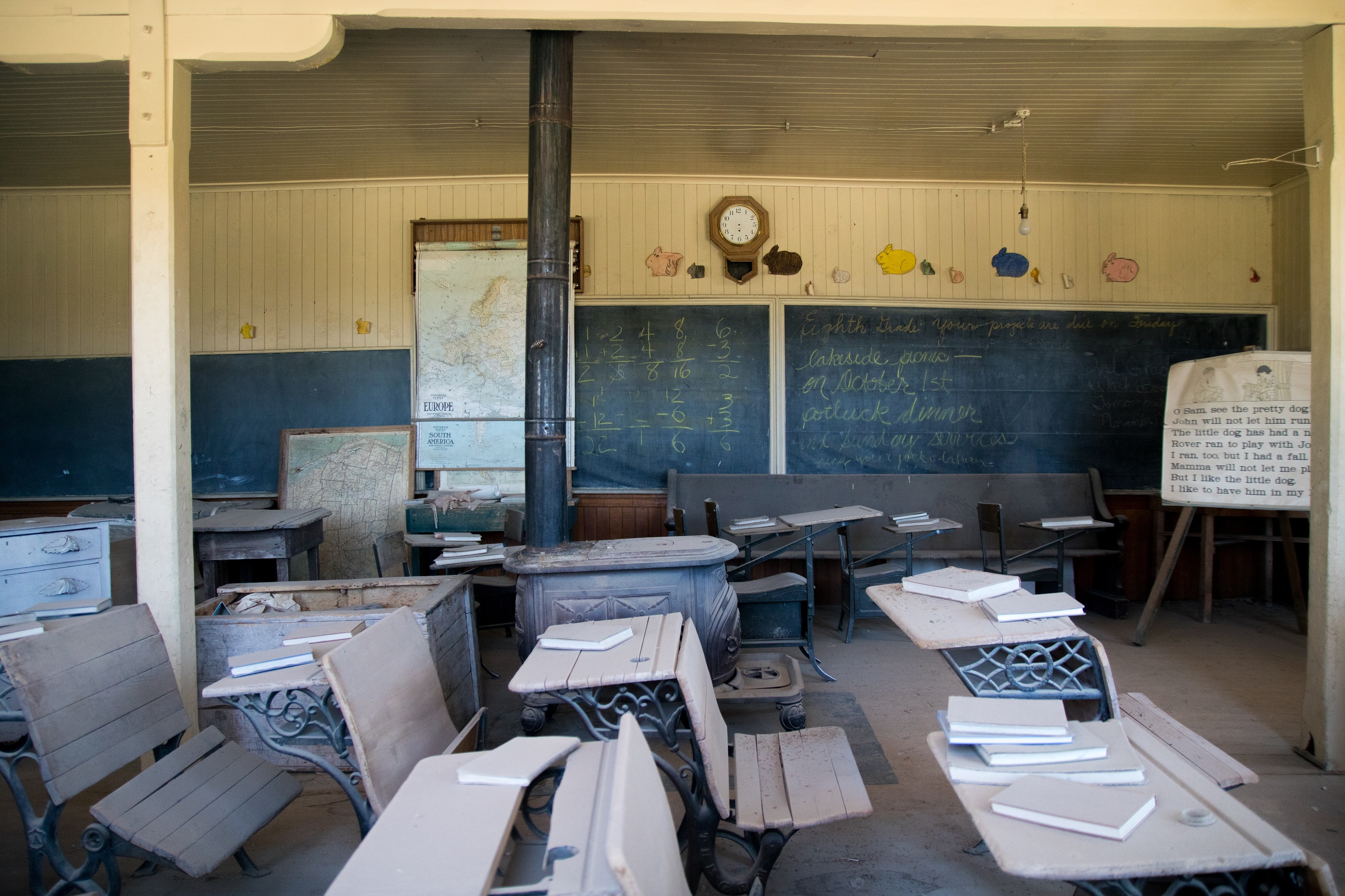 A ces pieds, les petites bâtisses en bois dégagent une curieuse impression. On regarde pas les fenêtres pour entrevoir une vie passée dont quelques objets abandonnés conservent le souvenir. C’est là le charme étrange de cette visite. On déambule le nez collé aux vitres et, derrière les lès de papier peint délavé et les vieux matelas à ressorts, c’est un bout d’histoire qui se dessine. On tombe ensuite sur une école ornée de cartes anciennes et de traces de craie, un saloon où seuls les meubles ont survécu et de vieilles autos au charme rétro. Un petit musée regroupe tout un tas d’effets personnels abandonnés à l’appel de mines d’or plus prometteuses. Bodie, c’est l’Amérique comme on l’imaginait.