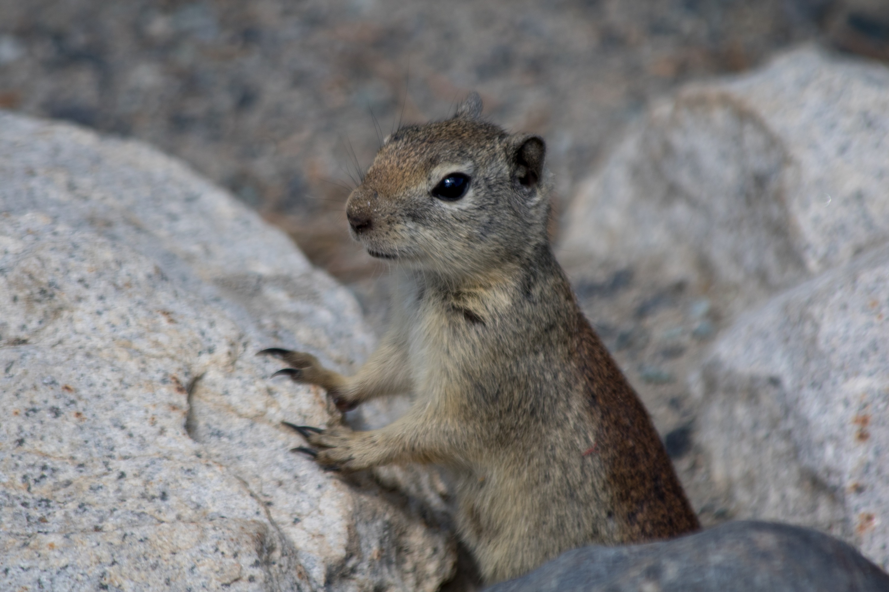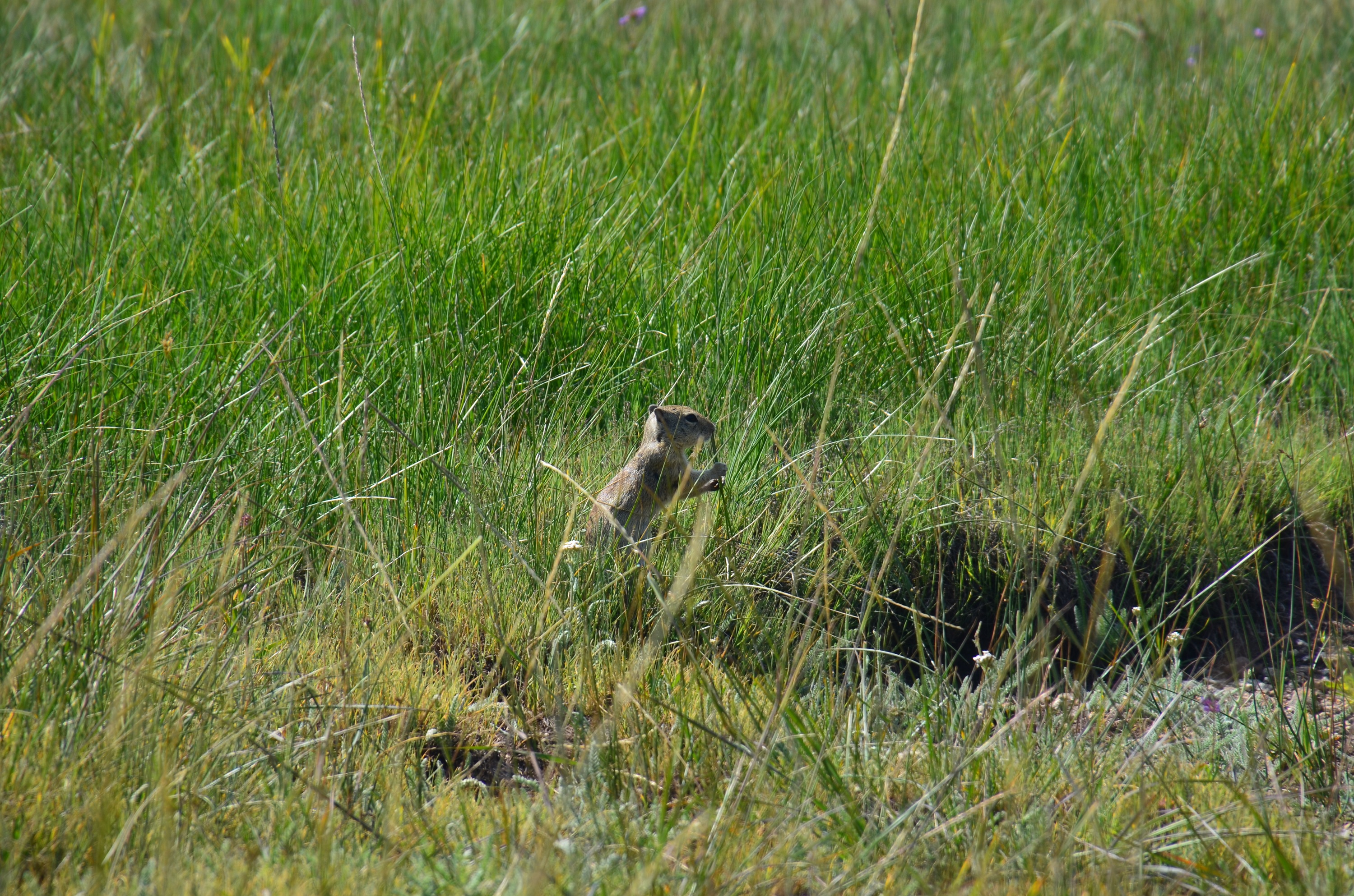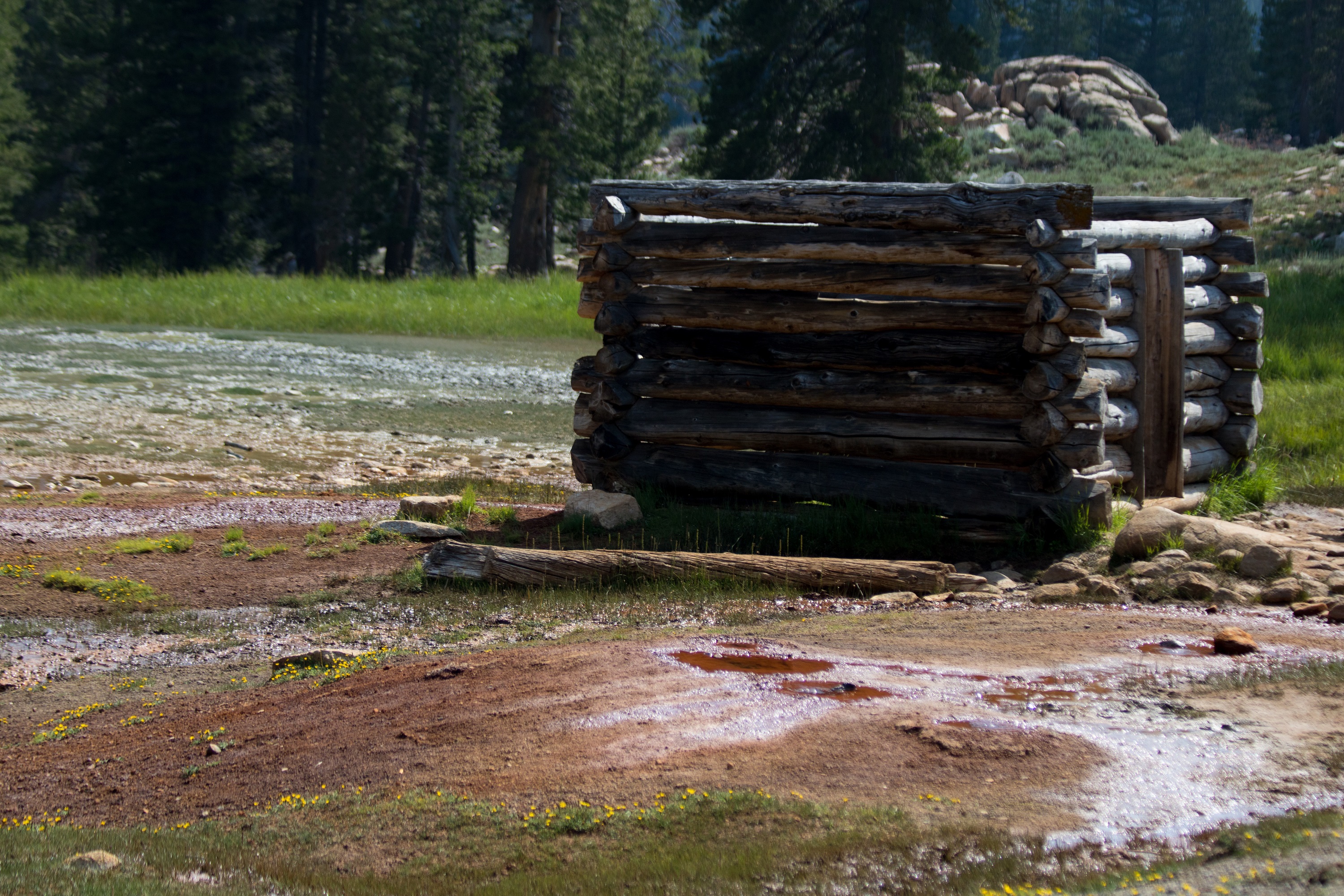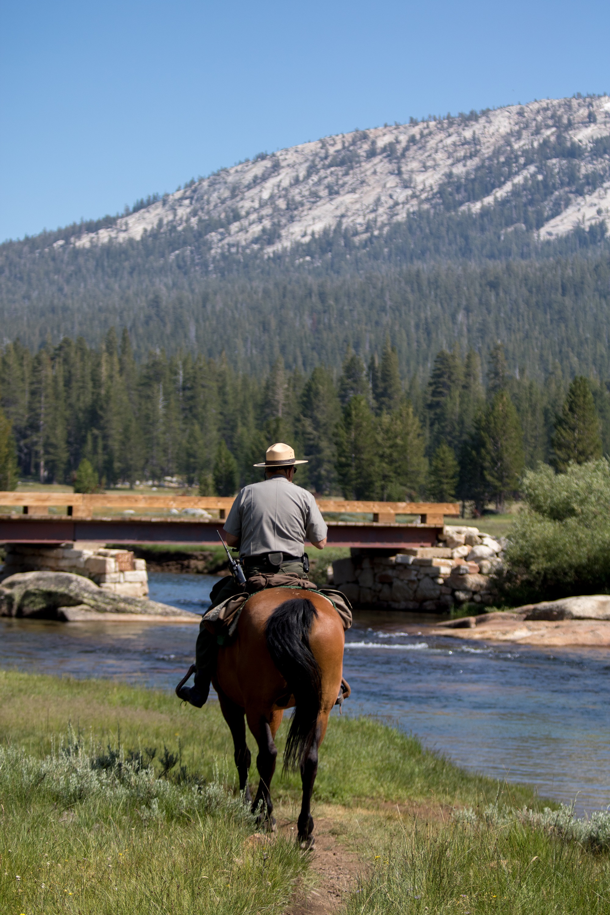 De retour en 2017, une mauvaise surprise mécanique pointe le bout de son nez: le voyant indiquant un défaut de pression des pneus s’éclaire soudainement. On s’arrête pour regonfler à la première station croisée et on reprend la route en espérant ne pas avoir crevé sur le chemin chaotique de Bodie. La 120, plus connues comme la Tioga Road, nous entraine sur les hauteurs et les sommets enneigés. C’est ainsi que l’on arrive à Tuolumne Meadows, immense prairie verdoyante qui pousse à 2600 mètres d’altitude. A peine arrivés on y croise des cerfs et biches en quantité, tout juste dissimulés dans les hautes herbes. Histoire de se dégourdir un peu les jambes, on opte pour une courte randonnée dans les prairies jusqu’aux Soda springs où coule une eau naturellement gazeuse. Sur le sentier, un ranger à cheval nous aborde et nous présente King, sa monture, avant de repartir en souriant. Dans les herbes, des chiens de prairie surgissent un peu partout. On les observe avec amusement guetter le moindre danger debout sur leurs pattes arrières avant de se suspendre aux brindilles pour grignoter et repartir en courant.