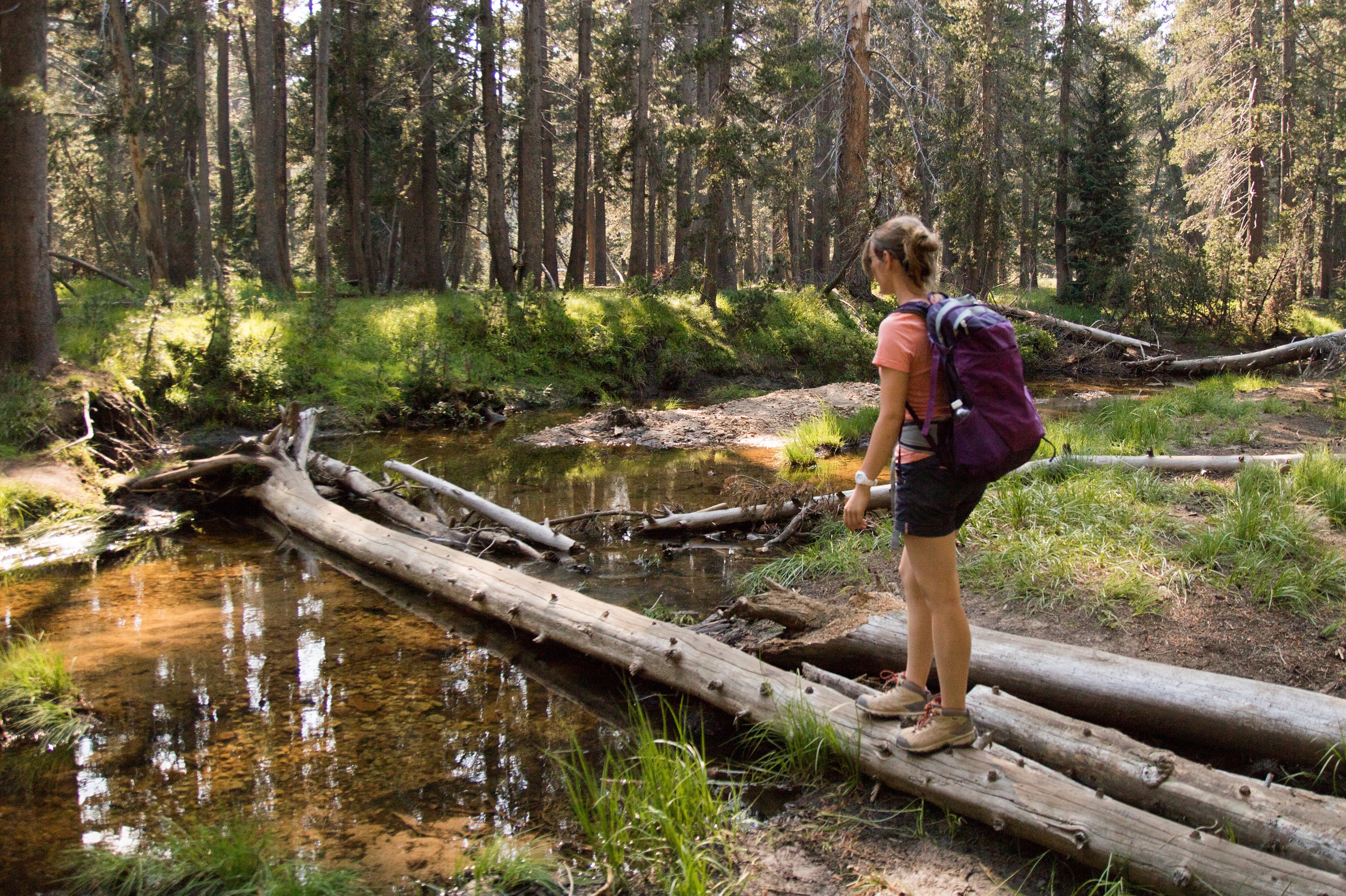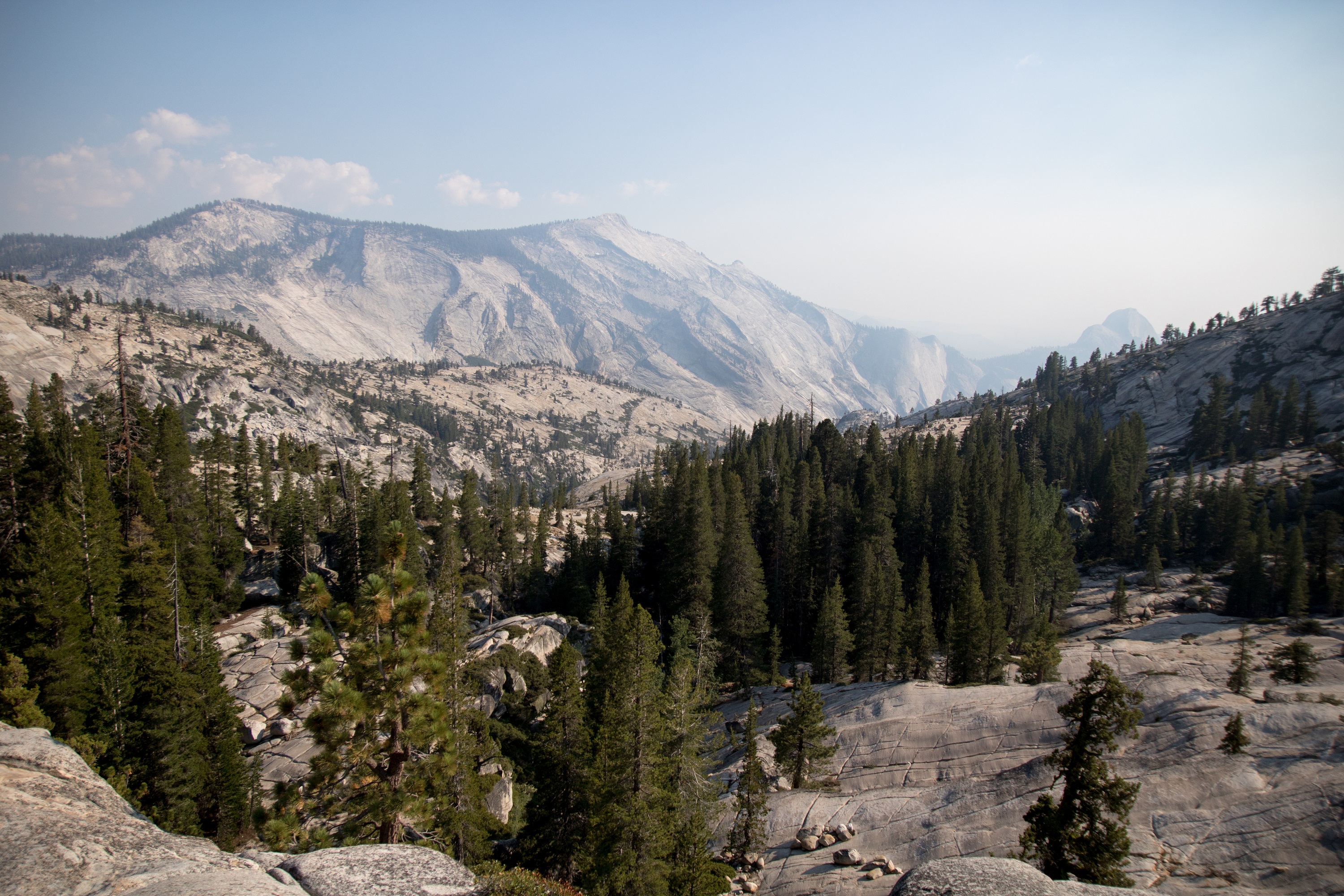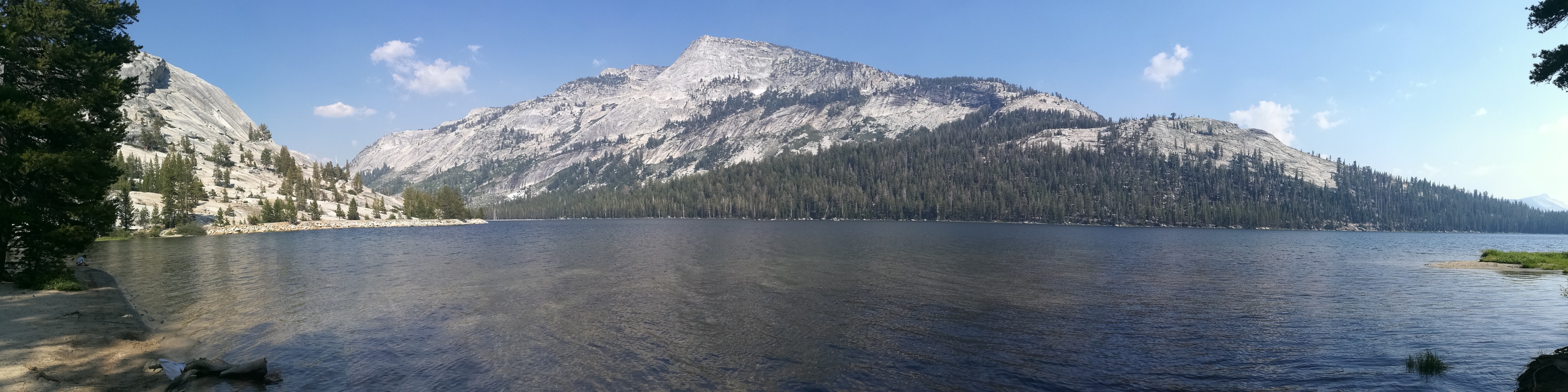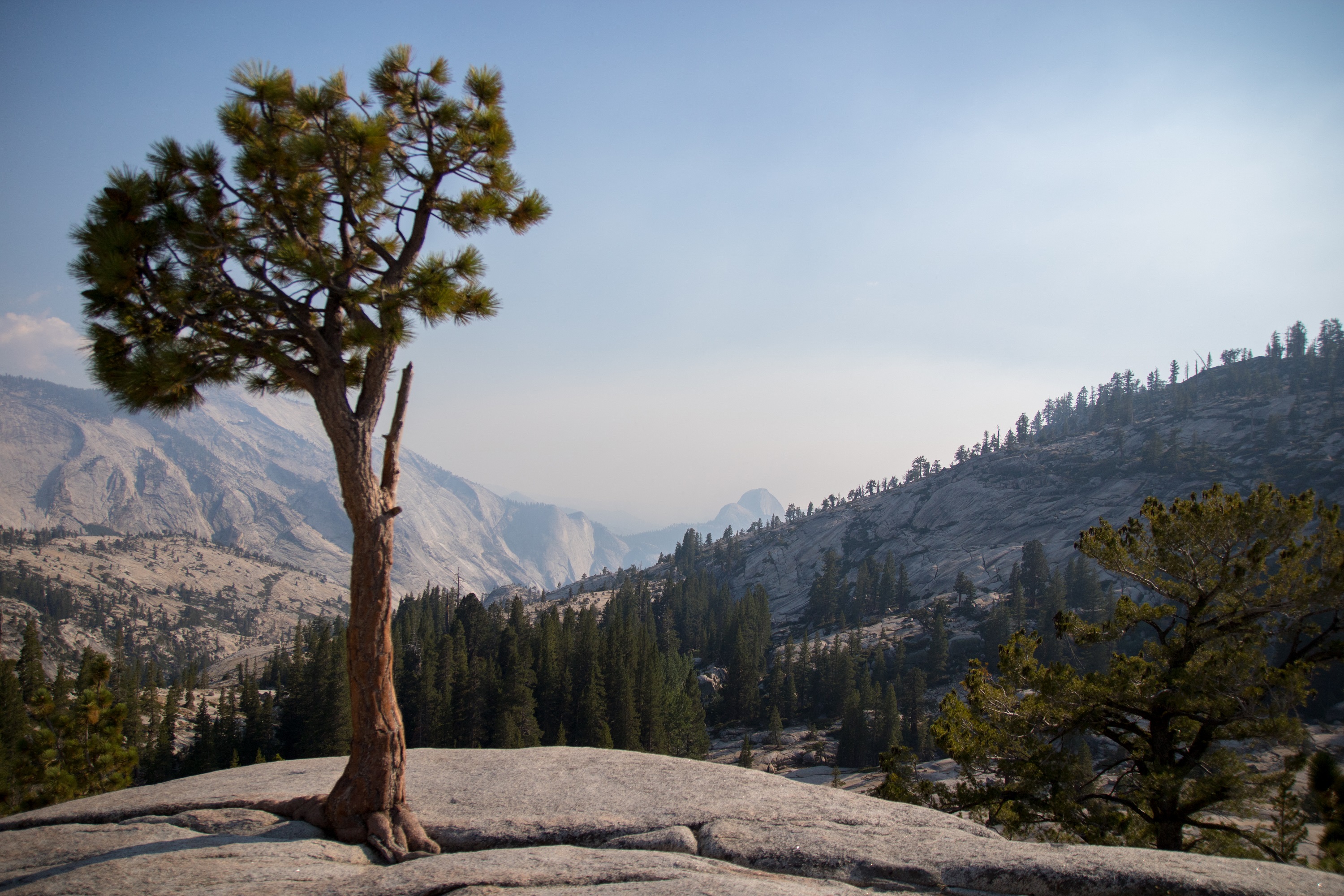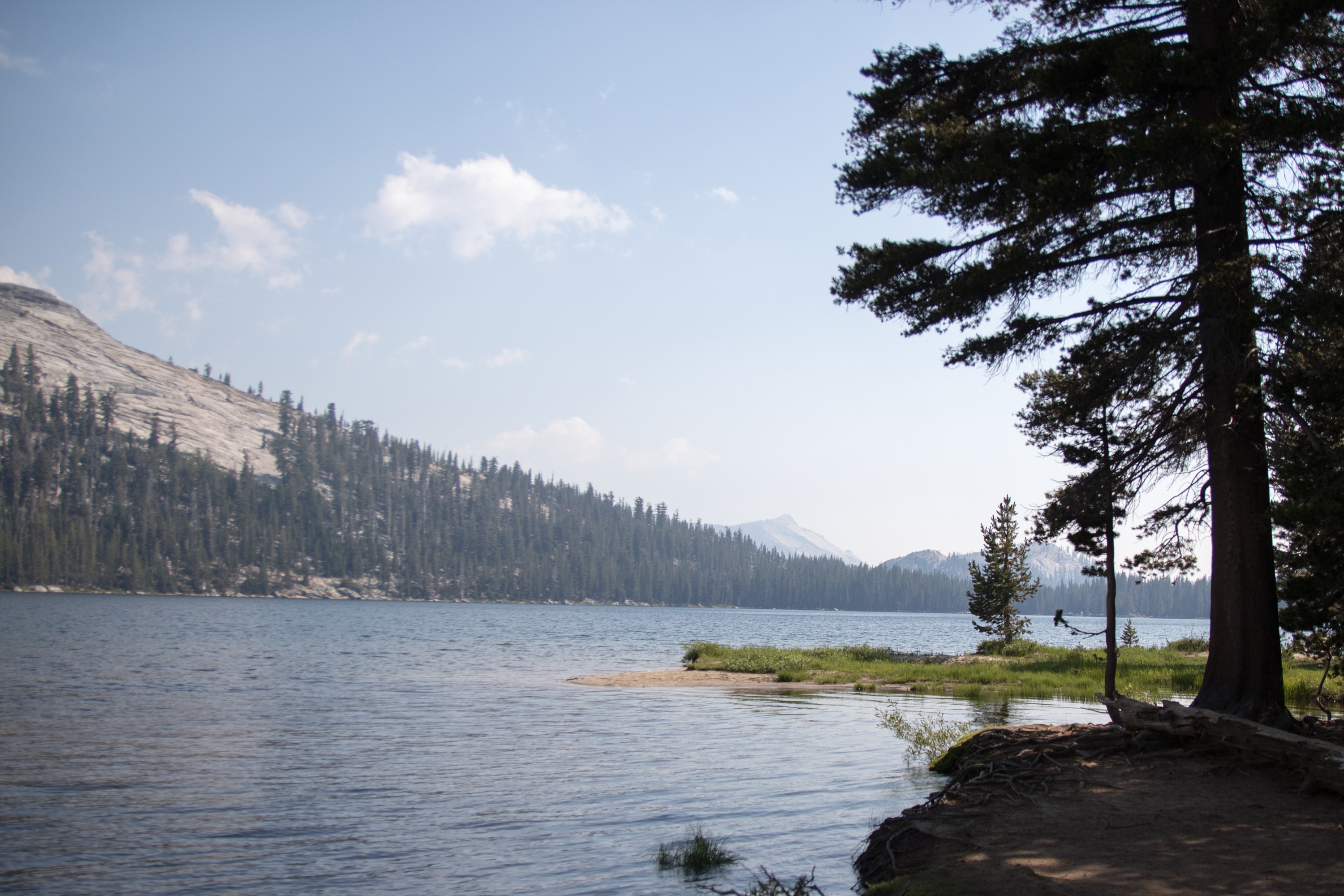 A quelques minutes de là, le Tenaya Lake, le plus vaste du Yosemite, brille au soleil. Les récents incendies ayant ravagé une partie du parc quelques semaines avant notre arrivée enrobent pourtant le décor d’une brume colorée et d’une étrange lumière. Si un chemin longe cet immense lac entouré de montagnes, on part tout de même le nez au vent en longeant la rive. Quelques acrobaties sur des ponts improvisés nous emmènent jusqu’à une petite plage pour une baignade improvisée (oui, c’est froid !). Assis face à cet horizon d’eau et de roches grises, on n’entend plus que le bruit des geais dans les branchages.