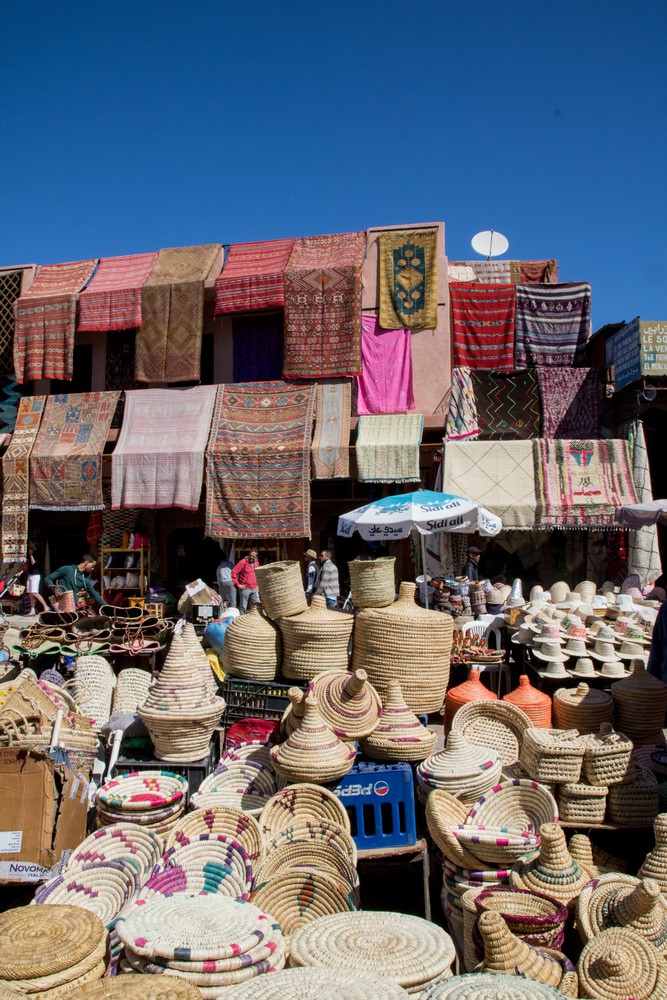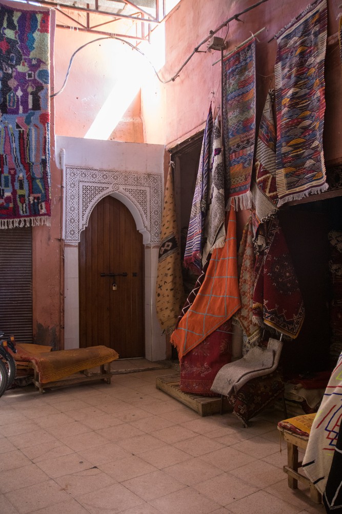 Le nez aux vents et le regard errant d’un stand à l’autre, on traverse les ruelles, étudiant les poteries aux décors raffinés, les babouches qui pendent au plafond et les vêtements brodés. Sans y prêter vraiment attention, on déboule sur l’animée Rahba El Kdima, ancien marché au grain envahi de marchandises et porte d’entrée sur de nombreux souks. Les apothicaires y ont élu domicile avec leurs plantes médicinales, poudres odorantes, racines, peaux de bêtes ou lézards séchés (beurk). Un peu plus loin, des centaines de paniers, couffins et corbeilles s’accumulent dans un joyeux bazar coloré. Des tapis suspendus partout face à nous recouvrent des maisons entières et marquent l’entrée du souk Zarbia, incroyablement désert et calme. Quelques timides rayons de soleil s’infiltrent à travers le toit de tôle et donnent un peu de vie à ces allées endormies.