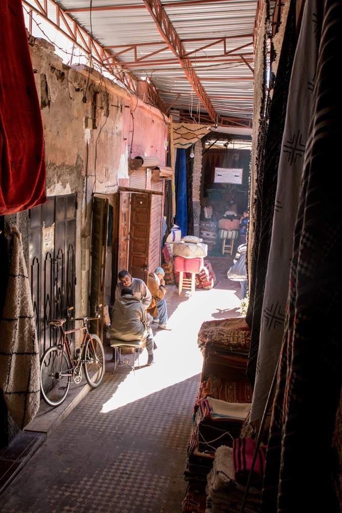 Notre journée à la découverte des souks commence dans une ambiance étonnamment tranquille. On s’y prend vers 11h, le temps d’avaler notre immense petit déjeuner et on est à nouveau surpris par le calme. Sous un doux soleil qui chauffe délicatement la peau, Marrakech s’éveille sagement, loin du brouhaha de la soirée. Les stands ouvrent peu à peu et personne ne hèle les passants, même les mobylettes slaloment sans effort et ont arrêté de klaxonner à tout-va. On choisit une rue proche de notre riad avant de s’engager dans les souks au gré de notre inspiration.