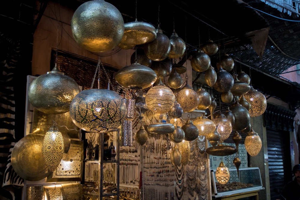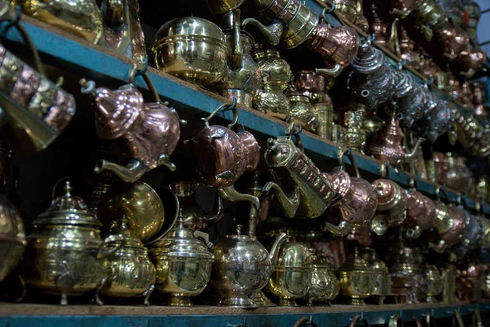 Deux virages plus loin, les ruelles de plus en plus tortueuses s’encombrent de milliers de pièces de ferraille, du lustre majestueux à la babiole la plus anodine. Caverne d’Ali Baba qui brille de mille feux et où résonnent au loin les marteaux des dinandiers, l’endroit regorge des théières, petites lampes ou plateaux ciselés sur lesquels ondule la lumière du soleil ou de dizaines d’ampoules accrochées de toute part. Ça brille. C’est beau. Le souk des bijoutiers voisin déborde lui aussi de breloques qui s’accumulent dans les vitrines ou directement sous les yeux des passants. Au moindre coup d’œil envieux, les marchands vous entrainent dans une série d’essayages au son de traditions plus ou moins ancestrales et de « gazelles » en veux tu en voilà.