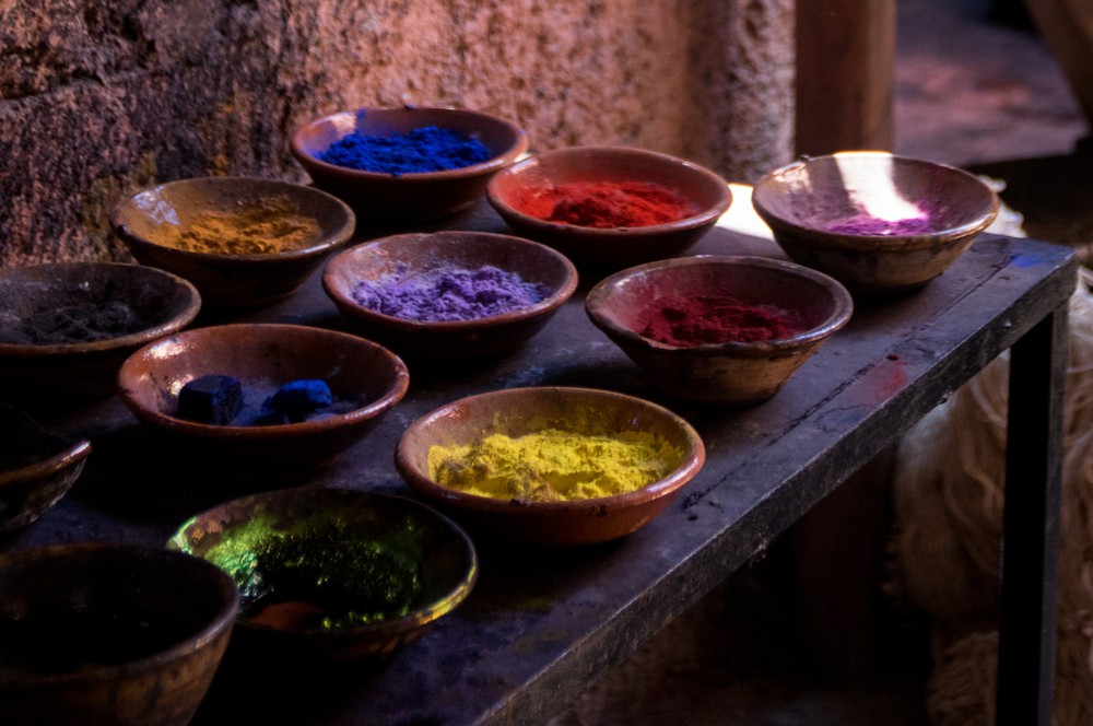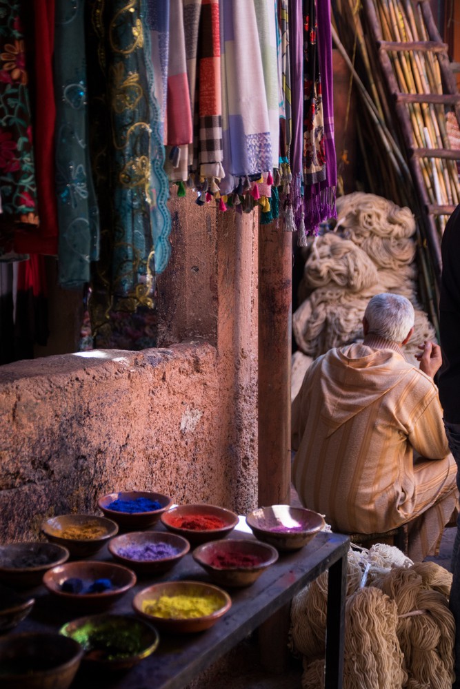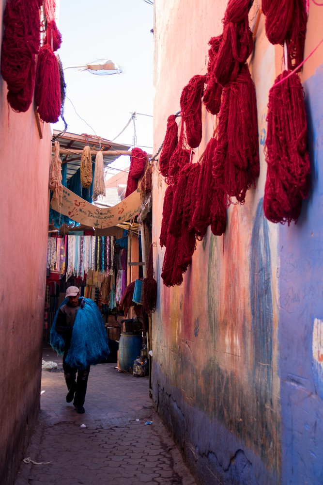 On s’enfonce encore dans les méandres de Marrakech quand des rangées de châles et d’étoffes aux mille nuances indiquent l’approche du petit souk des teinturiers. Les écheveaux de laines suspendus au dessus de nos têtes sèchent au soleil. Bleu intense, rouge sombre ou couleurs d’automne ornent des morceaux de bois installés ici et là. Quelques coupelles de colorants trainent sur les étals près de marmites d’un autre âge qui fument abondamment. Au coin d’une rue, on se retrouve emmitouflés dans un chèche indigo avant d’avoir pu dire « ouf ». Seuls les yeux ont été épargnés par ce voile coloré noué habillement par un marchand. D’un geste rapide, il dévoile le visage dans un immense sourire « ça mon amie, c’est la version climatisation berbère ». Comment se faire pigeonner en 3 leçons.