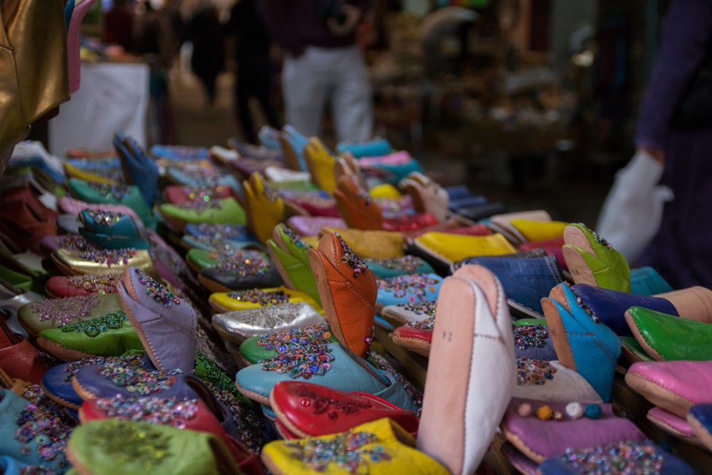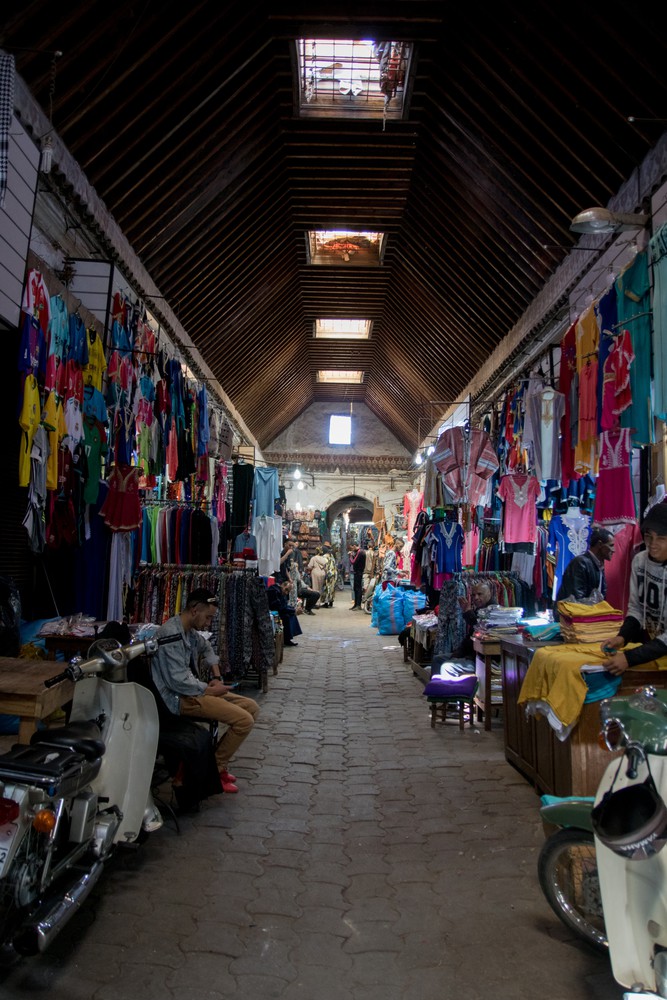 De grandes galeries au plafond de cèdre ont été envahies de vêtements et de babouches de toutes les formes. Elles nous ramènent à la Mouassine, rue pavée aux stands ouverts sur la voie et ornés de volets en bois. On y est presque les seuls touristes au milieu d’une foule dense qui circule entre les pâtisseries, les bazars et les morceaux de viande suspendus à des crochets. On ressort un peu perdus dans une artère où semble se jouer une course de mobylettes qui ne laissent aucune chance aux piétons.