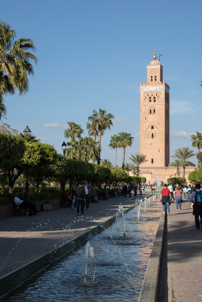 Après des heures de vadrouille, le café Argana offre une pause en terrasse avec vue sur la place Jemaa El Fna et les montagnes enneigées de l’Atlas en toile de fond. Passés les vendeurs ambulants, charmeurs de serpents et hannaya traçant des formes de henné aux couleurs peu naturelles, la Koutoubia s’élève près des vestiges de l’ancienne mosquée. Elle rappelle la Giralda de Séville mais n’est malheureusement pas accessible aux non-musulmans. A ses pieds, baigné de senteurs de fleurs d’orangers, un grand jardin traversé de fontaines ouvre le chemin vers le quartier fortifié.