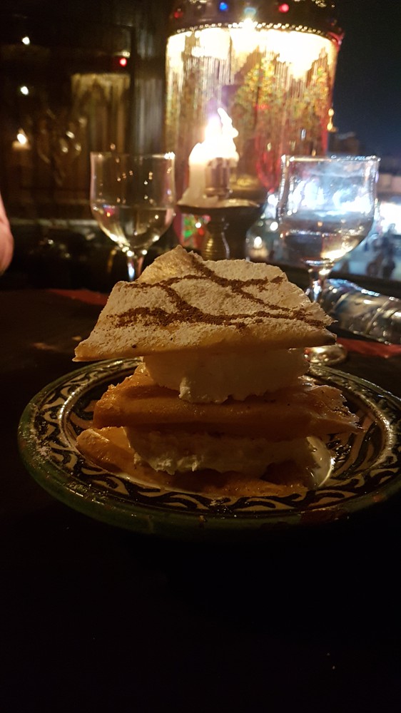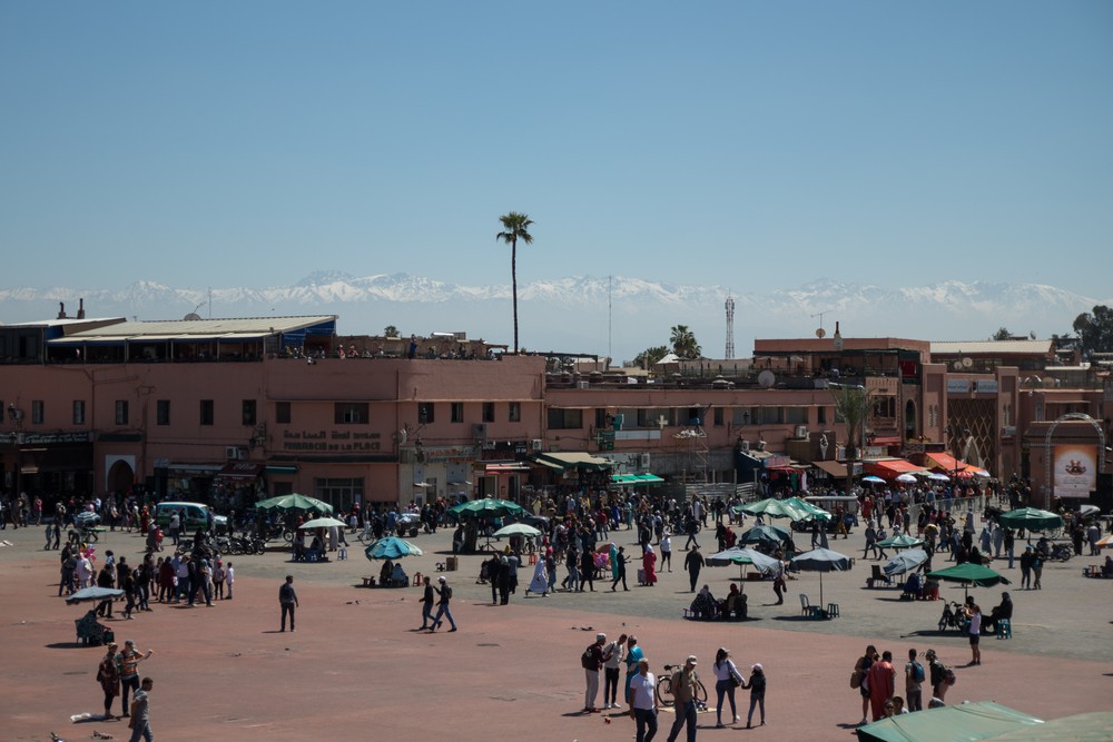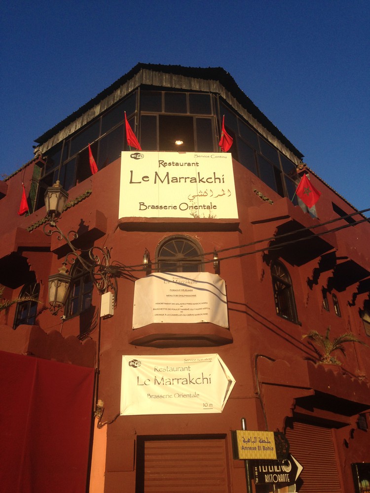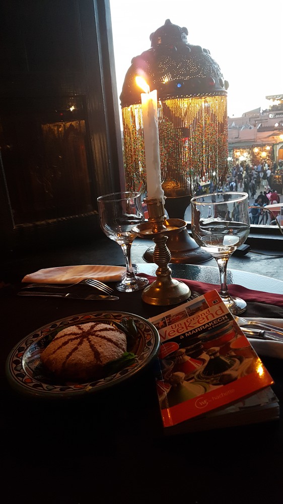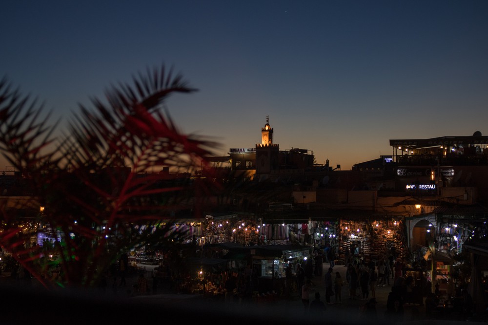 La journée s’achève sur les hauteurs de la place Jemaa El Fna avec un couscous aux sept légumes renversant sous des airs de musique orientale au coucher du soleil. Une danseuse rentre dans la salle suivie d’une seconde, les gens se lèvent pour danser au milieu des tables rouges et un petit bout marchant à peine s’avance en tapant dans les mains. Et discrètement, on se laisse surprendre par Marrakech.