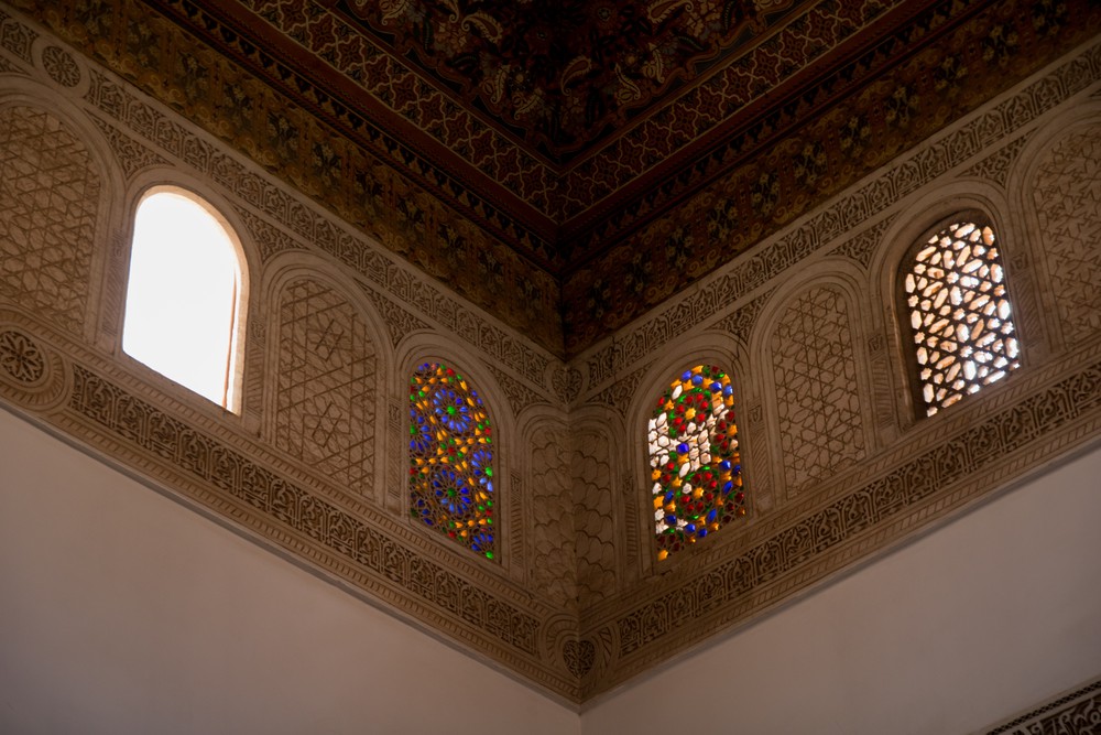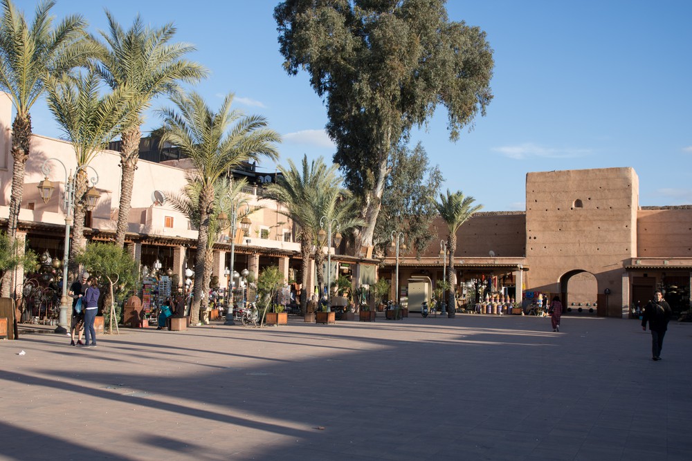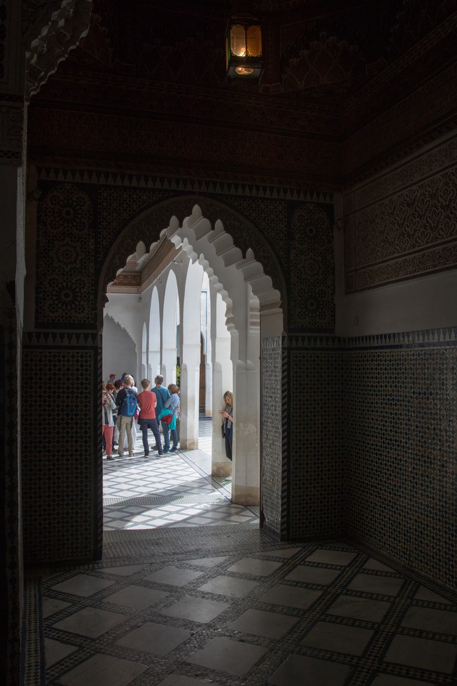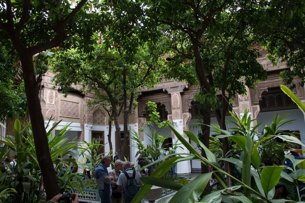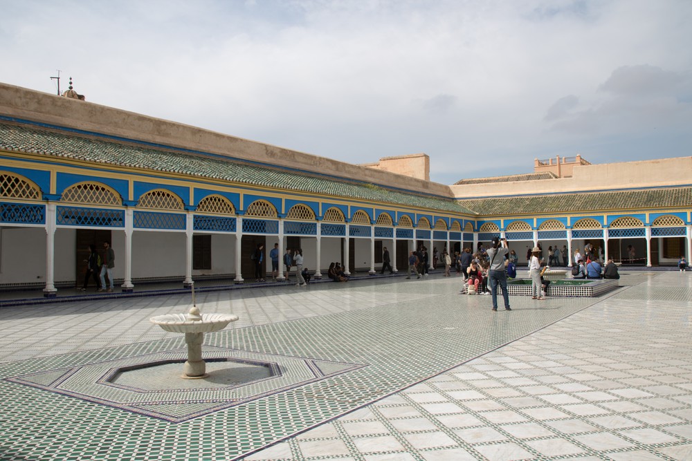 Notre dernier jour à Marrakech débute par une nouvelle balade culturelle. Partis en milieu de matinée, on est encore surpris par le peu de monde qui circule dans les ruelles. Devant le palais Bahia, pourtant haut lieu du patrimoine culturel du pays, seules quelques personnes personnes patientent pour obtenir un billet. On y entre donc rapidement dans une ambiance plutôt paisible. Derrière la porte, les carreaux et mosaïques défilent sur plusieurs hectares traversant des suites de pièces, de riads, de cours et de jardins aux décors changeants. Moins bien conservé et entretenu, le palais souffre de la comparaison avec l’Alcazar de Séville qui nous avait séduit au premier regard. On y passe néanmoins un bon moment jusqu’à ce que d’importants groupes amorcent bruyamment leur visite…