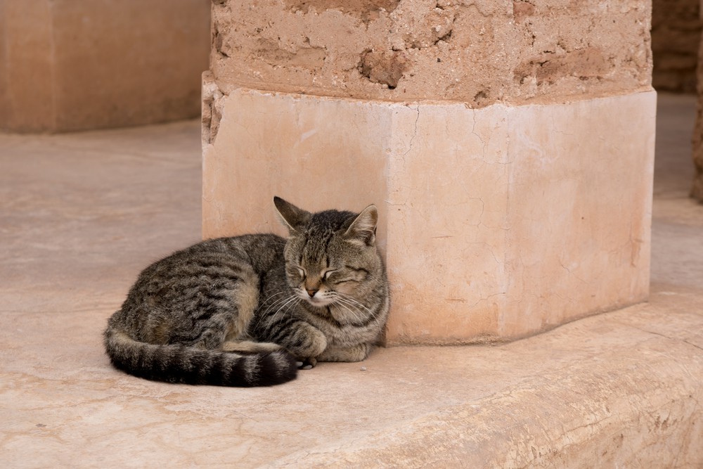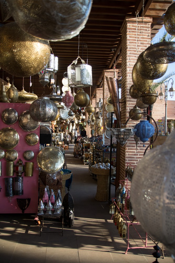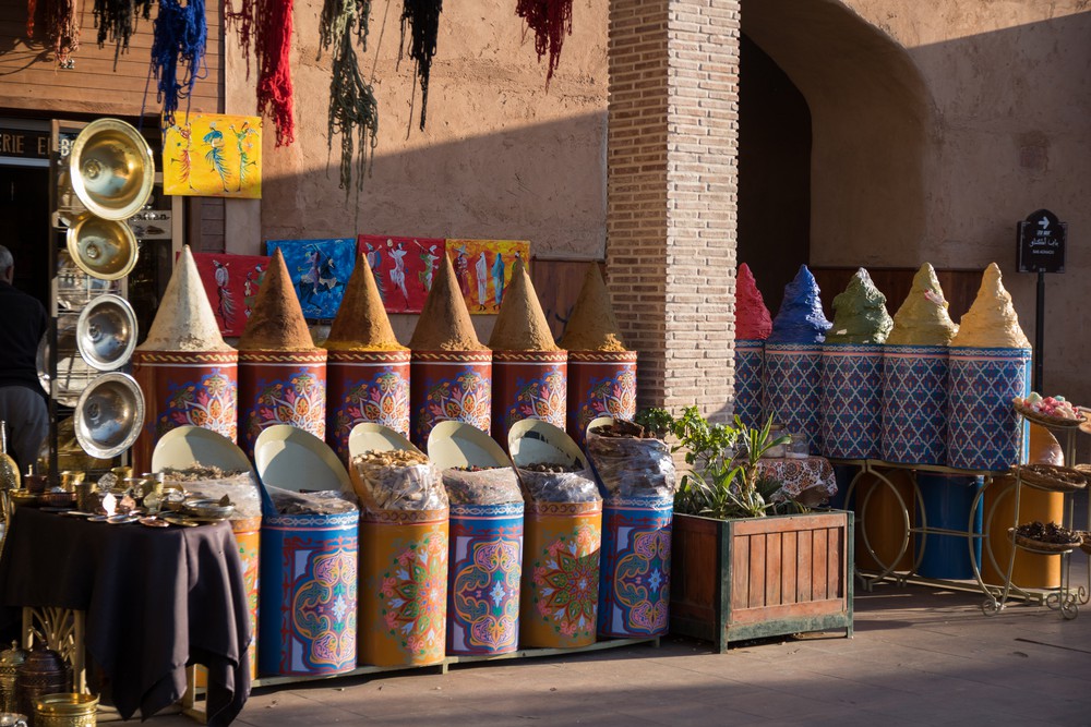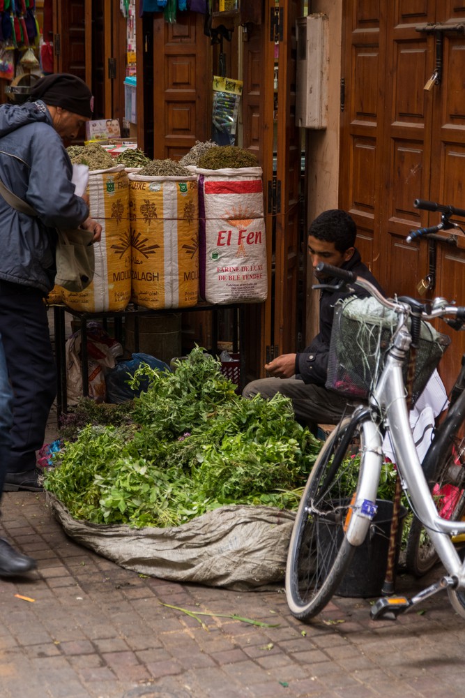 Sur la place des Ferblantiers voisine, les pièces cuivrées suspendues au dessus des étals dansent avec le soleil. Des dizaines de chats courent dans nos pattes alors que l’on vagabonde entre les bibelots colorés. Au bout des rangées de palmiers, la grande porte nous mène près des remparts du palais où un passant nous entraine par un couloir dissimulé entre deux portes. En un clin d’œil, nous voilà débarqués chez un marchand berbère qui, tout en nous prenant par les sentiments à coup de thé, nous détaille le contenu de sa boutique… Nouvelle leçon de pigeonnage. Dehors, le souk est bondé. Toutes les échoppes sont ouvertes et d’immenses sacs multicolores s’accumulent sur les bords des ruelles. Ça sent la menthe, le thé et les épices sous le toit de bois ajouré. Alors en bons bleus, on s’installe sur un banc, on écoute, on sent, on sirote des liquides chauds et sucrés en apprenant des recettes de grand-mère. Finalement, on passe un bon moment et on a presque plaisir à repartir le sac plein de bazar, de cadeaux et de remèdes miracles qu’on utilisera sans doute rarement.