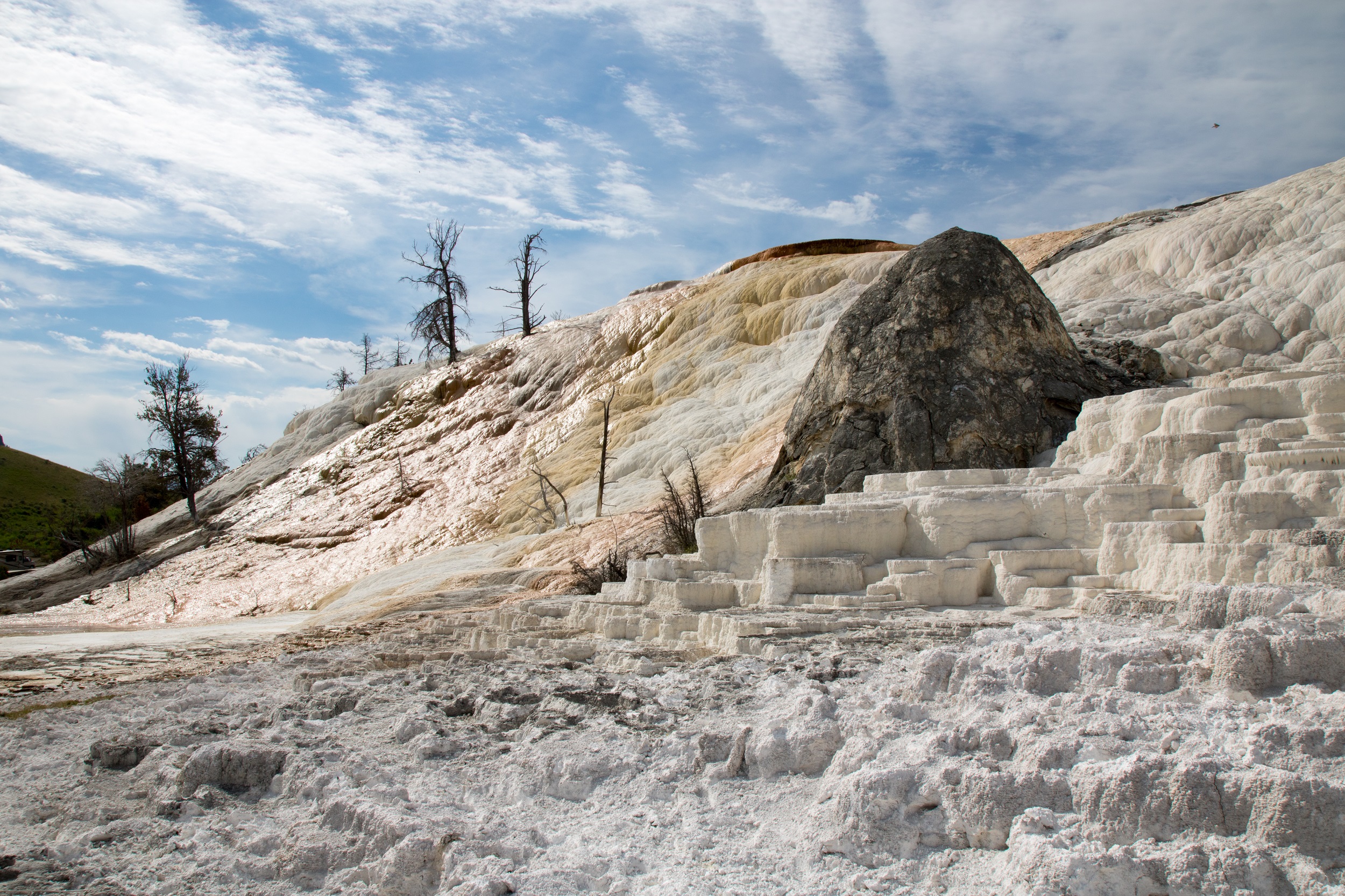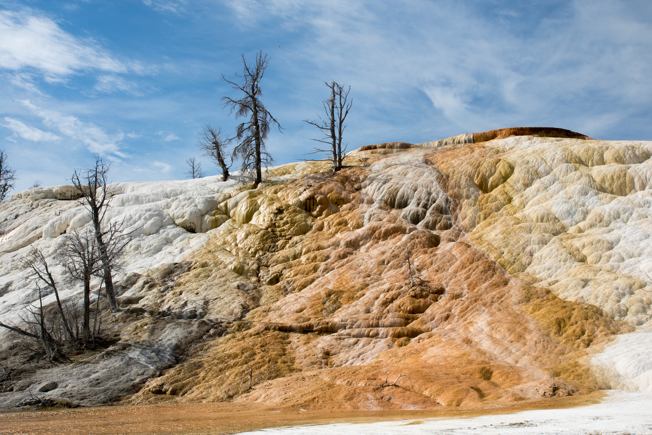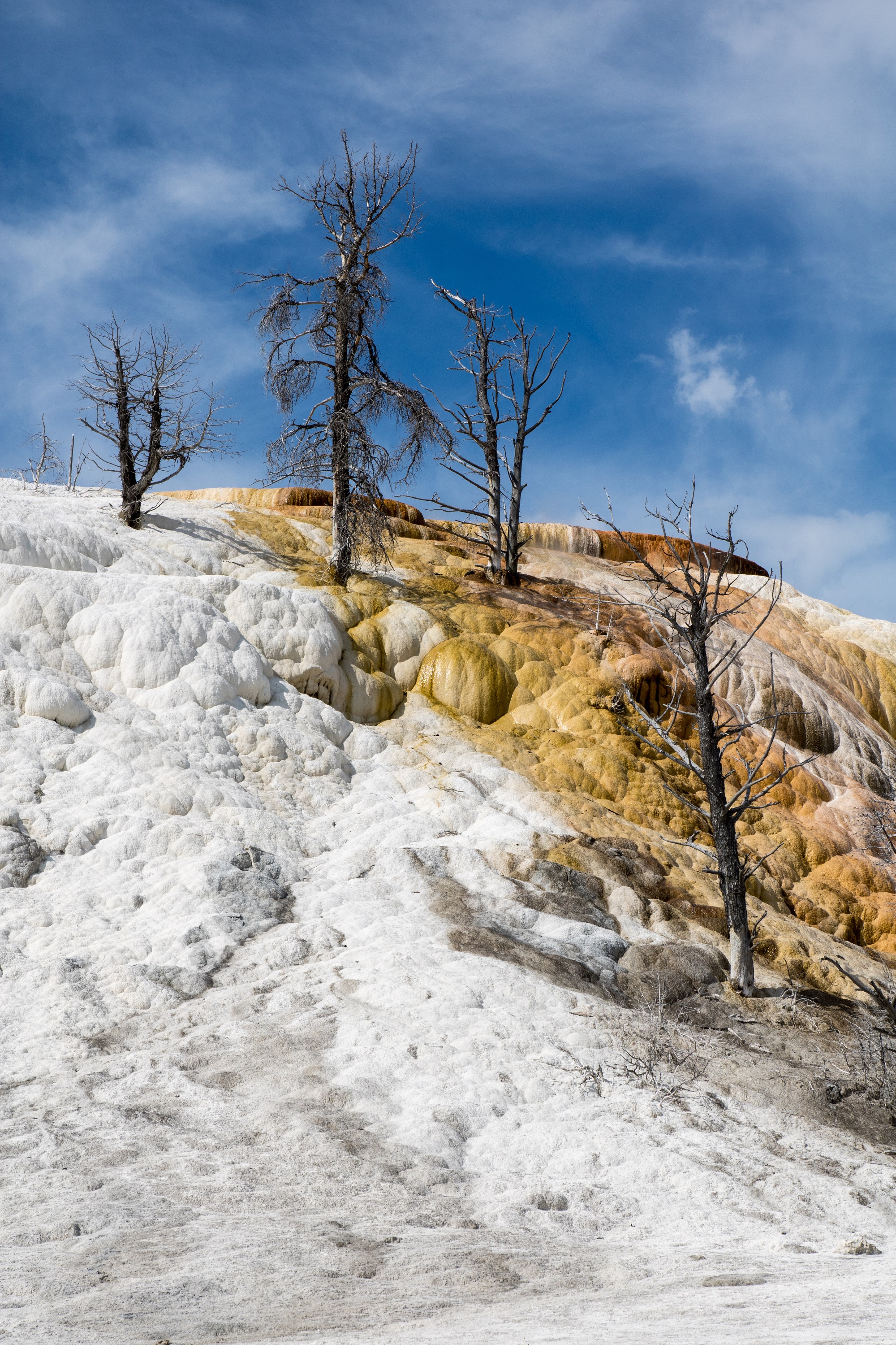 En arrivant à Mammoth Hot Springs, on découvre de superbes terrasses de calcium sur lesquelles glisse une eau chaude parfois fumante. Les teintes sont changeantes: de l’ocre, du jaune, du blanc voire de l’argent, balayées par une vapeur odorante. Plantées dans ce décor étonnant, des reliques d’arbres morts figés dans le temps se reflètent dans les flaques d’eau. Le décor est étrange, unique mais peu fréquenté ce matin là malgré son accessibilité d’une facilité déconcertante. On profite donc avec joie de cette quasi solitude, rare au Yellowstone.