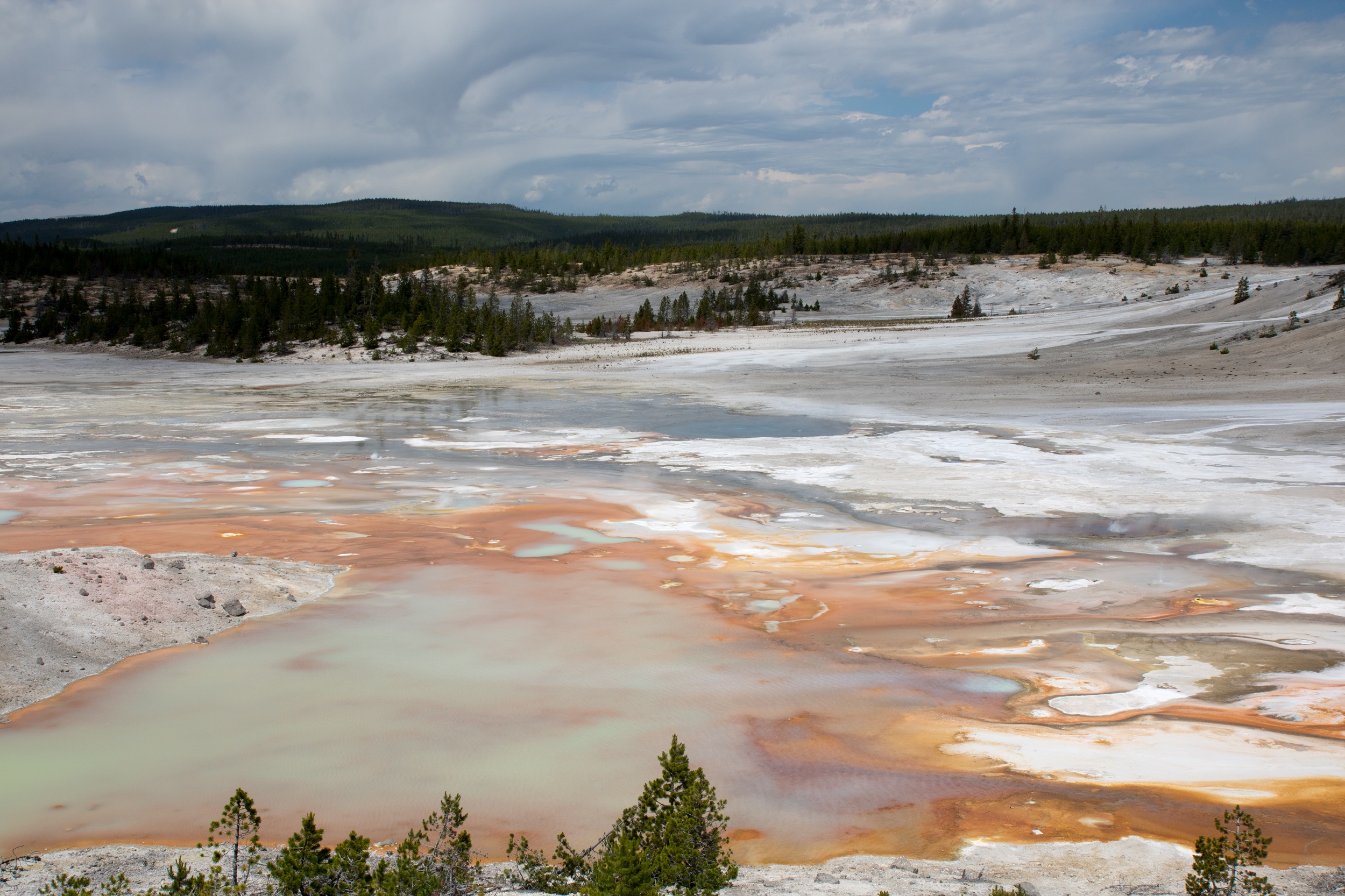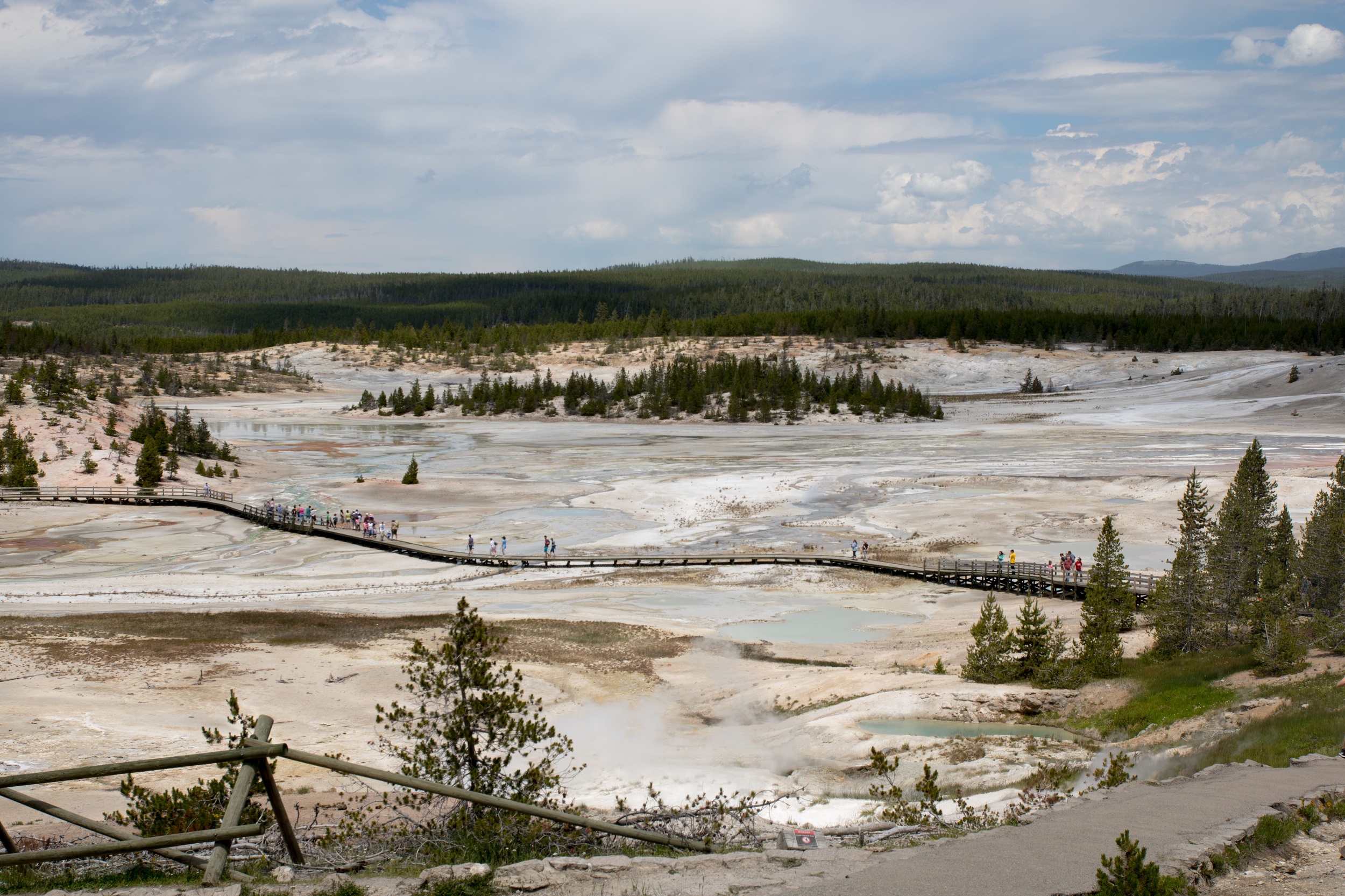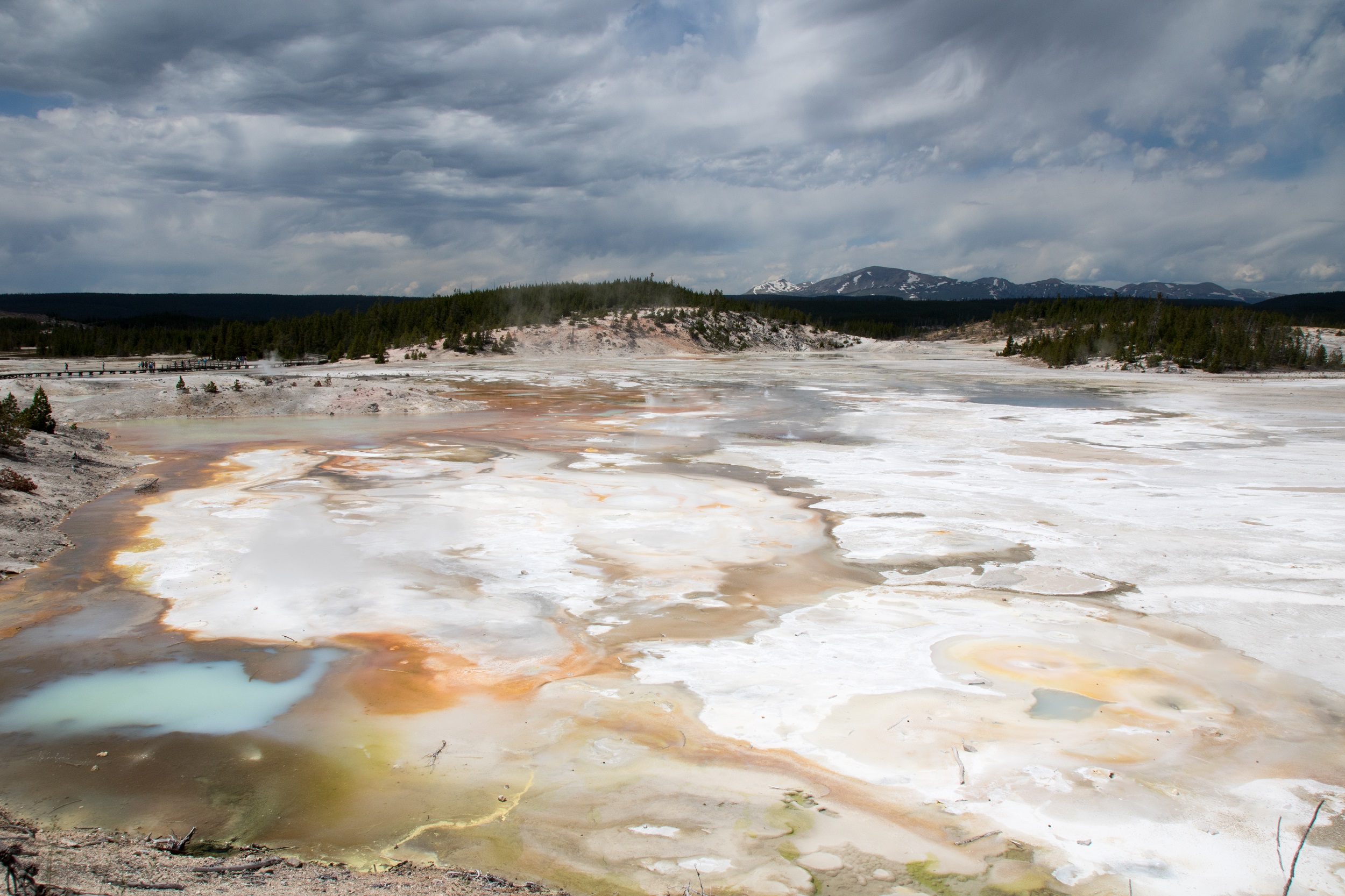 Après un pique nique grignoté sous une cabane de bois, la visite se poursuit dans le plus actif des secteurs géothermiques du parc, le Norris Geyser Basin. Des fumeroles, des mud pots et des geysers peuplent ce curieux décor, sauvage et inhospitalier. Les couleurs et l’ambiance y sont étranges, baignées de vapeur, de fumée, d’eau bouillante et d’odeurs de souffre. Porcelain Spring, à l’aspect laiteux improbable et quasiment désertée par la verdure est sans doute le clou du spectacle. On y déambule sur des platelages sous lesquels le sol frémit. Autour de nous, les bassins ont des nuances bleutées, vertes ou grises changeantes sous le ciel parfois menaçant.