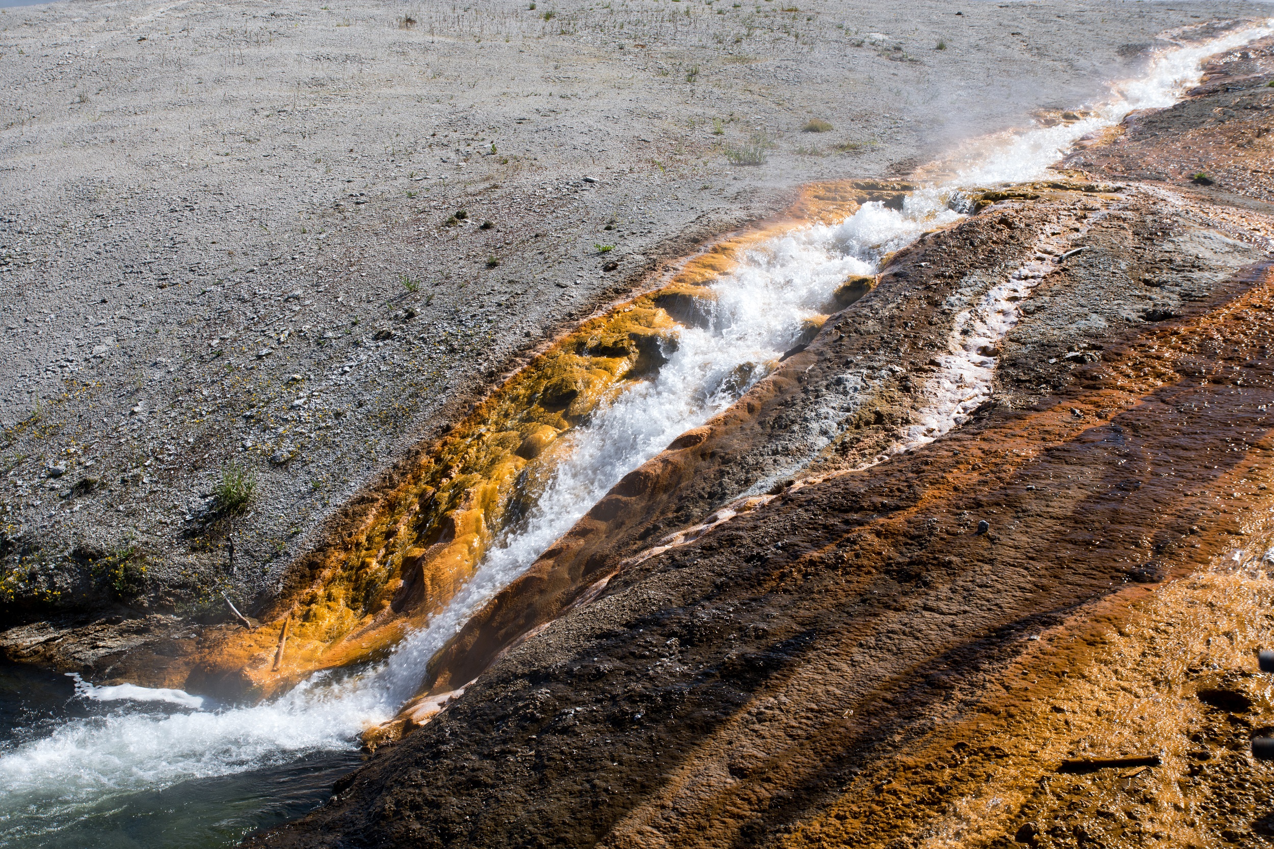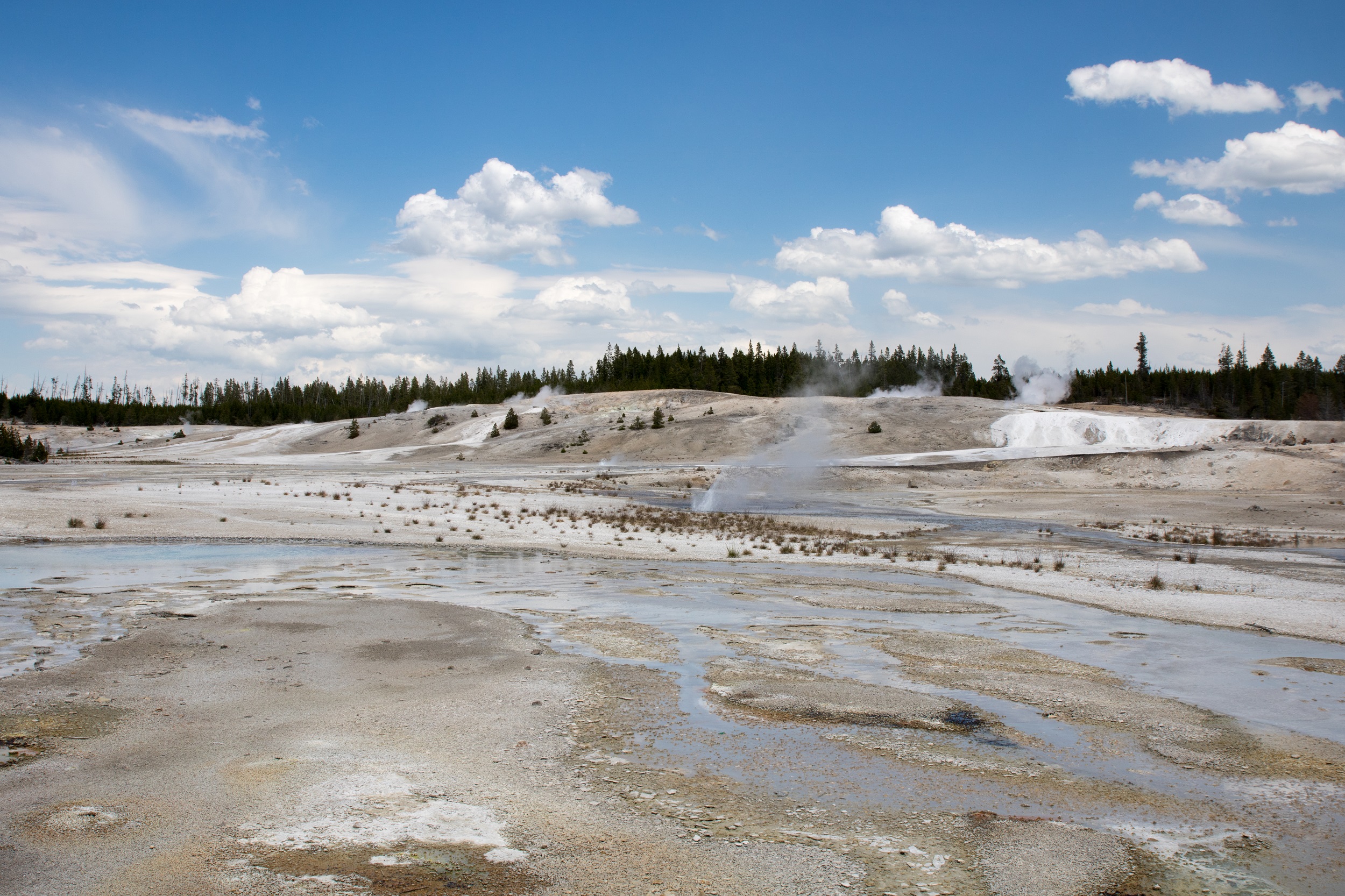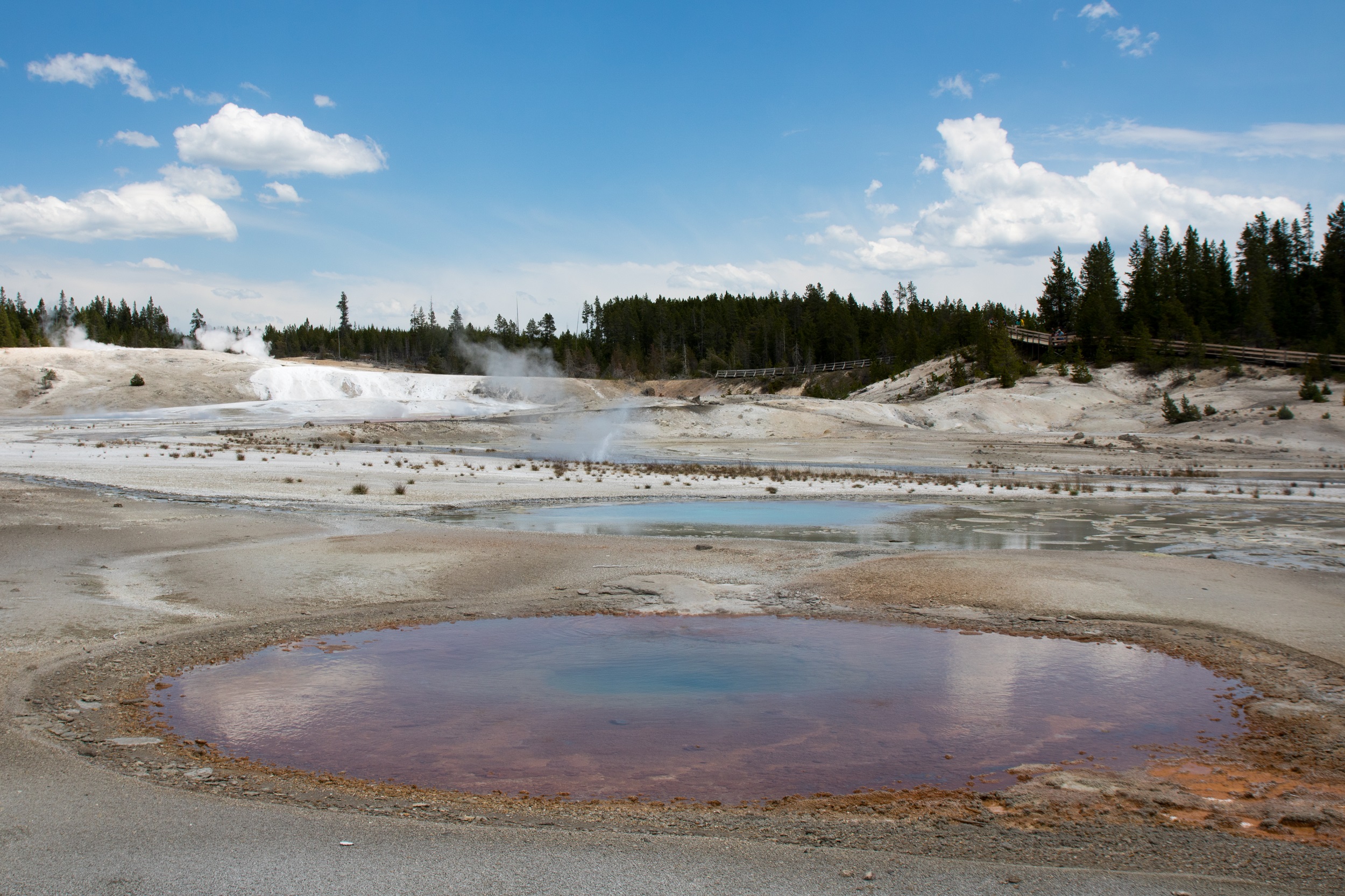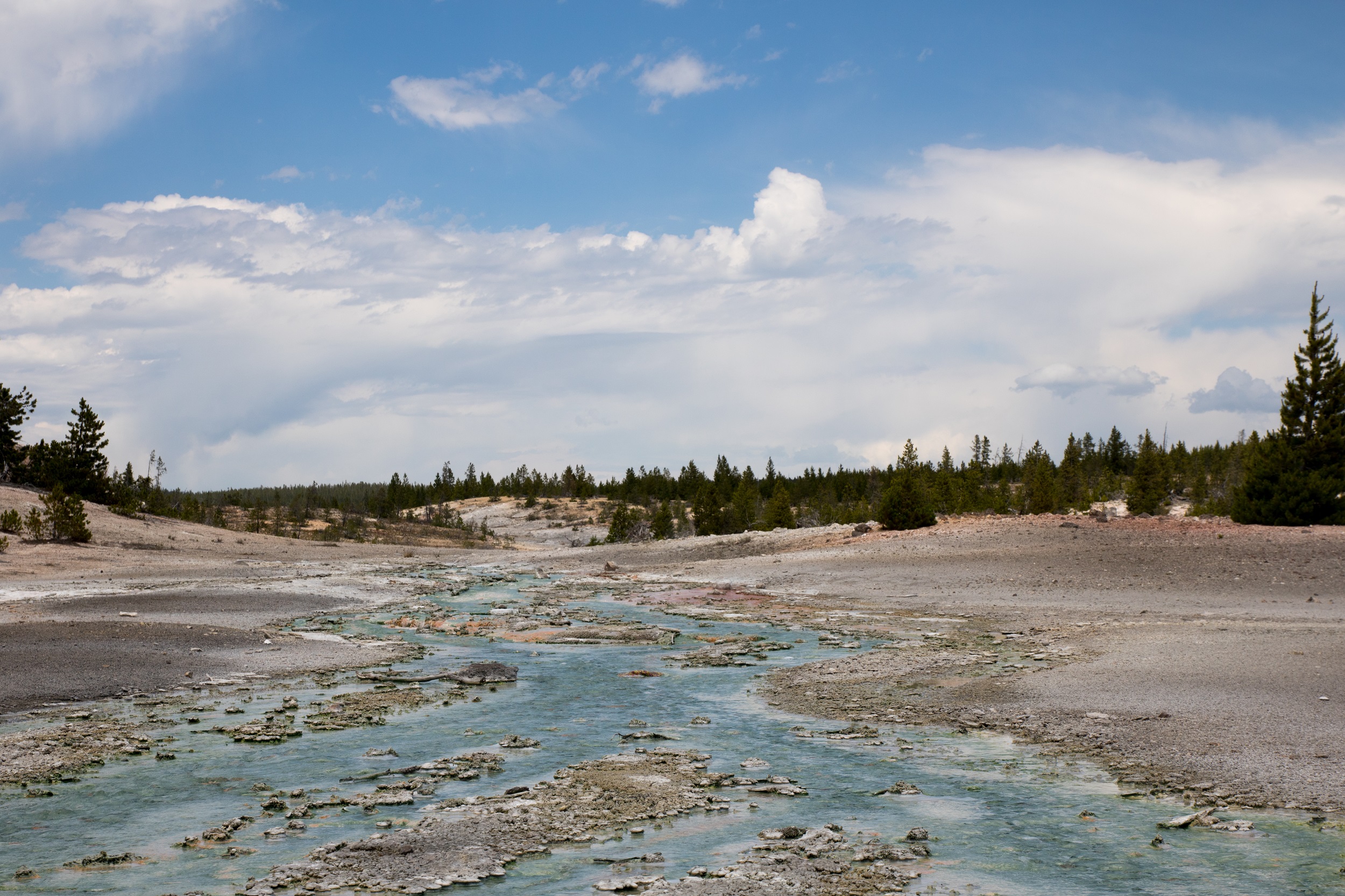 Après un pique nique grignoté sous une cabane de bois, la visite se poursuit dans le plus actif des secteurs géothermiques du parc, le Norris Geyser Basin. Des fumeroles, des mud pots et des geysers peuplent ce curieux décor, sauvage et inhospitalier. Les couleurs et l’ambiance y sont étranges, baignées de vapeur, de fumée, d’eau bouillante et d’odeurs de souffre. Porcelain Spring, à l’aspect laiteux improbable et quasiment désertée par la verdure est sans doute le clou du spectacle. On y déambule sur des platelages sous lesquels le sol frémit. Autour de nous, les bassins ont des nuances bleutées, vertes ou grises changeantes sous le ciel parfois menaçant.