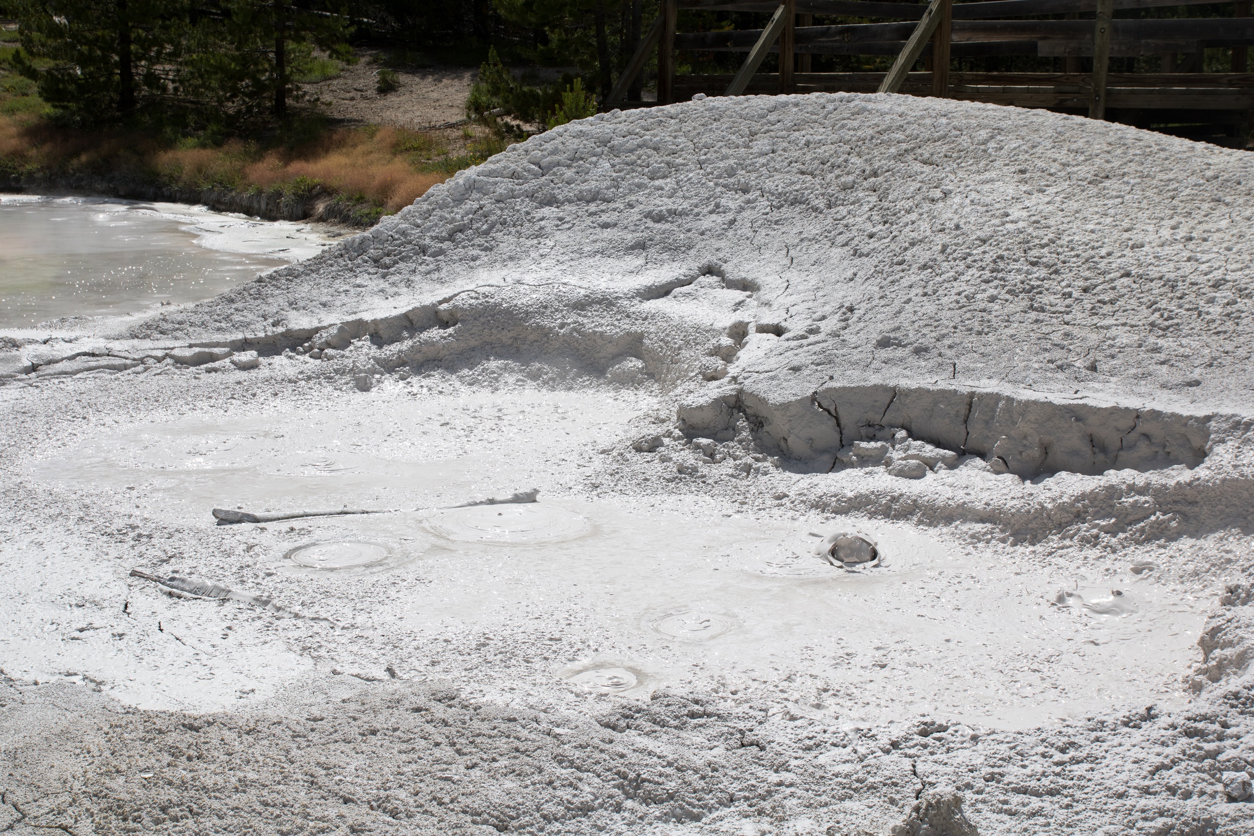 Entre deux zones de chantier et trois bisons, sur le bord de la route, une pancarte annonce Artists Paintpots. Avec un nom pareil, on opte immédiatement pour un détour. Principalement connu pour ses mud pots, le secteur est traversé par un petit sentier d’à peine un kilomètre où les chipmunks gambadent autour de mini bassins bouillonnants. On en fait cependant vite le tour, un peu déçu après avoir observé longuement le secteur de Norris.