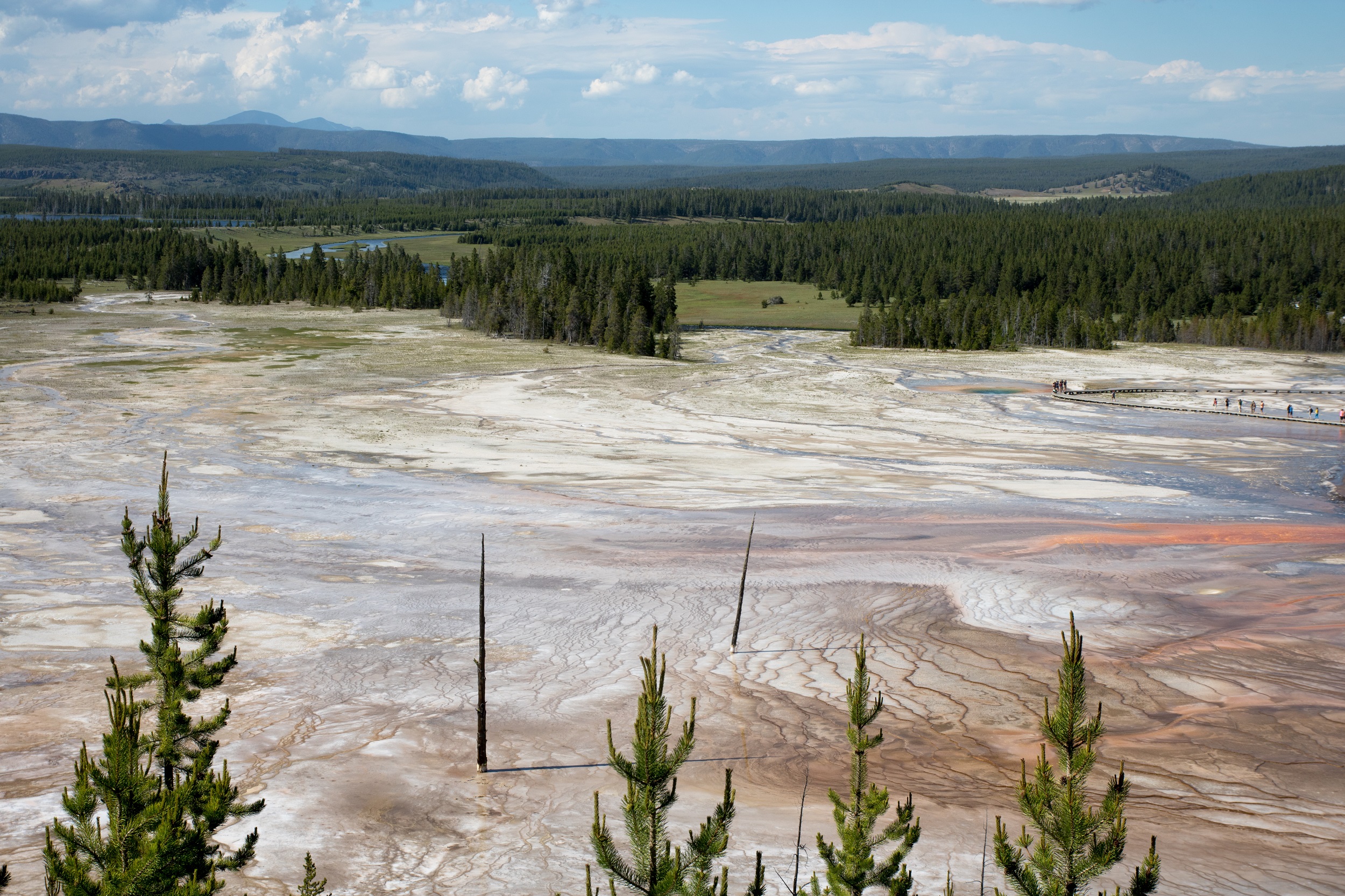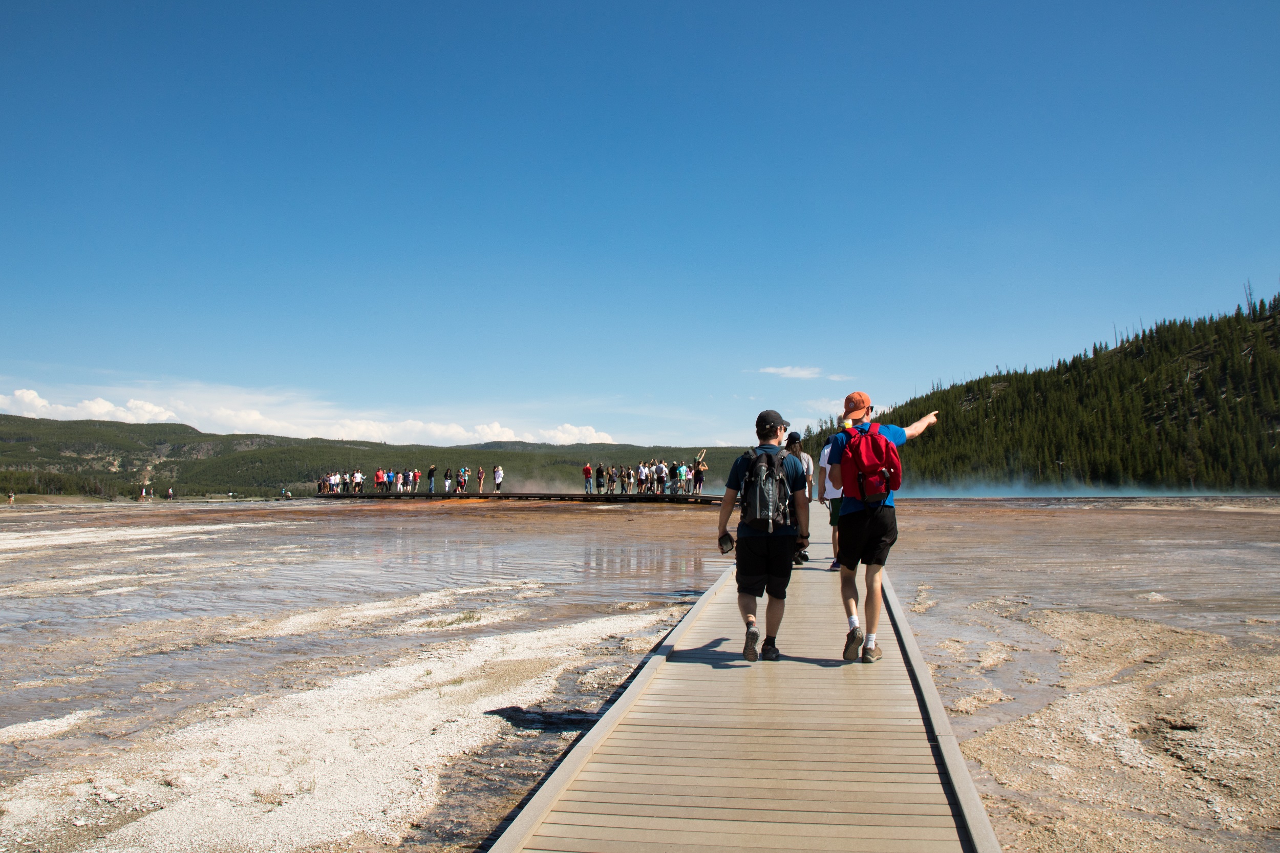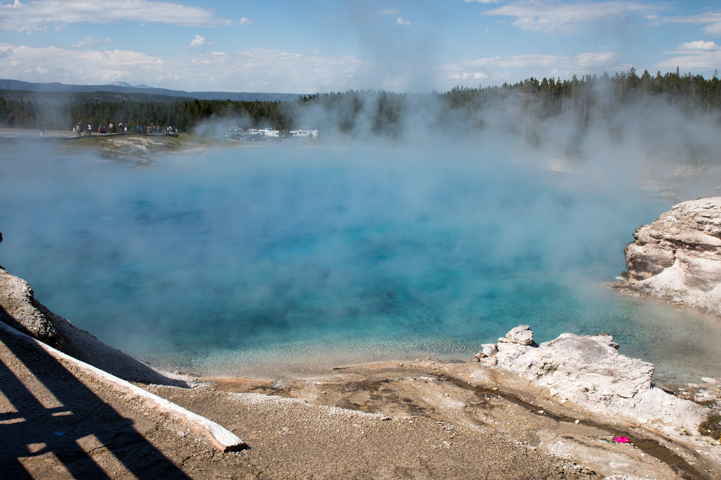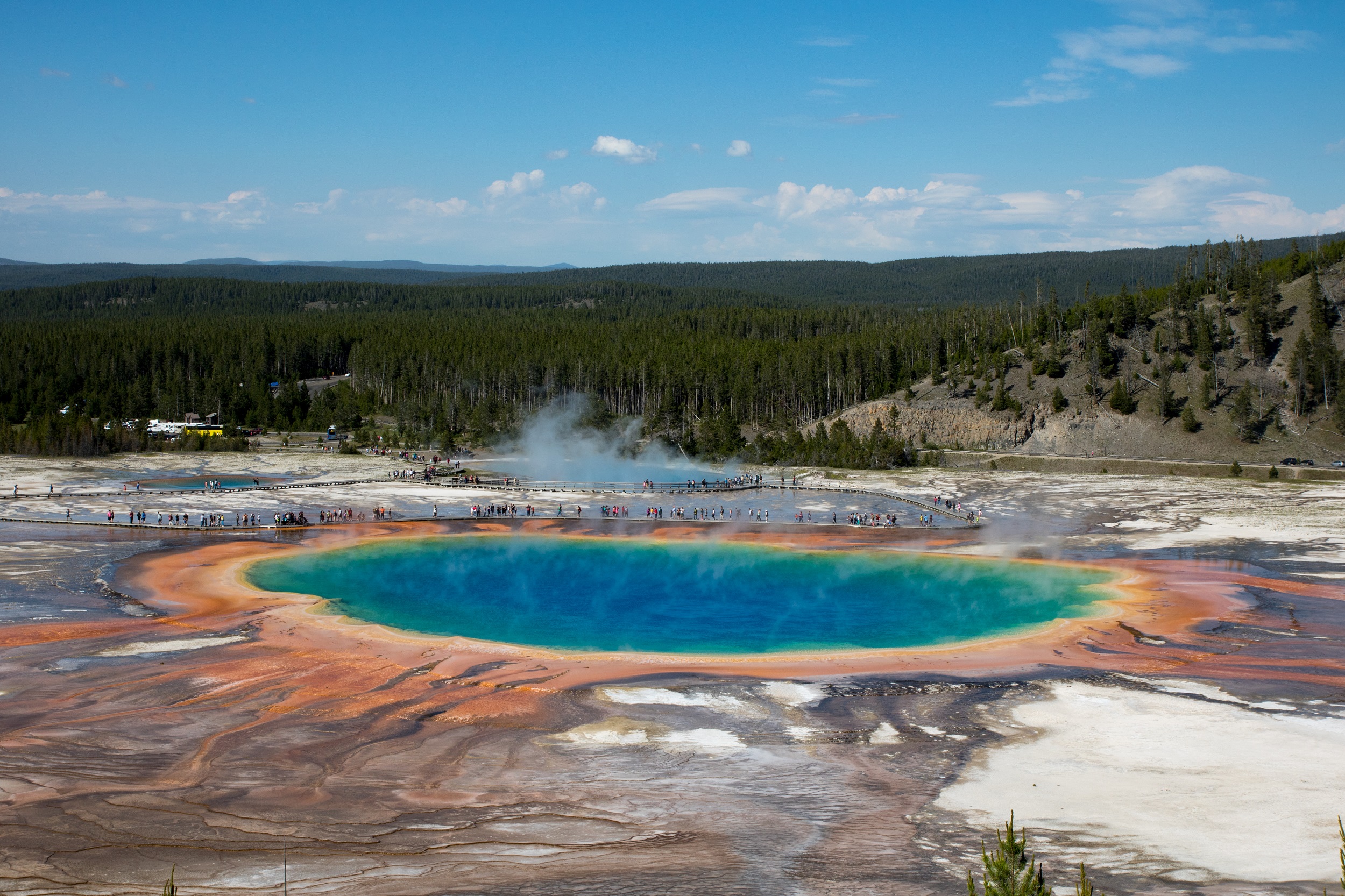 La foule qui s’accumulent le long de la chaussée et la file de voiture à l’arrêt (voire garées n’importe où) nous indique l’approche de notre dernière étape, icône des photographes et emblème des États Unis. Le Grand Prismatic est une merveille de couleurs et de curiosité. Ce gigantesque bassin d’eau multicolore, de plus de 100 mètres de diamètre, impressionne. Bleu, vert, orange ou rouge sont données par des organismes thermophiles: plus le milieu est chaud, plus le bleu est présent. Une fumée bleue grime vers le ciel, des vagues de chaleur balayent les visages et de sournois courants d’air font décoller nombre de casquettes au bord du géant. On l’observe d’abord depuis le sol avant de se diriger vers le parking voisin. De là, un sentier grimpe doucement dans la foret afin d’offrir un peu de hauteur aux visiteurs mais, même arrivés au sommet, on réalise difficilement l’ampleur du décor.