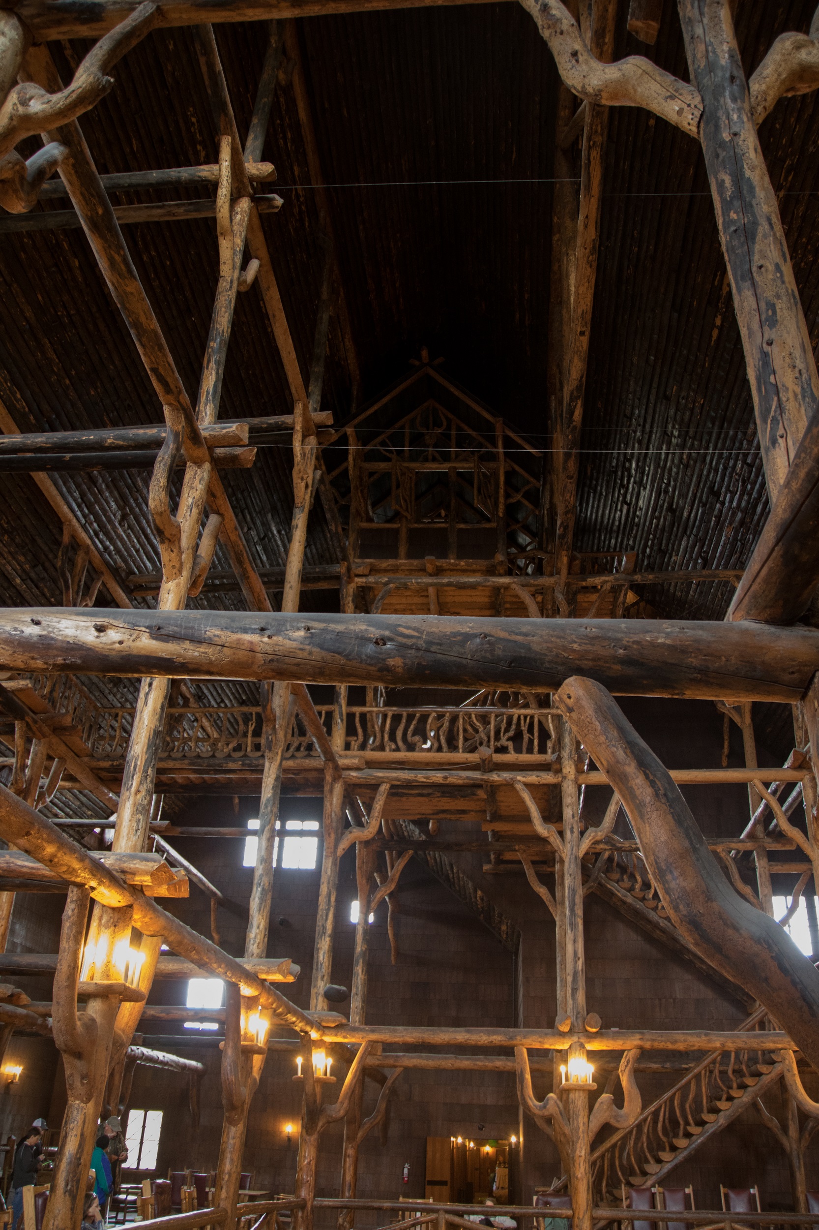 Le parc s’éveille sous un temps terrible, grisonnant et humide. Le visitor center proche du Old Faithful Geyser abrite une foule de visiteurs emmitouflés dans diverses épaisseurs surmontées de Kway détrempés. En attendant l’éruption , on prend le temps de le visiter ainsi que le grand hôtel voisin, Old Faithful Inn, tout de bois, de pierre et de lumière. Aux alentours, le sol fume dans toutes les directions et semble former de nouveaux nuages.