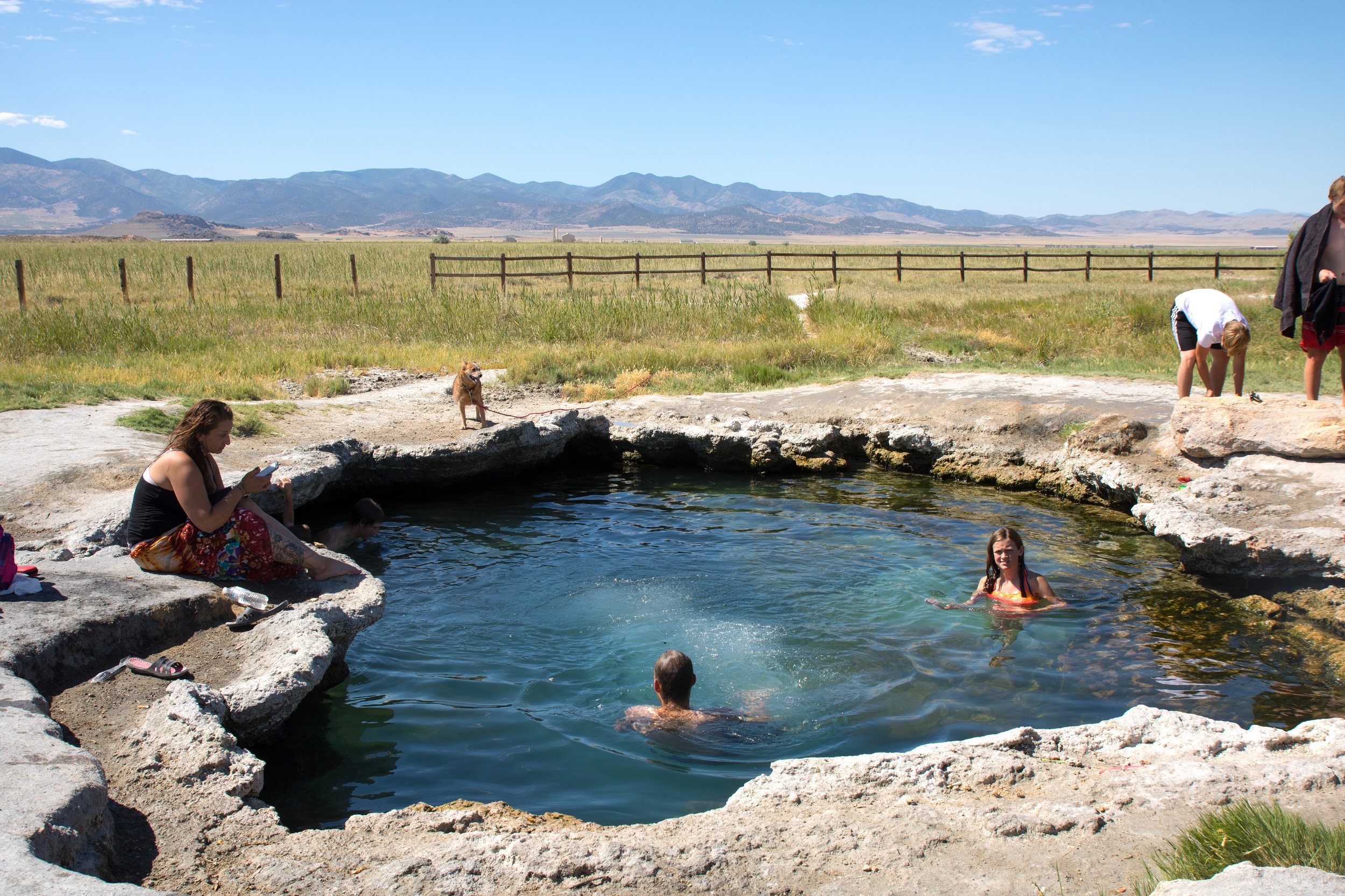 Dans une campagne verdoyante, on emprunte des routes où nous sommes les seuls voyageurs. Notre petit SUV tangue sur un dernier chemin tout cabossé et plein de poussière qui nous indique l’arrivée. Perdue dans des champs d’herbes hautes, dans un carré de terre et de sable, Meadow Hot Spring accueille déjà deux familles. Des gamins sautent dans l’eau profonde, d’autres plongent pour observer le fond. On s’installe sur les bords de ce bassin naturel à peine aménagé, lunettes sur le nez, baignant dans une eau aussi chaude que celle d’un jacuzzi. Une petite fille nous apporte des fleurs pour s’excuser de nous avoir éclaboussé avant de quitter les lieux avec sa tribu. L’endroit est calme, sans bruit, loin de tout. On y reste un bon moment, profitant de cette atmosphère paisible avant de quitter l’eau à regret pour reprendre notre chemin.