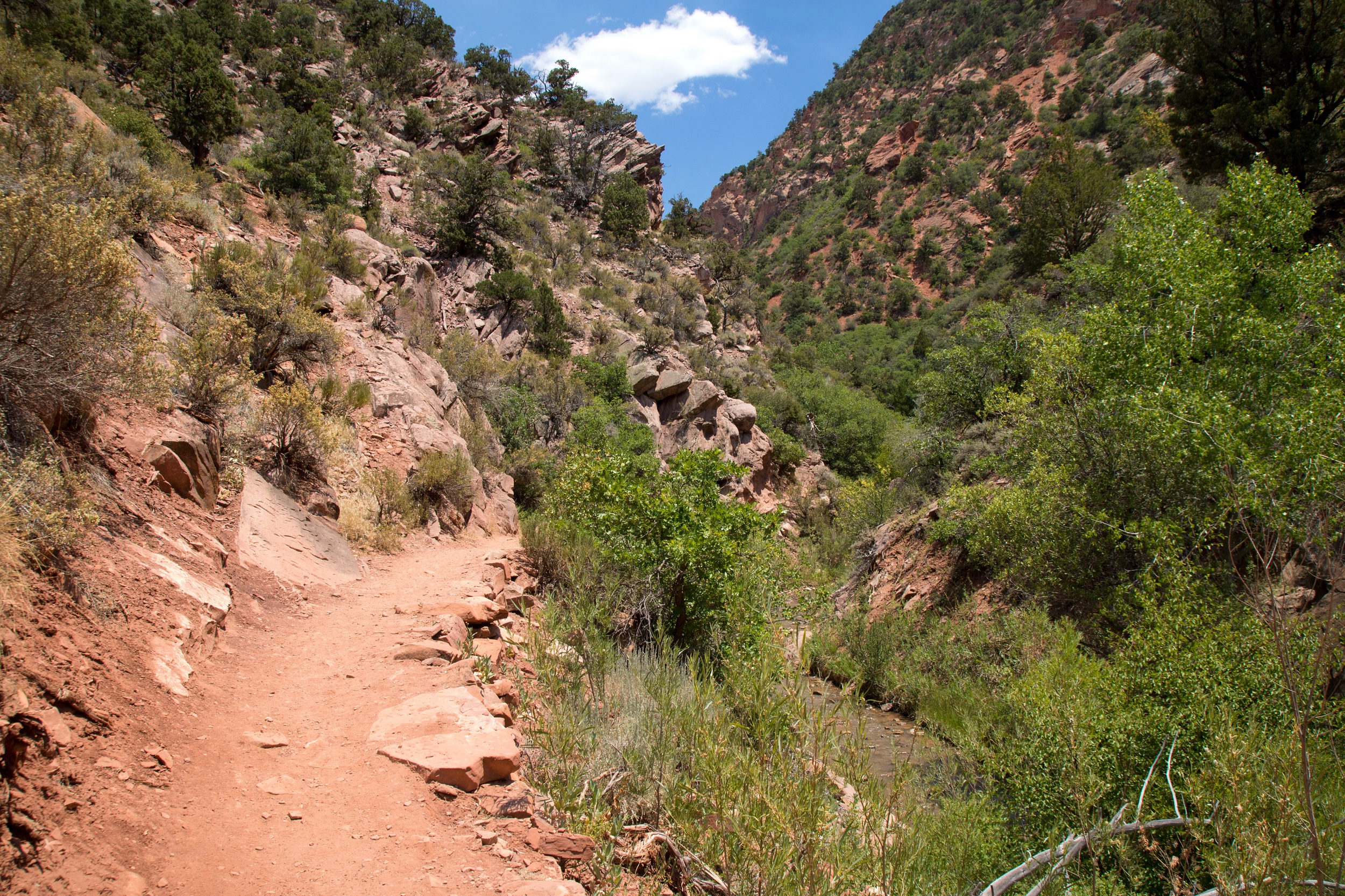 Les randonneurs de tout âge sont pourtant relativement nombreux à s’engager dans le chemin de terre sous un soleil de plomb. Les premiers kilomètres n’ont rien de très original, on avance doucement sur un sentier sans grand dénivelé au milieu des arbres et de poussière rose. Un changement de décor s’annonce aux première notes du clapotis de l’eau en contre bas où Kanarra prend des allures d’oasis. Désormais, on marche directement dans l’eau claire de la rivière. Quelques pierres roulent sous nos pieds et l’eau fraîche est particulièrement bienvenue.