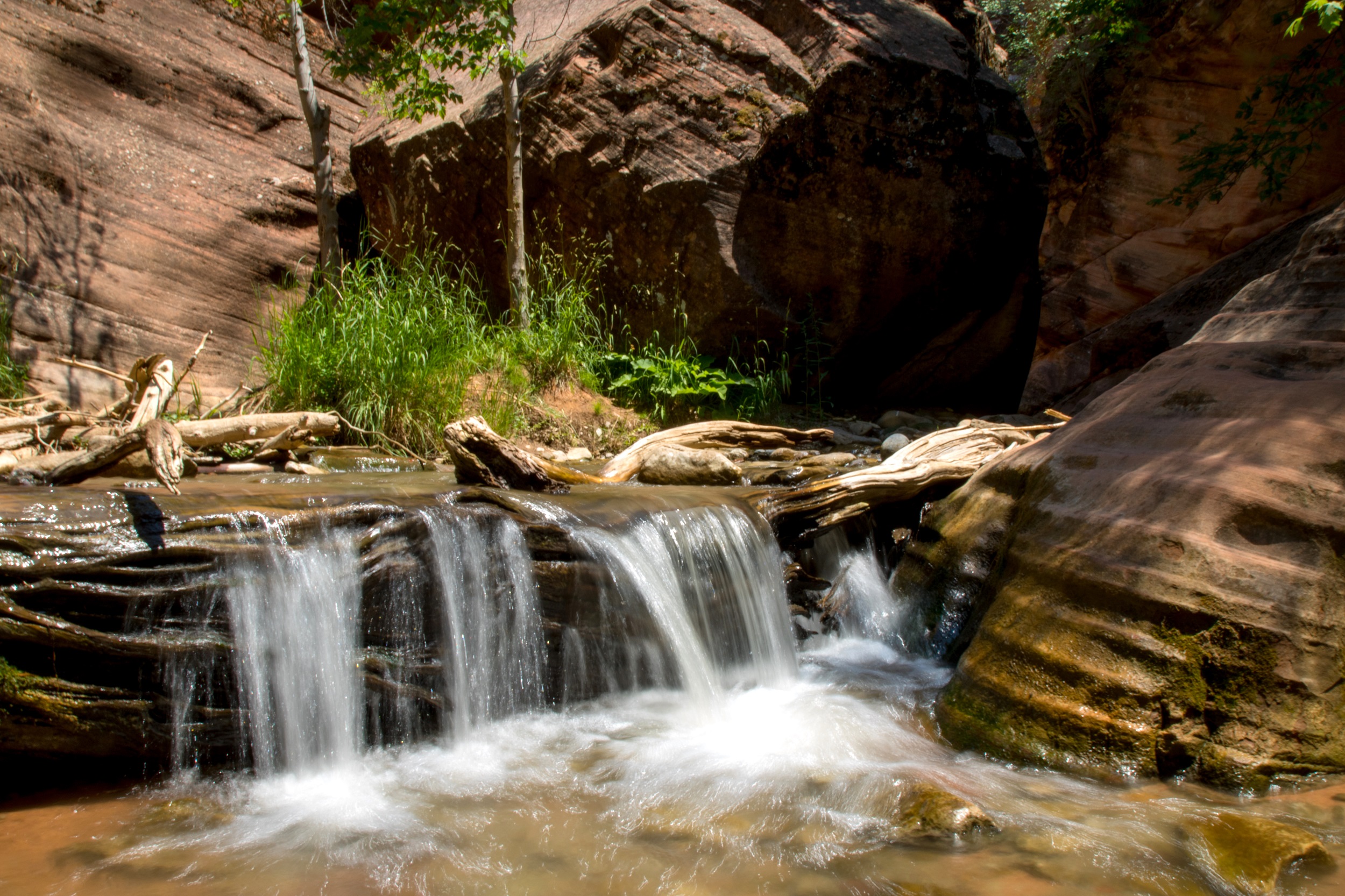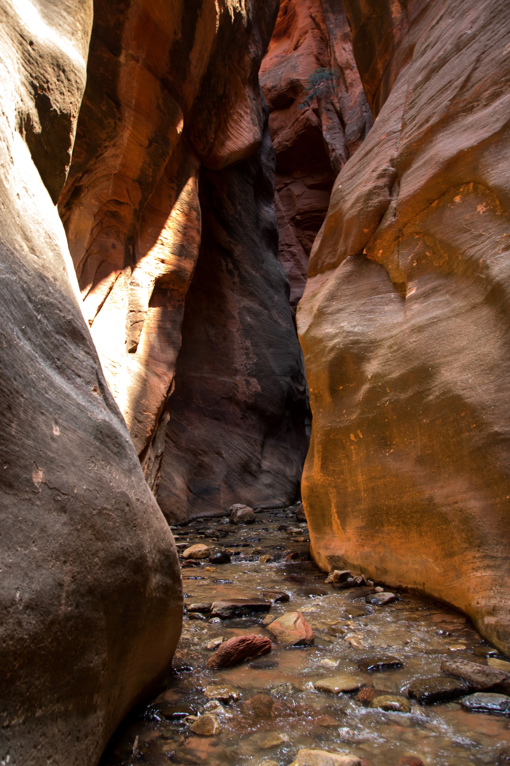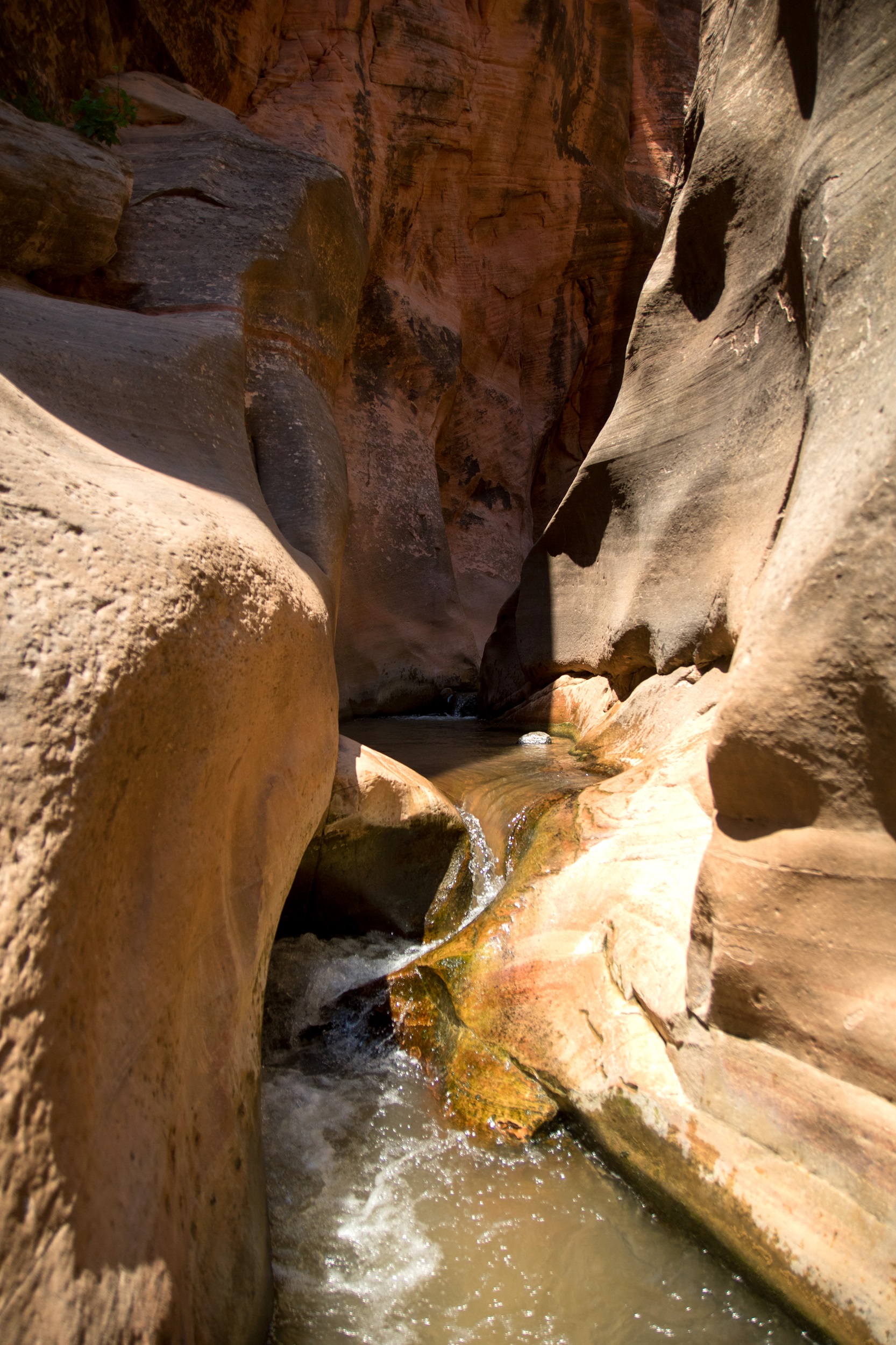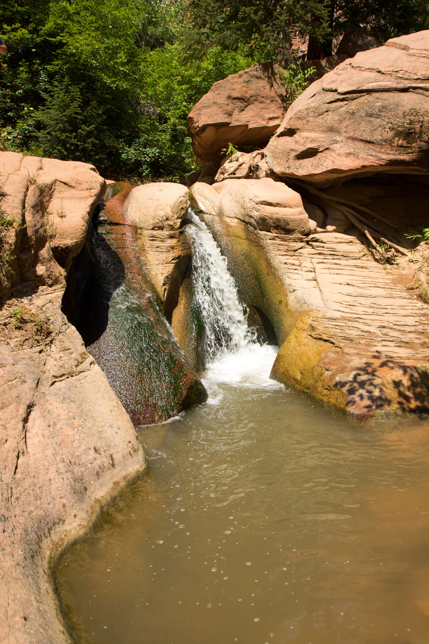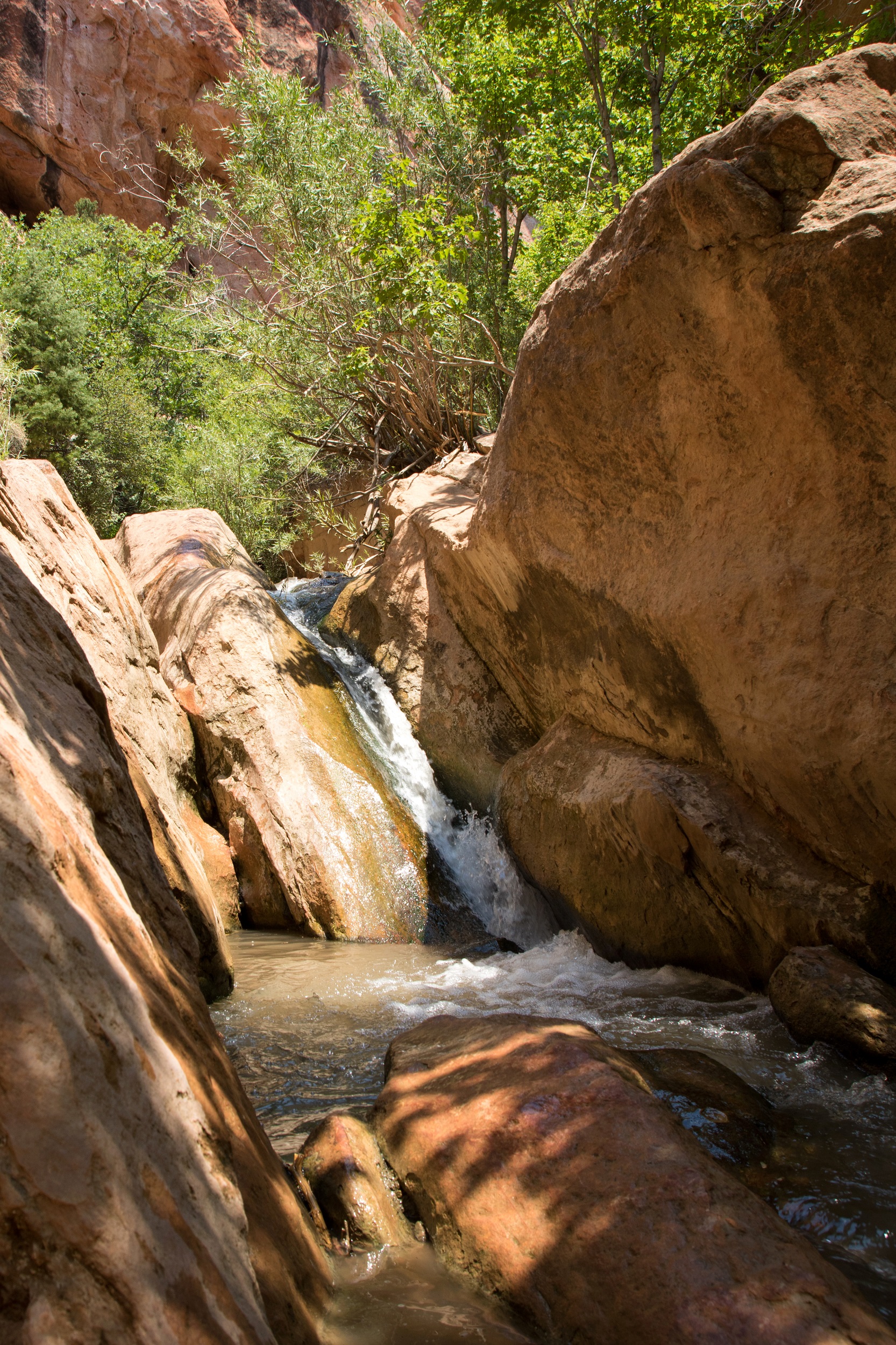 Le premier obstacle franchit, la randonné se poursuit dans un secteur plein de lumière. La chaleur des rayons du soleil et la fraicheur de l’eau sur la peau sont un vrai bonheur. L’espace de quelques minutes, les autres randonneurs ont disparu. On s’installe alors un moment pour se baigner dans de petits bassins accessibles par des toboggans naturels. Arrivés à la seconde cascade, la solidité de l’échelle nous fait douter: un tronc d’arbre, plus léger, est installé contre la falaise mais seuls trois échelons, dont deux vacillants, ont été posés dessus. Inquiets de ne pas pouvoir redescendre sans se blesser, on finit par se résigner à faire demi tour, comme tous nos voisins subitement réapparus. Le retour est plus calme, plus doux aussi, le soleil s’étant enfin décidé à nous laisser un peu de répit. Trempés mais ravis du périple, nous regagnons le motel d’Hurricane pour une bonne nuit de sommeil. Demain, l’immense Zion nous attend.