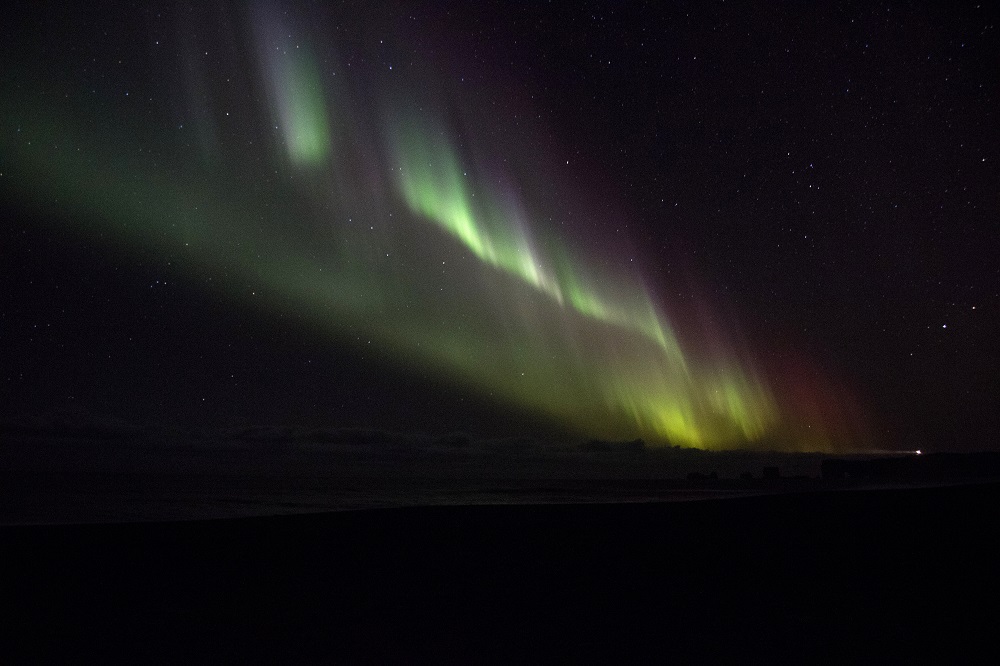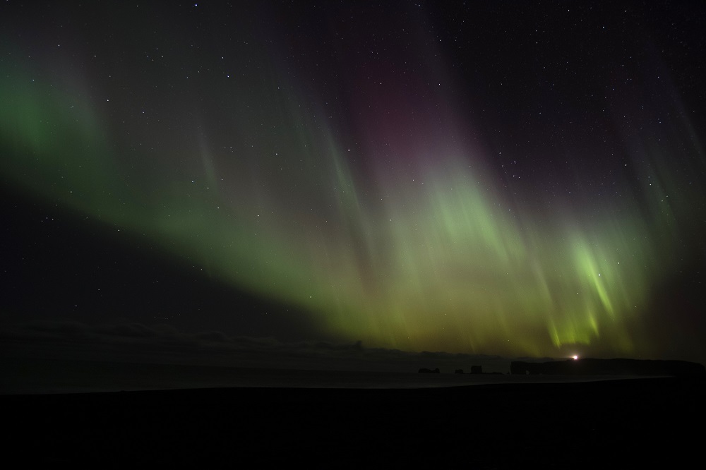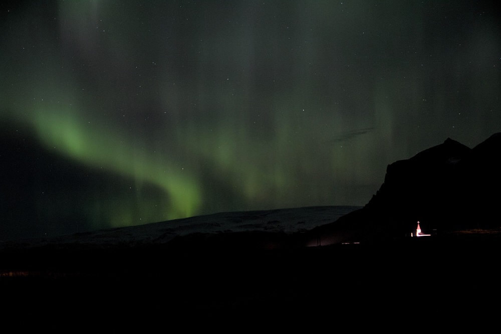 Avec une excitation similaire à celle d’un enfant de cinq ans découvrant Disneyland, on remet nos nombreuses couches anti froid et on part sur les routes noires à la recherche d’un lieu isolé. La plage de Reynisfjara survolée lors de la tempête n’étant qu’à quelques kilomètres, on opte rapidement pour cette voie. A notre arrivée, le ciel se colore déjà de douces lumières vertes diffuses. On s’équipe plus vite que jamais avant de s’installer sur la plage de sable sombre. A l’est, le phare de Dyrholaey balaie la nuit noire mais ne suffit pas à éclairer la plage. Si la mer semble tranquille et le bruit des vagues rassurant, on reste tout de même à proximité du parking pour ne pas se faire surprendre dans l’obscurité. Une grande trainée verte fend soudain le ciel tel un arc en ciel. Le spectacle commence.