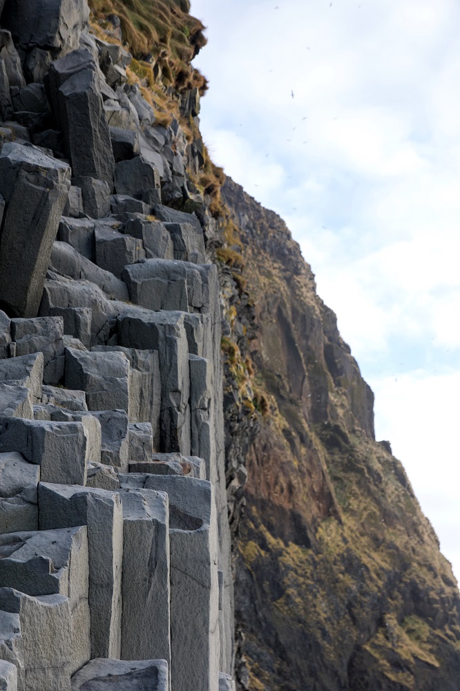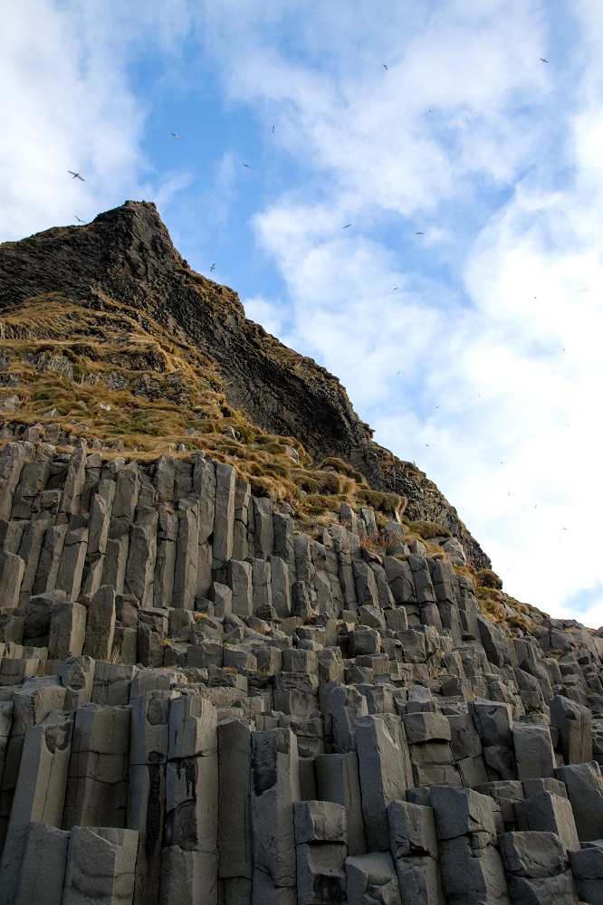 Au réveil, Reynisfjara nous appelle à nouveau. La météo semble clémente et la mer relativement tranquille, on tente à nouveau notre chance. Il y a foule ce matin-là mais la plage est dégagée. Les falaises baignées de soleil se découvre enfin et des nuées de centaines d’oiseaux planent au-dessus de nos têtes. On découvre finalement l’étendue des colonnes de basaltes qui s’élèvent sur des dizaines de mètres au-dessus d’une grotte sombre. Au loin, les falaises de Dyrholaey ont cessé d’être battues par les flots et on découvre seulement la fameuse arche.