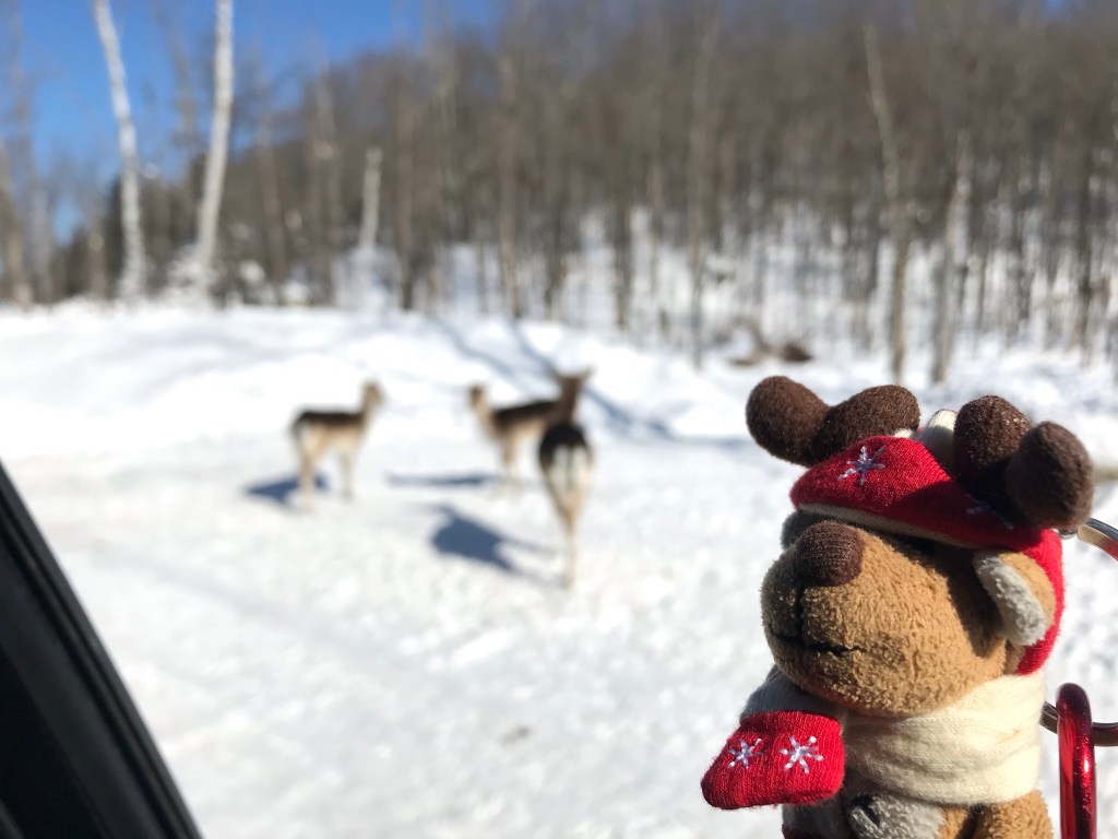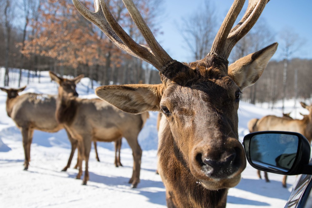 Les premiers kilomètres se font au milieu des troupeaux de cerfs et de wapitis en recherche de carottes qui sont distribuées par les visiteurs et vendues par le parc. Il faut bien admettre que l’expérience provoque une régression immédiate. En quelques minutes, on a 5 ans, le nez collé à la vitre ou la tête carrément passée par la fenêtre, de larges sourires sur le visage à chaque grand coup de langue des cervidés. D’aussi près, on réalise la masse que représentent les wapitis, on observe les immenses bois des grands mâles et on sourit devant les museaux parfois plein de neige.