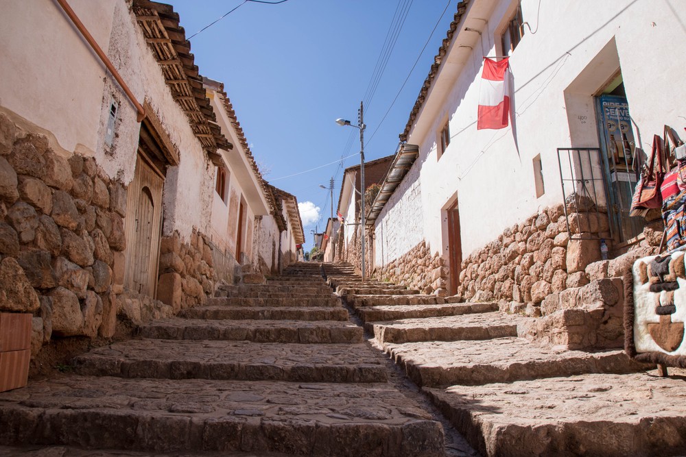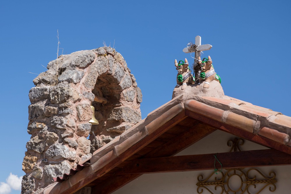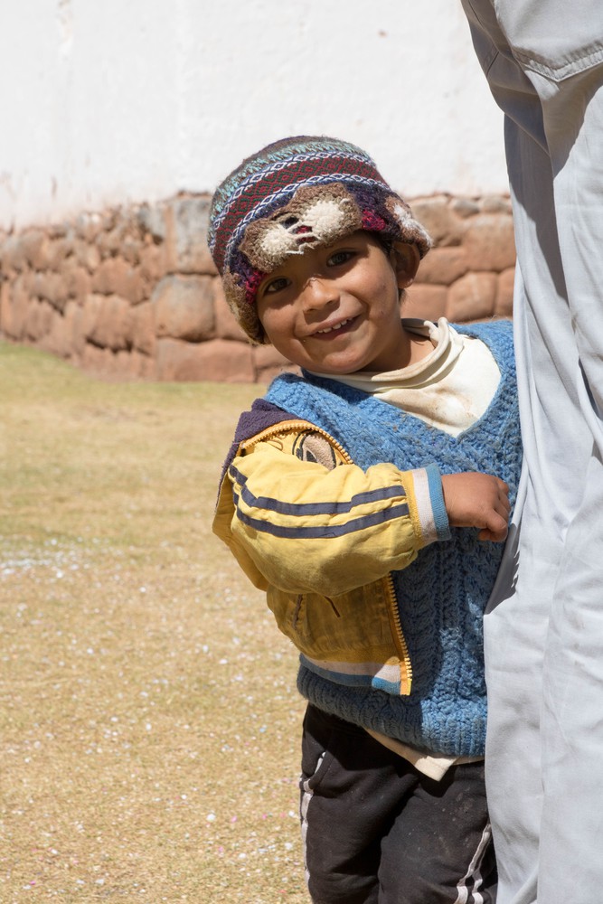 En dehors des ateliers de tissage, le village est plein de charme. Il fait bon y trainer au hasard en profitant du calme de ses rues pavées. Devant l’église coloniale, une grande étendue d’herbe donnant sur des cultures en terrasse abrite vendeurs de textiles, fileuses de laine et ateliers de tri des papas, les pommes de terre. La place est bordée de maisons blanches au socle de pierres. Au loin, d’immenses pics enneigés se fondent dans le ciel bleu… Alors qu’on observait sagement ce superbe décor, une petite frimousse malicieuse est venue courir dans nos jambes, visiblement ravie de jouer à cache-cache dans les pattes de nos grandes perches !