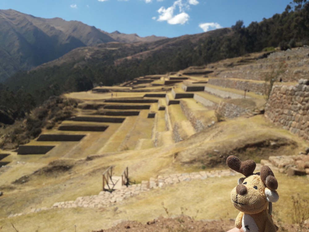 On grimpe jusqu’au sommet de la forteresse, et grimper est vraiment le mot, jusqu’au temple du soleil avant de rejoindre les cultures en terrasse par un chemin surplombant le vide. La plupart des touristes s’arrêtent à l’escalier et nous sommes quasiment seuls dans les terrasses.