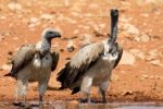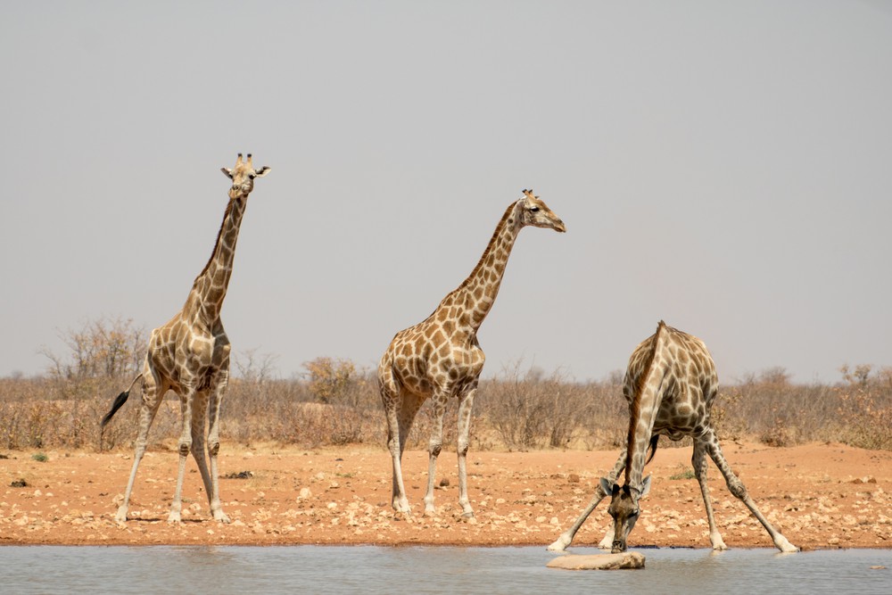 Le long de la route, on aperçoit plusieurs girafes semblant se diriger, comme nous, vers le Dolomietpunt Waterhole. On gare la voiture, on coupe les moteurs et on observe, seulement accompagnés d’une autre voiture encore plus sale que la nôtre. Elles arrivent, doucement, l’une après l’autre. Ce sont 6 girafes qui viendront jusqu’au bord de l’eau. Pattes écartées, elles baissent leur énorme tête jusqu’à provoquer des rides à la surface. D’impressionnants vautours arrivent à leur tour, tournant longuement dans le ciel avant d’atterrir, les uns après les autres, dans un bruyant battement d’aile. On reste un long moment sur les bords du point d’eau, amusés par les interactions entre les espèces, charmés par la grâce des girafes.