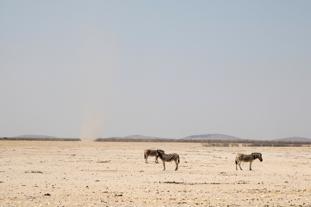 La route poussiéreuse s’enfonce plus loin encore dans le parc. A l’est, une immense plaine asséchée est parcourue de petites tornades de sables qui s’élèvent dans le ciel et disparaissent presque aussitôt. Seuls les zèbres semblent encore apprécier l’endroit. Le premier camp apparait finalement au bout d’un long moment.