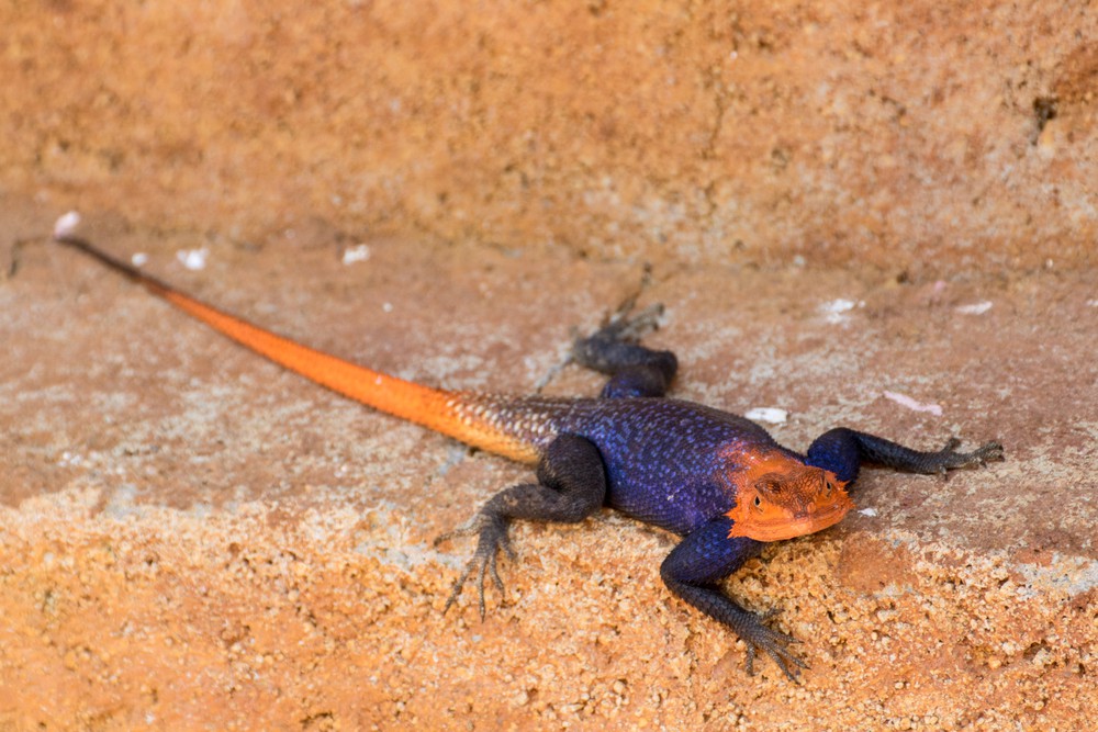 L’agame des Rochers (Agama agama) mâle est bigaré tandis que la femelle est d’un vert olive tacheté. Le matin, il prend un bain de soleil qui ravive ses couleurs.