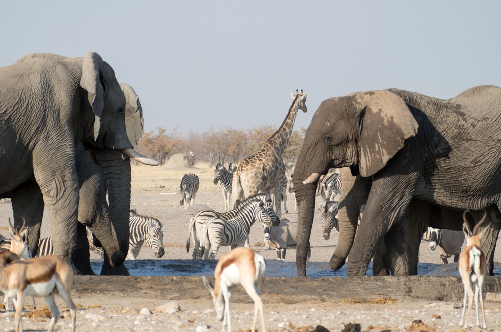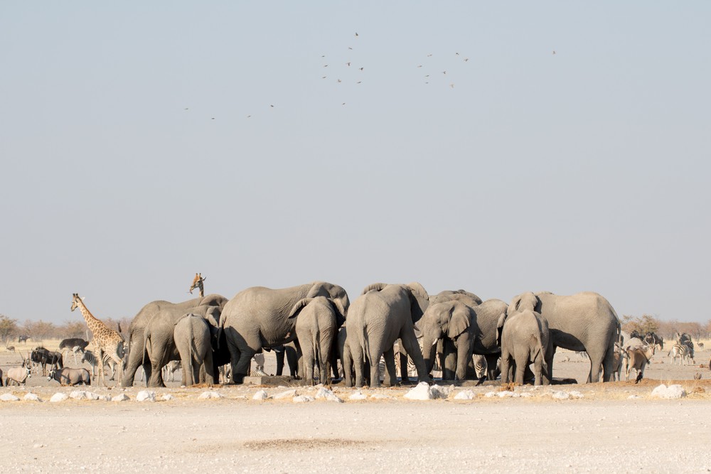 L’endroit est incroyable. Là encore, on est absolument seuls… du moins les seuls humains. Un troupeau d’éléphants squatte le point d’eau, buvant bruyamment. Quelques girafes sont également là, attendant leur tour au milieu de dizaines de zèbres, d’oryx, de gnous, d’autruches, de springboks. Il y a là une faune incroyable, bruyante, mouvante. Les zèbres s’agitent, piaffent au passage d’un petit chacal. Un peu plus loin, deux éléphants s’affrontent du regard, grognant en agitant trompes et oreilles. D’un coup, la savane grouille de vie.