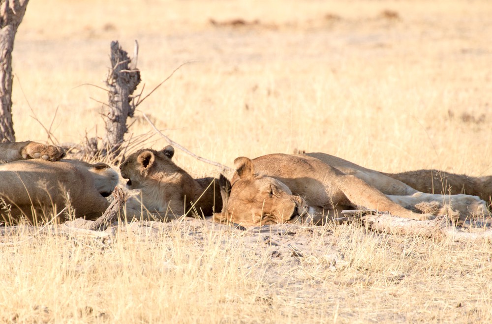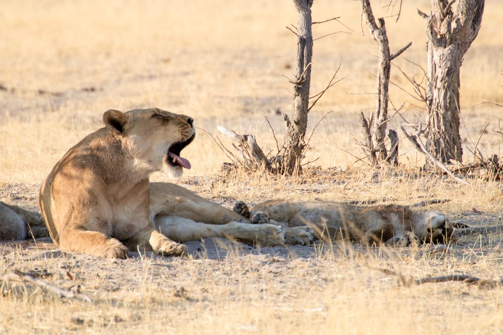 En repartant, on rencontre à l’ombre des arbres une famille de lions en pleine sieste. Mâles, femelles et petits sont groupés les uns contre les autres, les plus actifs se contentant d’observer le point d’eau d’un œil distrait. On les observe avec amusement se rouler sur le dos, bailler à s’en décrocher la mâchoire ou se laisser tomber sur le côté, frappés d’une incroyable flemme. D’énormes sourires traversent nos visages : on a vu des lions !