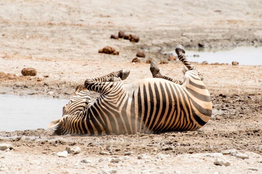 Sur les premiers kilomètres, on rencontre de nombreux zèbres, errant à la file indienne dans la poussière. Ils nous observent du coin de l’œil, à peine dérangés, nous offrant parfois ce bruit si caractéristique ou de jolies roulades sur le dos. Ces zèbres sont différents des zèbres des montagnes rencontrés dans le Damaraland. Leurs rayures sont plus larges, se rejoignent sous le ventre mais ont aussi des couleurs plus variées : des rayures grises se dessinent entre les blanches et les noires. Les petits sont adorables, tout frêles avec leur crinière épaisse.
