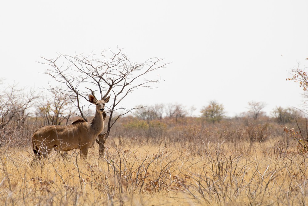 Peu à peu, quelques oryx et springboks se joignent à la fête. Ils traversent la voie les uns derrière les autres sans un regard, guidés par leur instinct à travers la savane. Dans les herbes hautes quelques koudous se laissent surprendre, suivis de leurs petits qui bondissent dans les buissons à notre passage, leur petite queue blanche fouettant les airs.