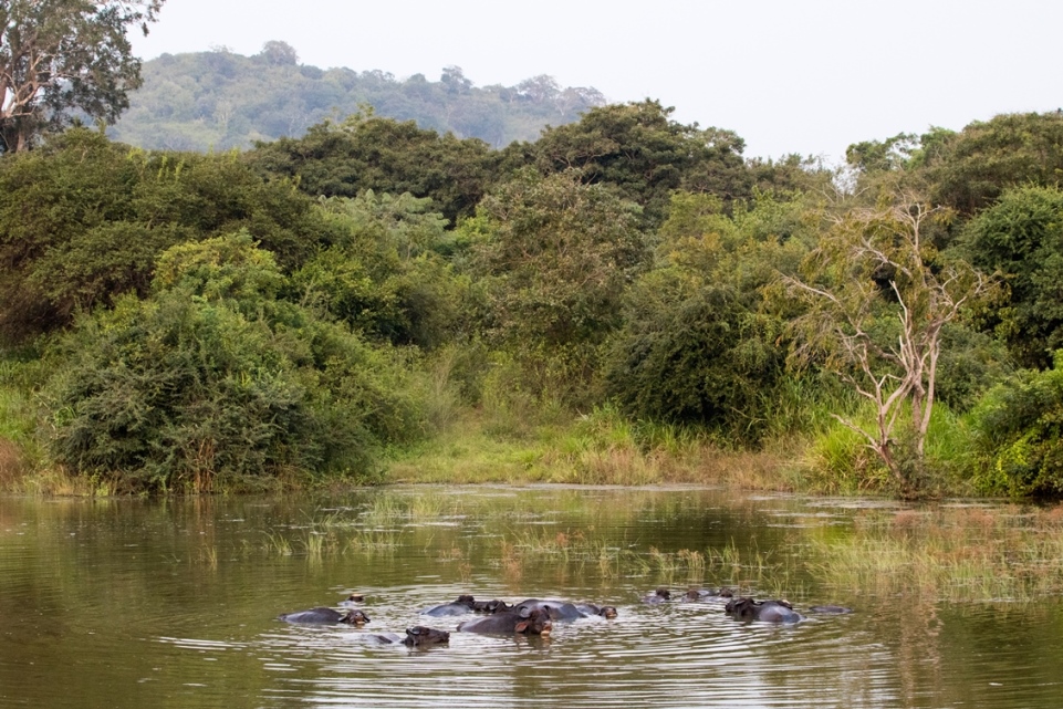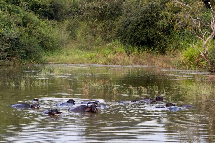 Avant de rentrer, on nous emmène sur un point de vue en hauteur pour observer le parc. A grand renfort de jumelles, on repère des tâches sombres dans une étendue d’eau et on redescend rapidement pour demander un détour à notre guide avant de rentrer. Là encore, nous serons les seuls à sortir du circuit classique et on s’en félicite : arrivés sur place, c’est un troupeau de buffles sauvage que l’on découvre barbotant dans l’eau. Dans les arbres, on aura même la surprise de découvrir des calaos de Malabar à l’énorme bec.